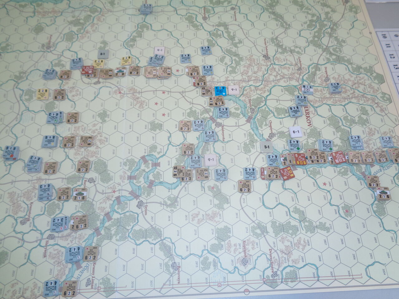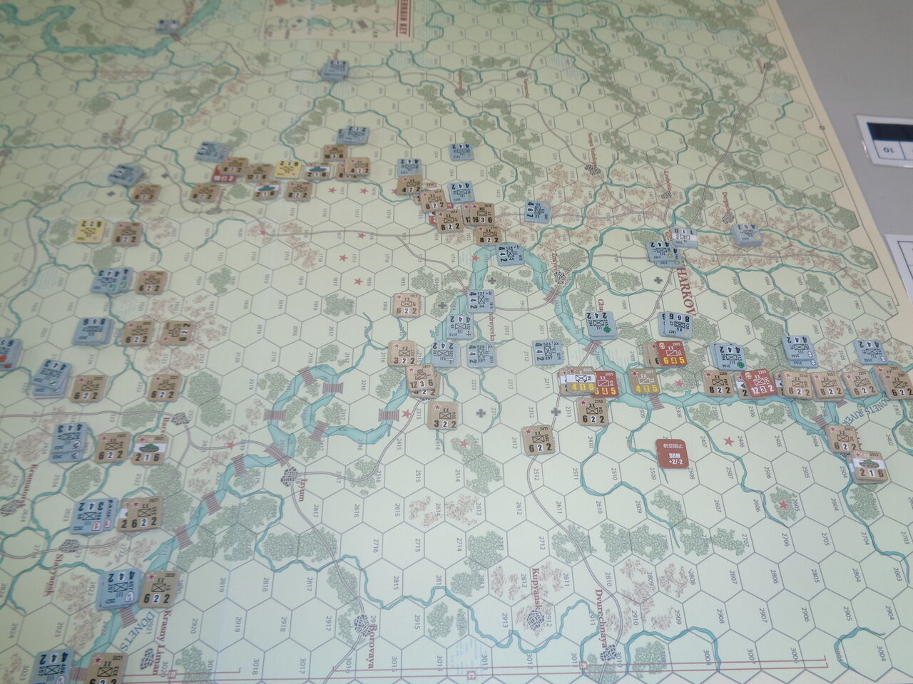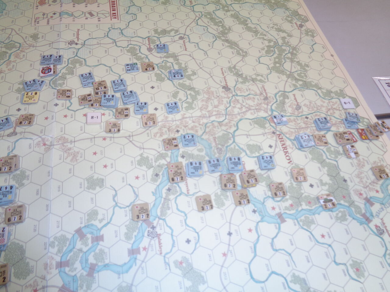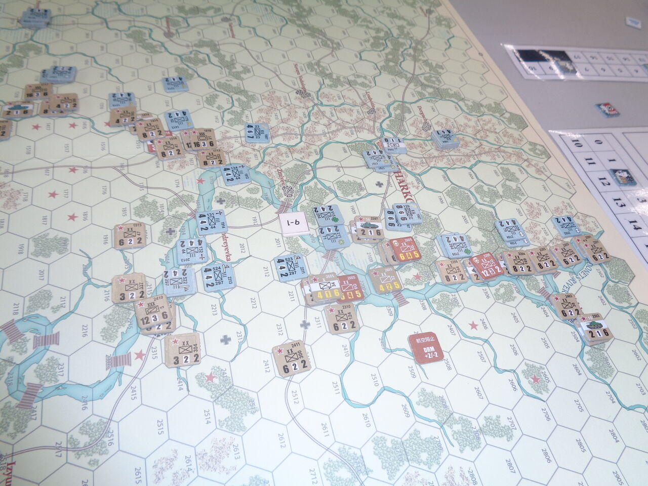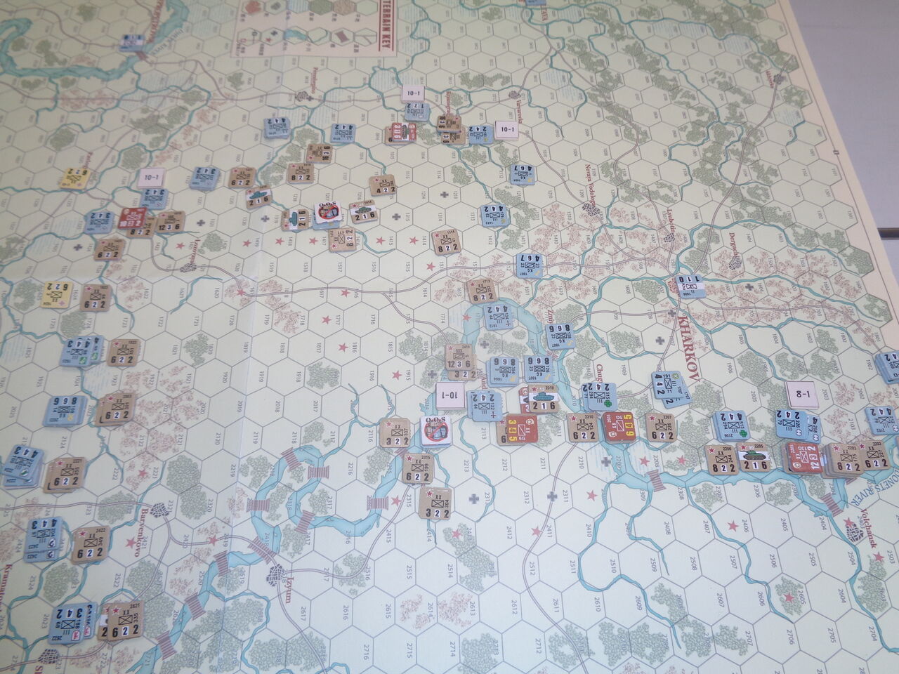 と、ここで、例会終了時間となり、時間切れ(枢軸軍有利)で終わりました。もう少しソ連軍は粘れるでしょうが、よほどのdrやチットに恵まれない限り、勝利はほぼなく、後半のどこかで、枢軸軍が寄り切る可能性が高いです。史実ではソ連軍が大敗北を喫していることを考えると、それでも健闘でしょうが・・・。