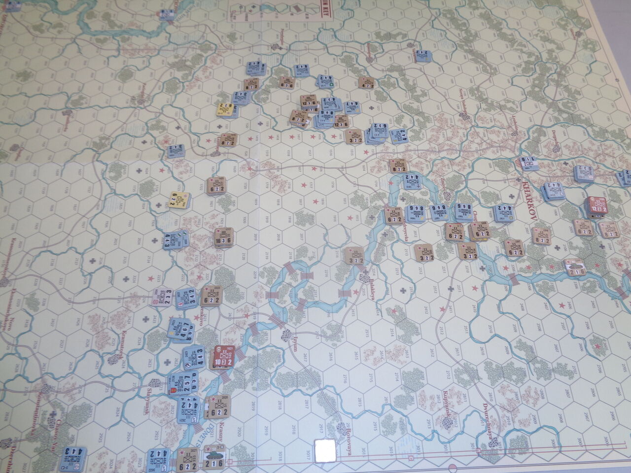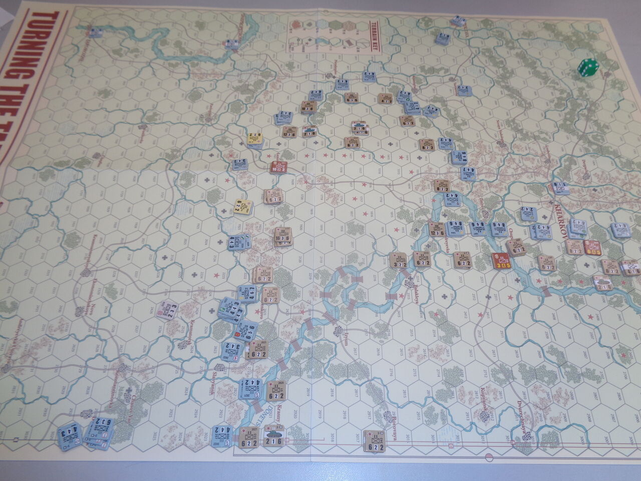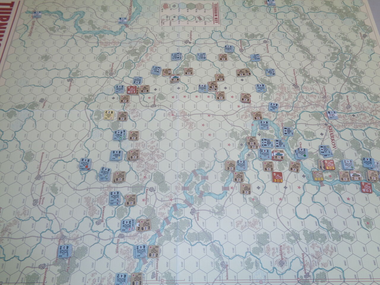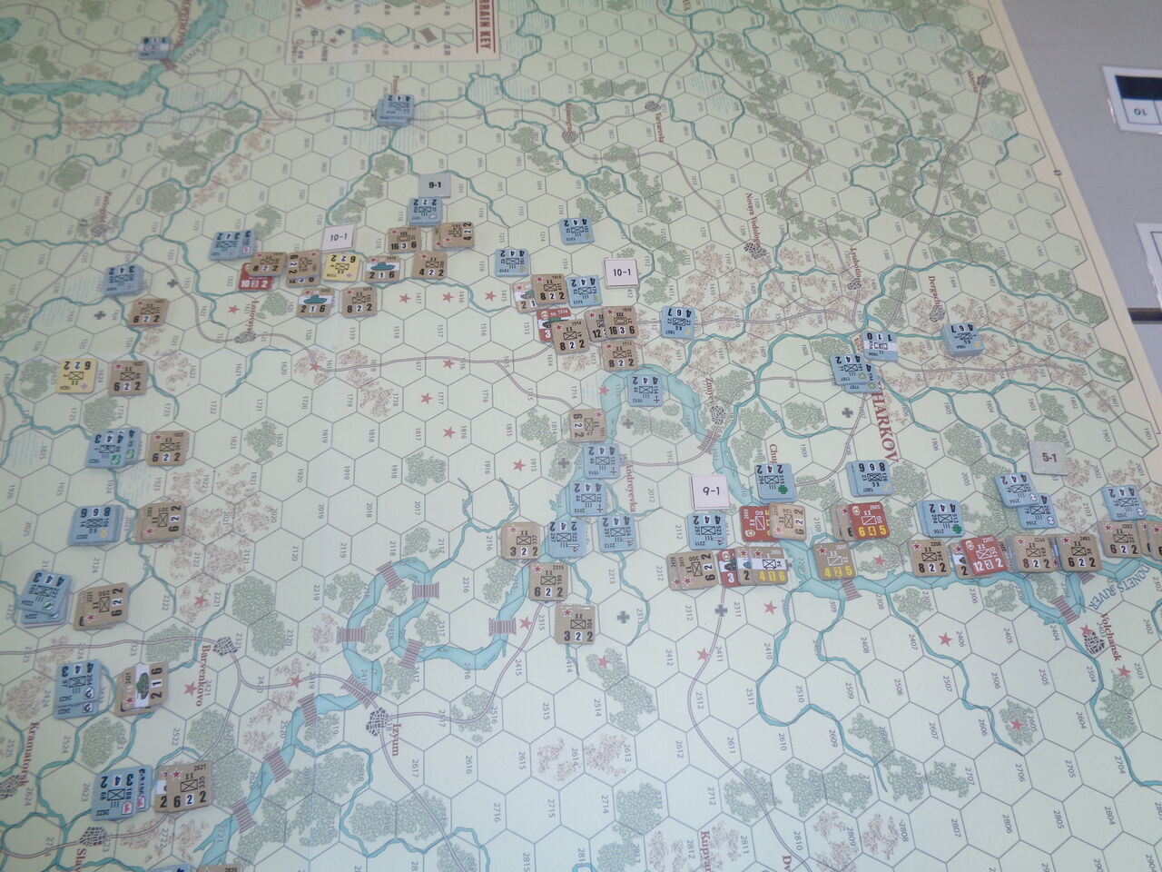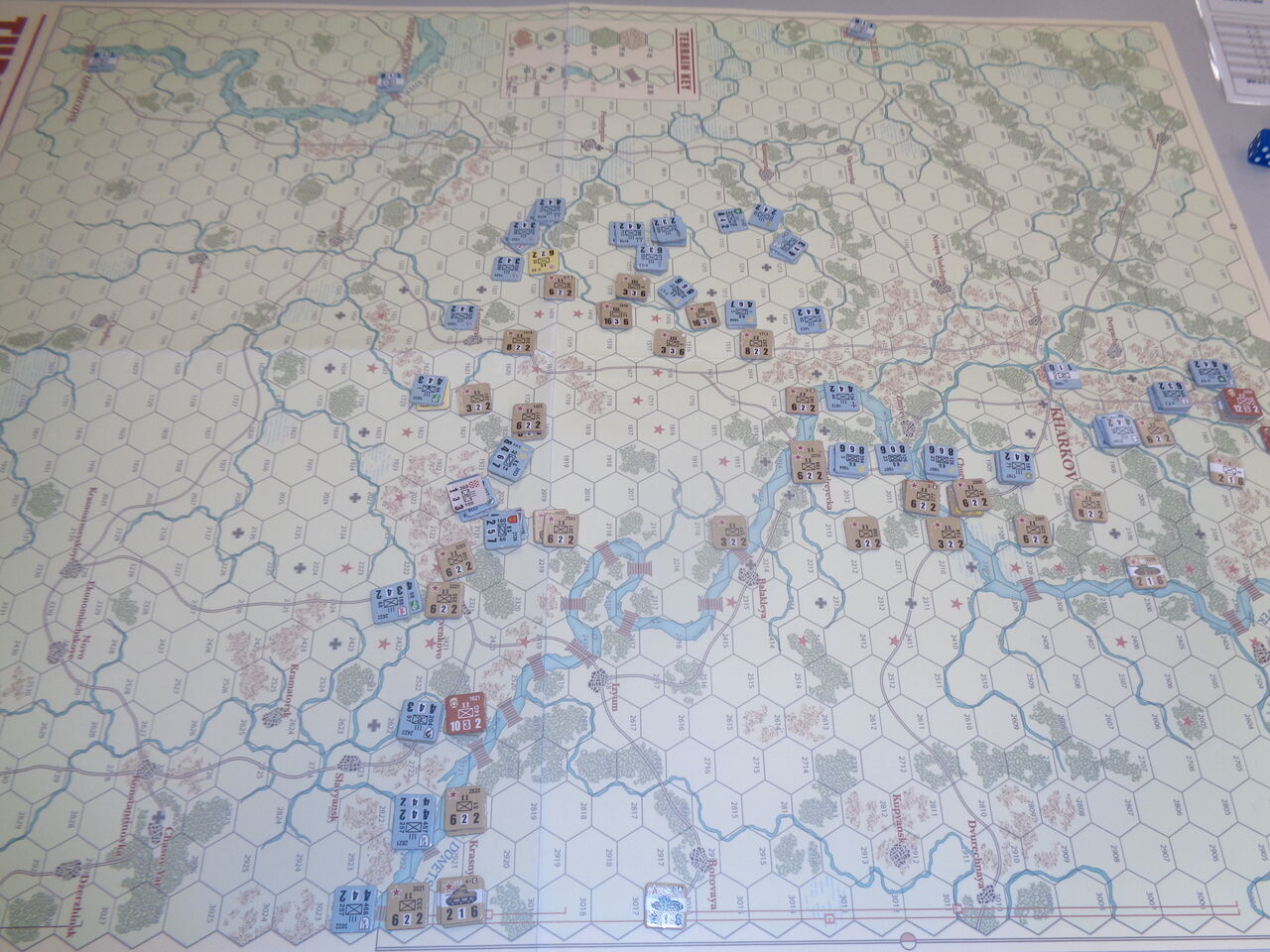 と、ここで、例会終了時間となり、時間切れ(枢軸軍有利)で終わりました。もう少しソ連軍は粘れるでしょうが、よほどのdrやチットに恵まれない限り、勝利はほぼなく、後半のどこかで、枢軸軍が寄り切る可能性が高いです。史実ではソ連軍が大敗北を喫していることを考えると、それでも健闘でしょうが・・・。