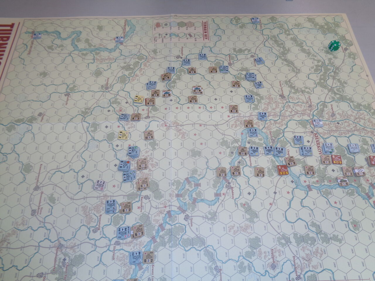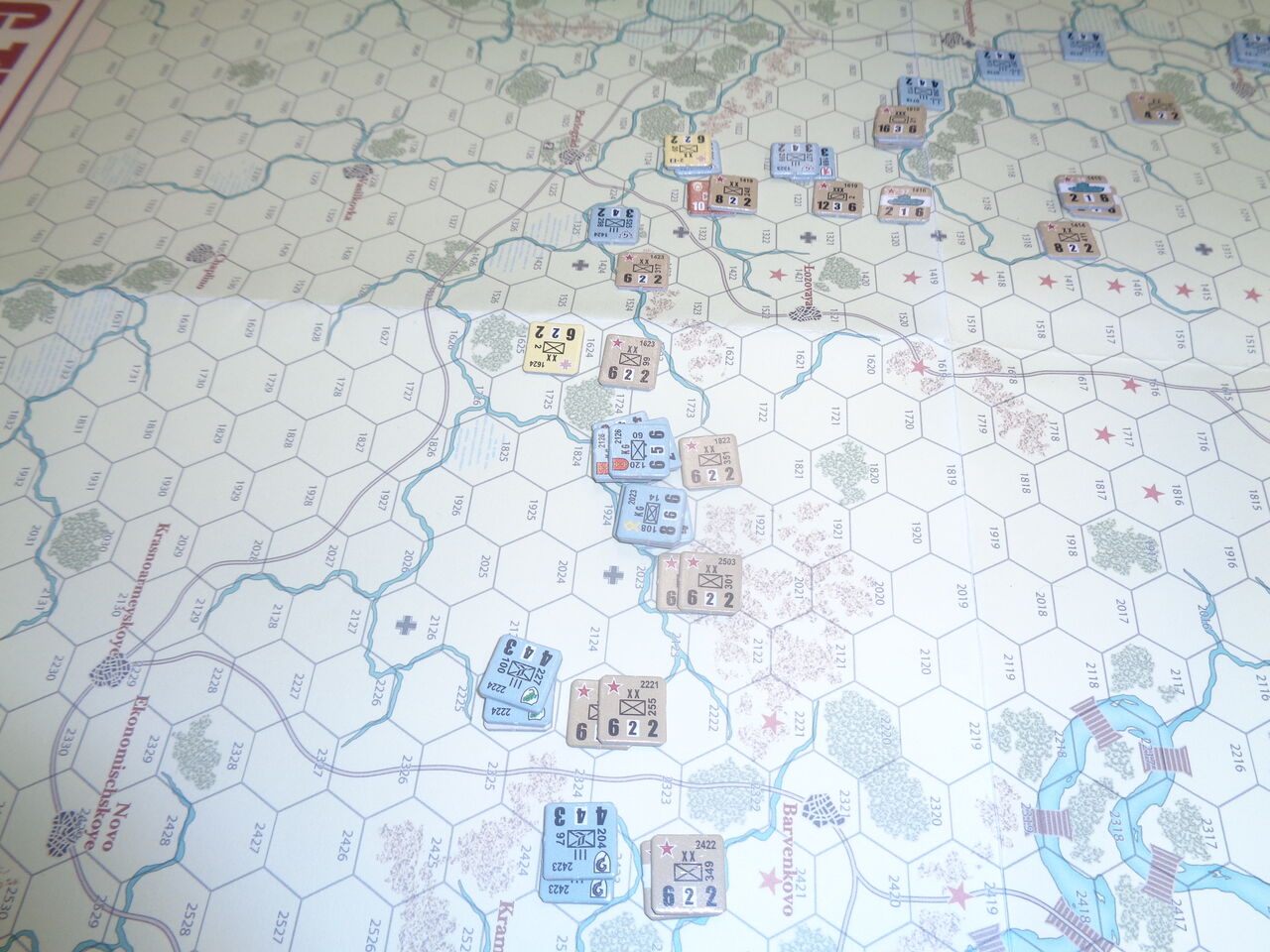 第1ターンの第1インパルス、ソ連軍はハリコフ正面から南部、バラクレイア橋頭堡、西部の6カ所で攻撃に出ます。ハリコフ正面の力押しと南部のハンガリー師団への攻撃は成功し、2ユニットを壊滅させます。が、その他の高比率攻撃はドイツ軍の戦術チットに阻まれ、1ステップの損害(または無損害)を与えるに止まります。