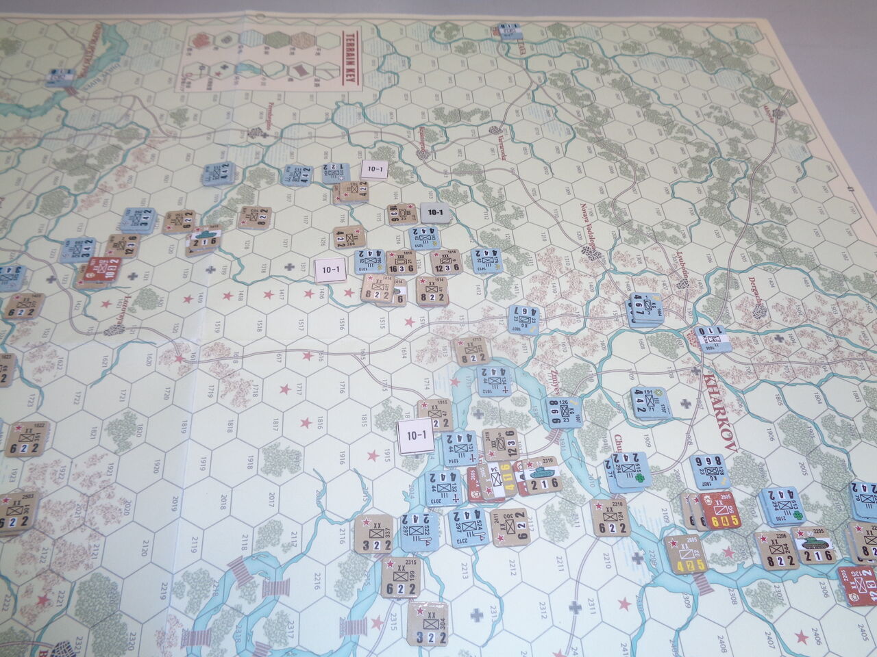 第2ターンの第1インパルス以降、ソ連軍はイニシアチブを取り戻そうと、敵装甲師団のいないハリコフ前面と西部で猛攻を加えます。3カ所で10:1攻撃をしかけ、突破口は開きましたが、敵戦力の撃滅にはほど遠く。枢軸軍は戦略移動で西部に部隊を回し、戦線の崩壊を防ぎます。