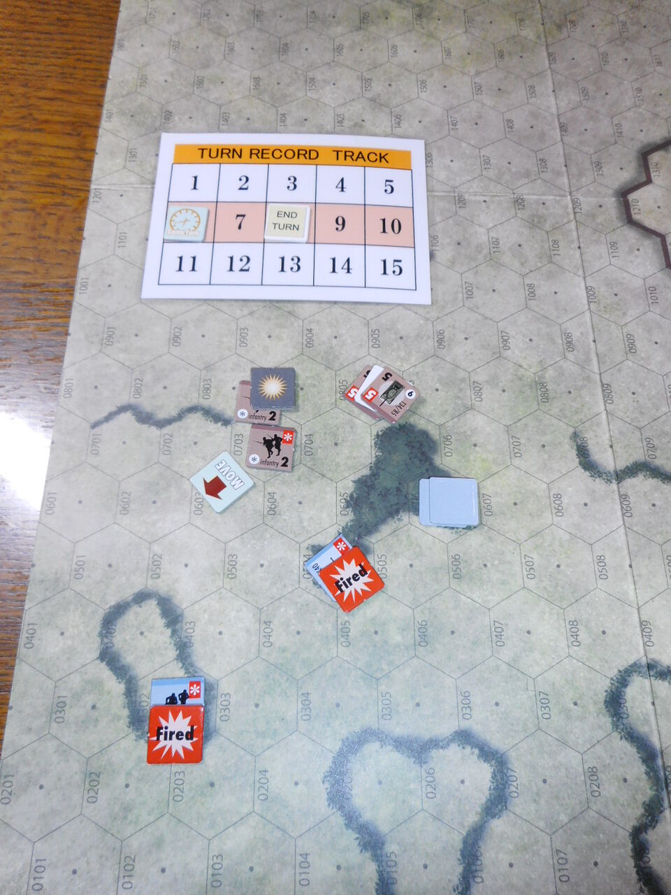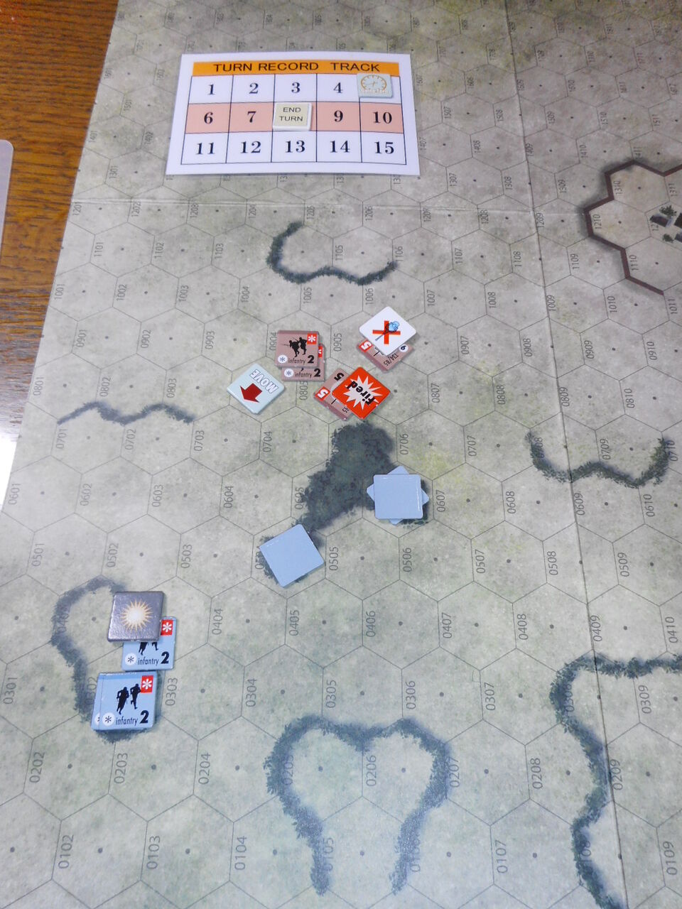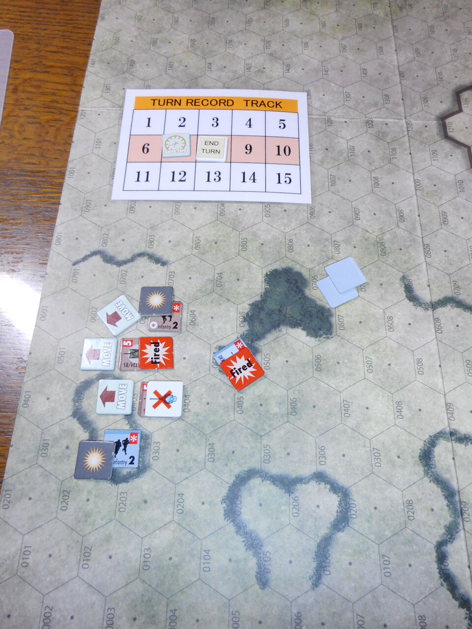 第1ターン、計画通り、タンクデサントのソ連軍が前進をしてきます。これに対し中央のPakが発砲!「2」を2回という超幸運にも恵まれ、3発目の命中弾で中央のT34/85を乗車歩兵ごと吹き飛ばします。