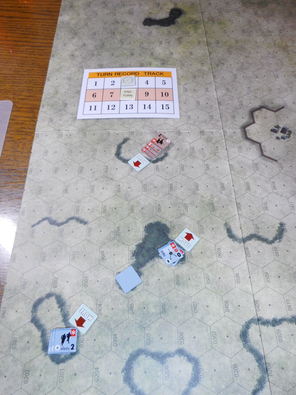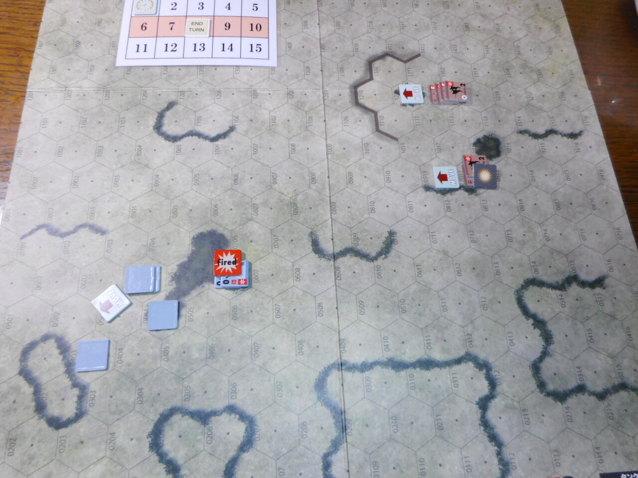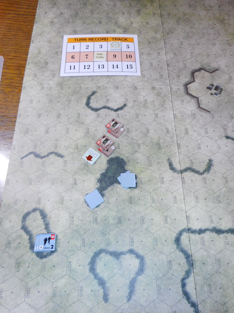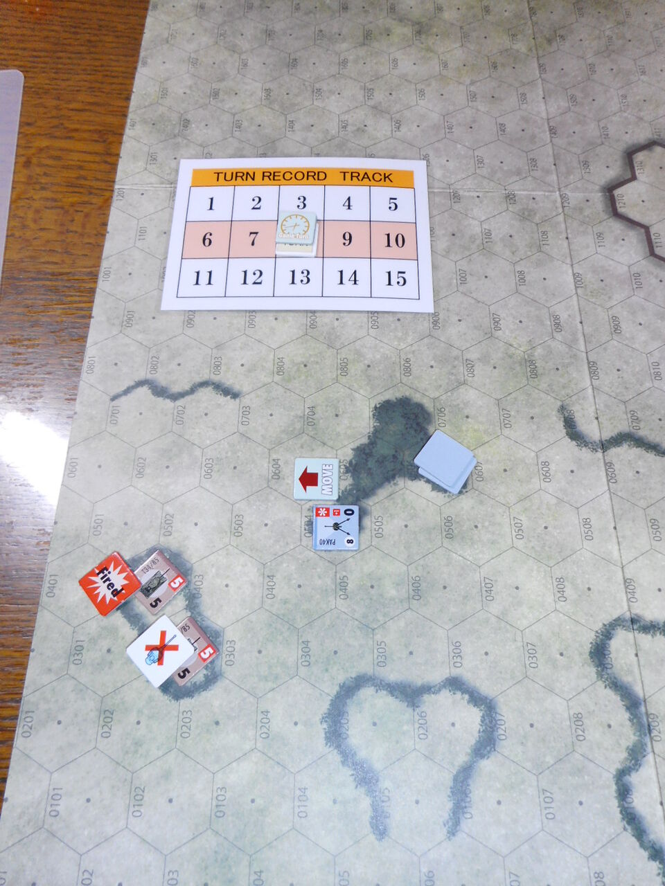 守備側のドイツ軍は3基のPak40を持ち、隠蔽ルールが適用されます。ドイツ軍は最も視界が取れる#0606にPak2門を配備し、最後の守りとして1門を#0504に配置します。対するソ連軍は、T34/85が3輛とタンクデザントが3ユニットです。