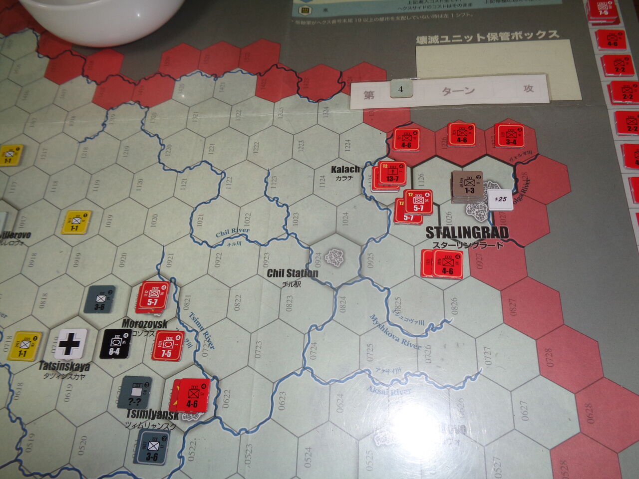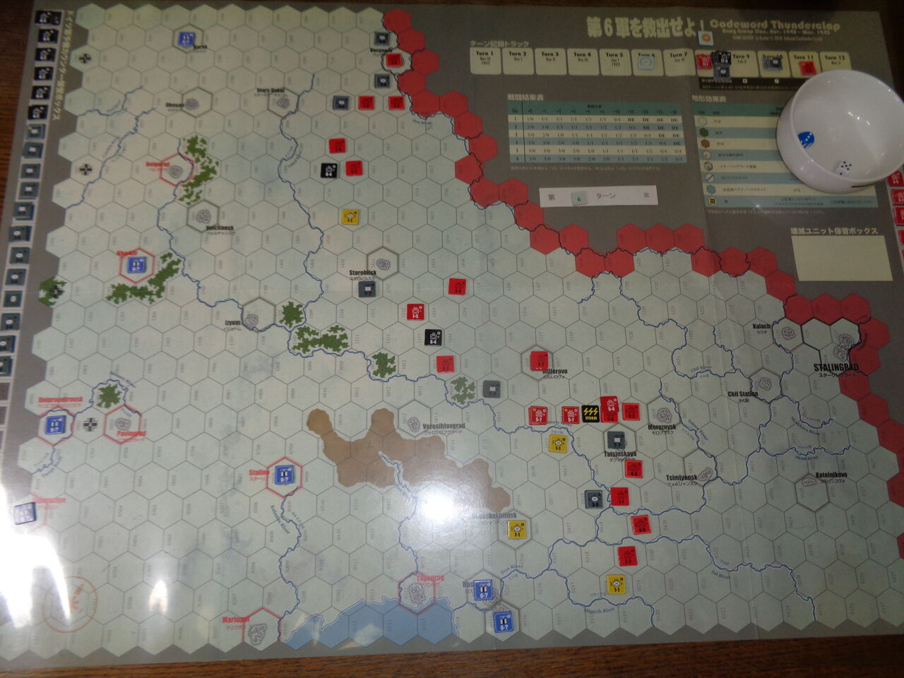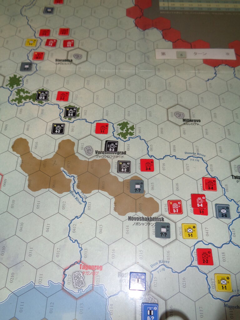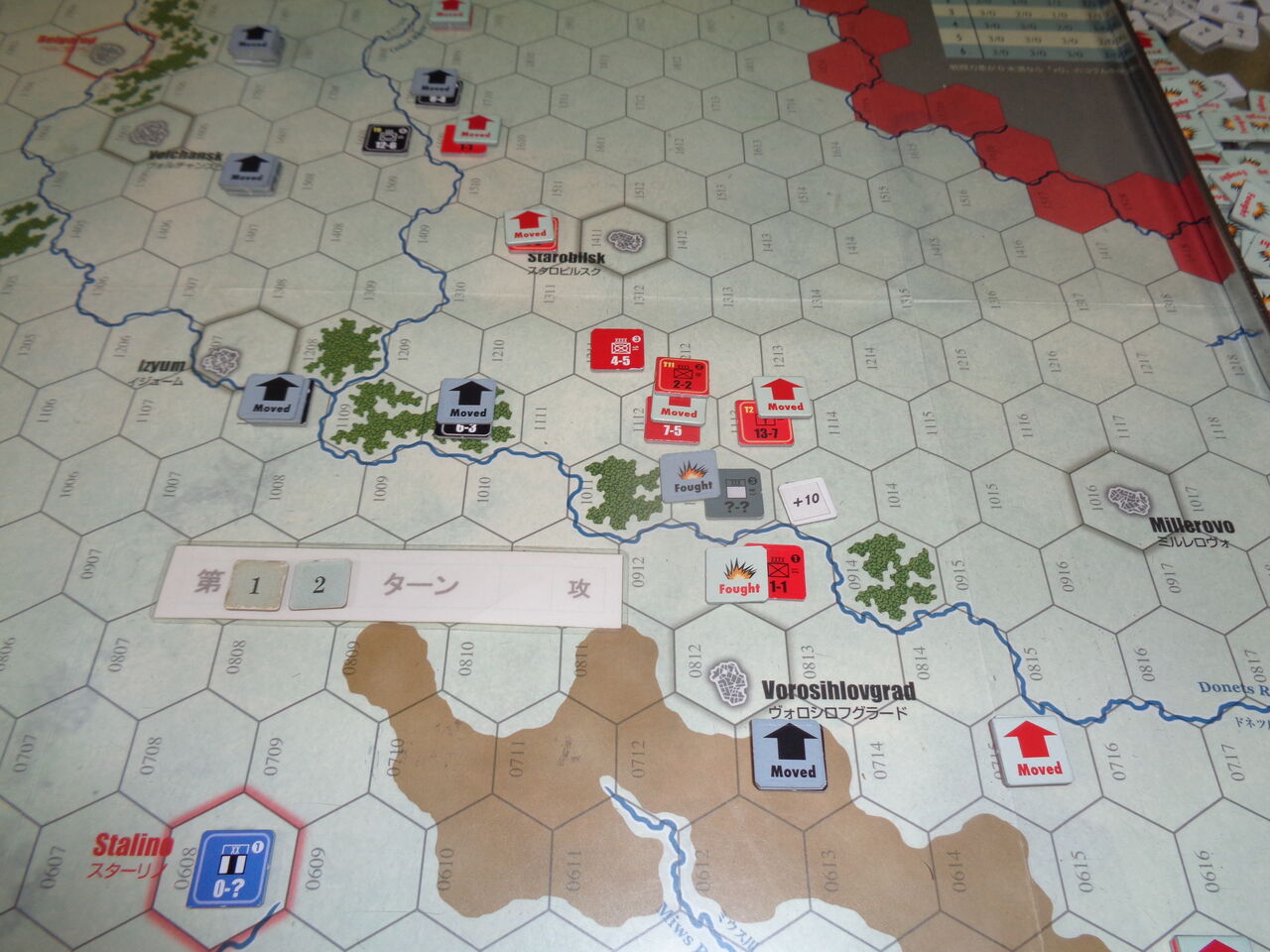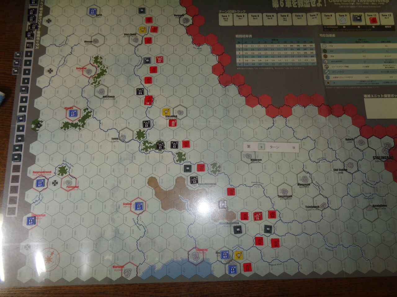 まず、ソロ演習をしてみましたが、ソ連軍が兵力を集中すると、表題と違ってスターリングラードの陥落は必至です。続いて、赤い津波による猛攻が始まるわけですが、陥落がいつ起こるかによって、展開は大きく異なります。マップの広さに比べ、ユニット数が少ないことから、早期の攻勢で一定数のユニットが撃破されると、ドイツ軍は戦線の維持ができなくなり、多数のユニットが包囲され、防御態勢が崩壊します。特に大量増援が来る第8ターンまでは、薄氷の展開になることが多いでしょう。逆にスターリングラードの陥落が遅れると、ソ連軍がドネツ河を越えられないことも。