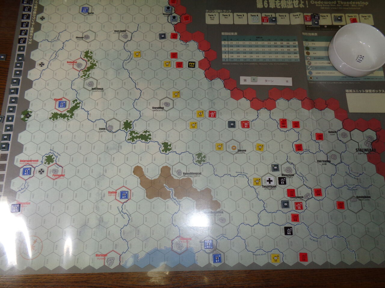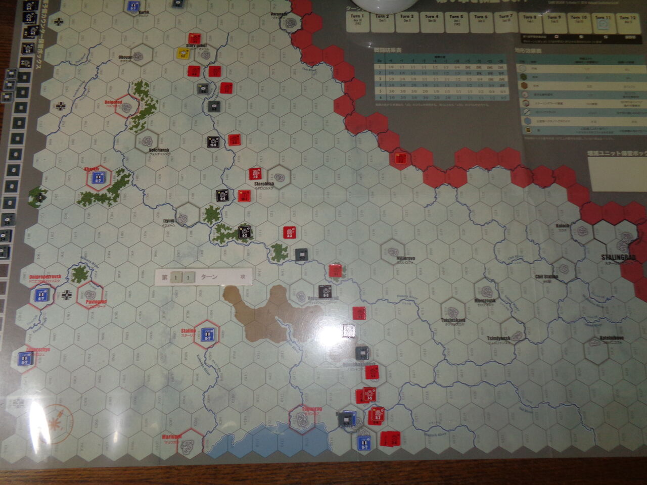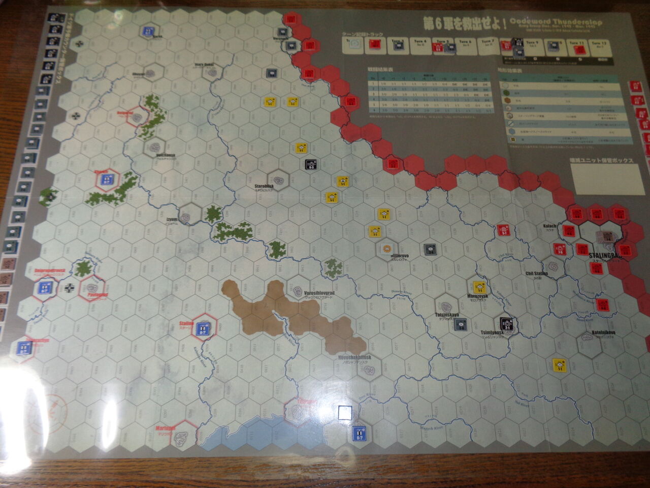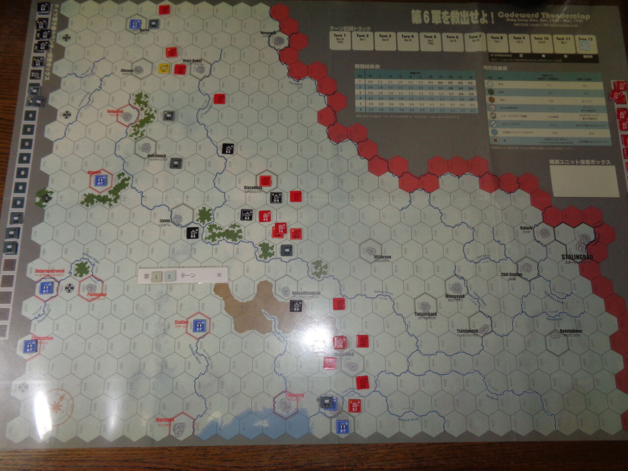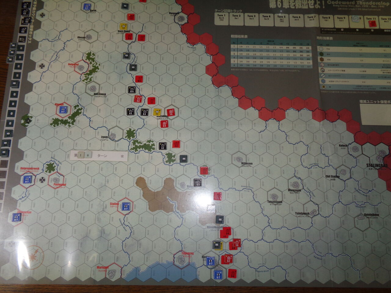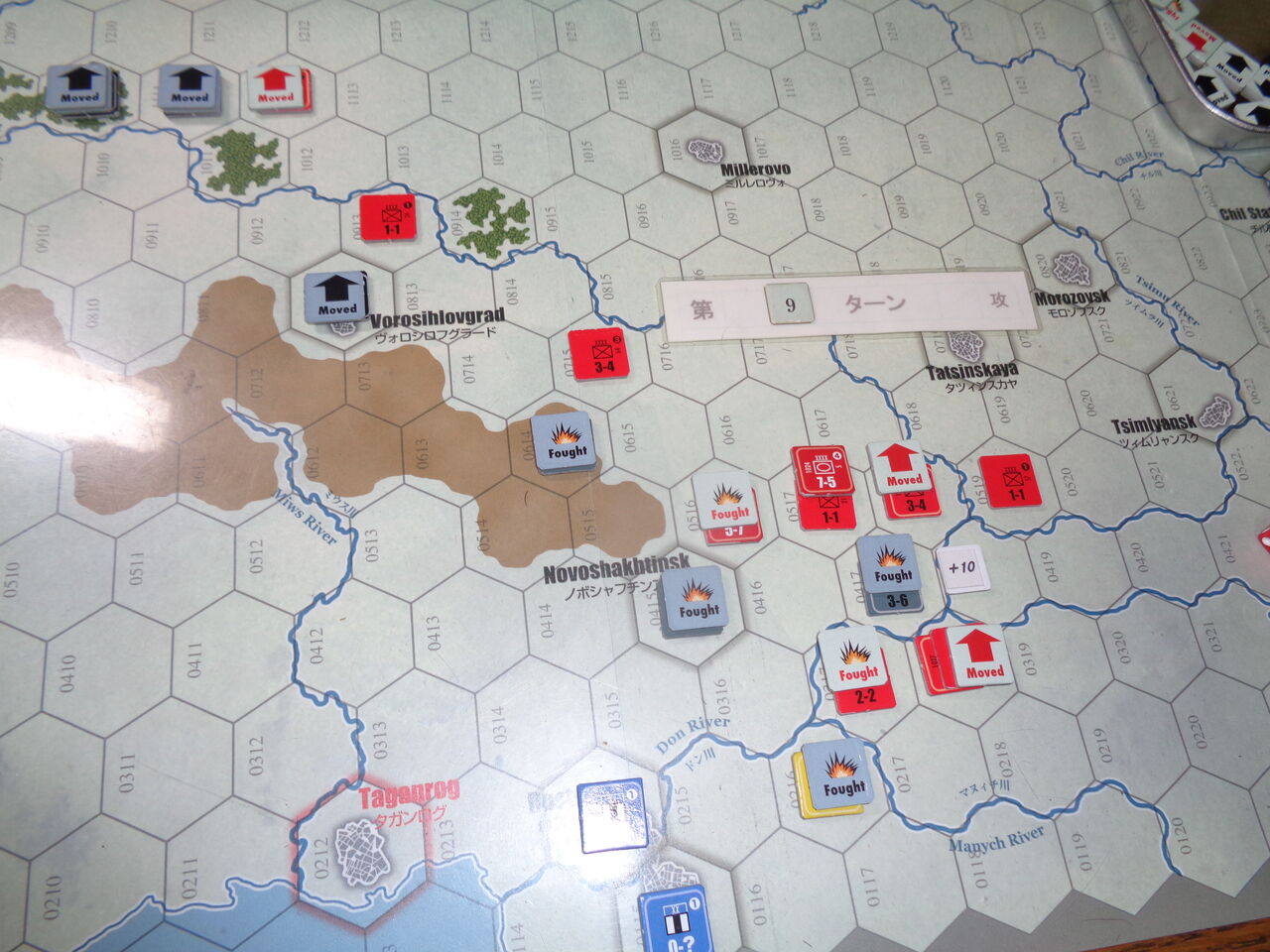 まず、ソロ演習をしてみましたが、ソ連軍が兵力を集中すると、表題と違ってスターリングラードの陥落は必至です。続いて、赤い津波による猛攻が始まるわけですが、陥落がいつ起こるかによって、展開は大きく異なります。マップの広さに比べ、ユニット数が少ないことから、早期の攻勢で一定数のユニットが撃破されると、ドイツ軍は戦線の維持ができなくなり、多数のユニットが包囲され、防御態勢が崩壊します。特に大量増援が来る第8ターンまでは、薄氷の展開になることが多いでしょう。逆にスターリングラードの陥落が遅れると、ソ連軍がドネツ河を越えられないことも。