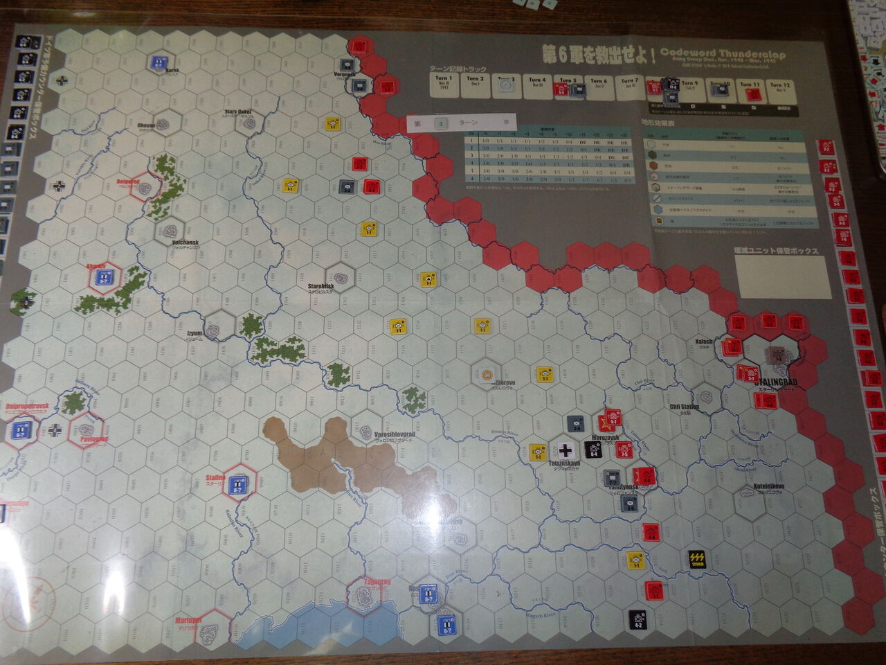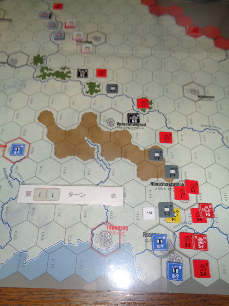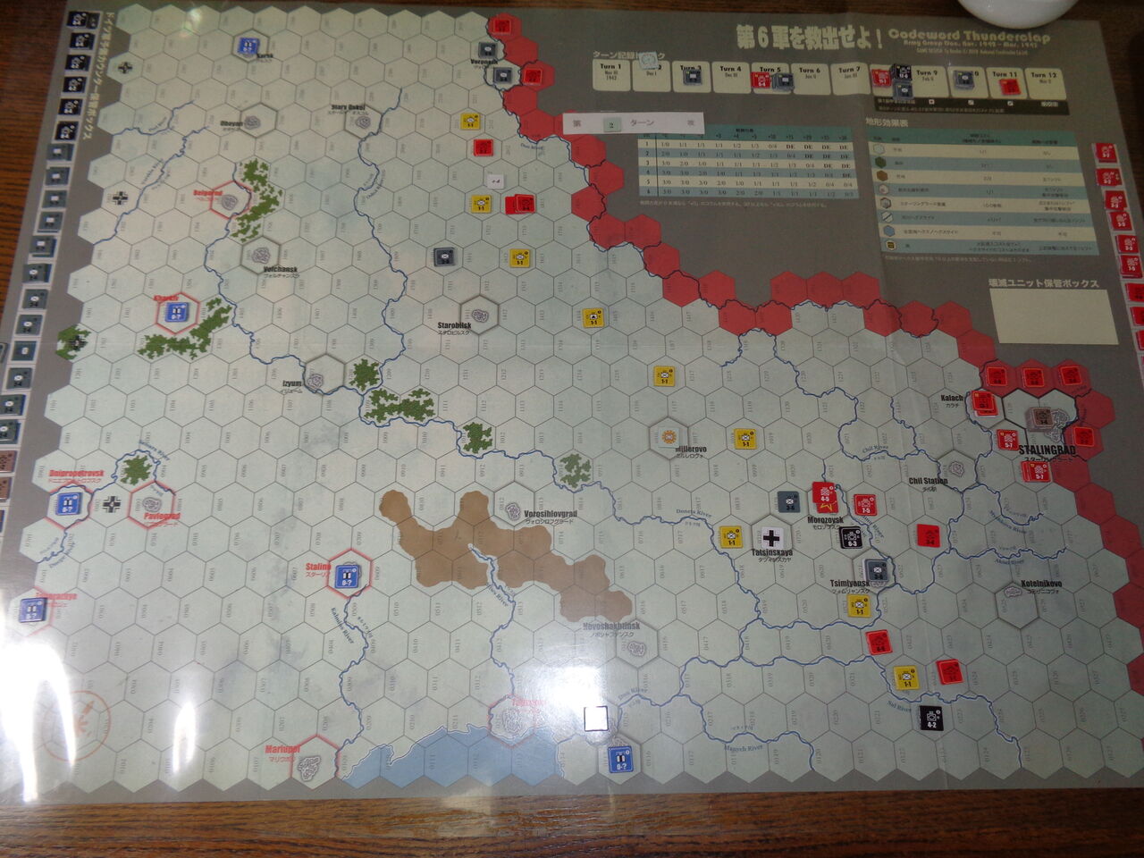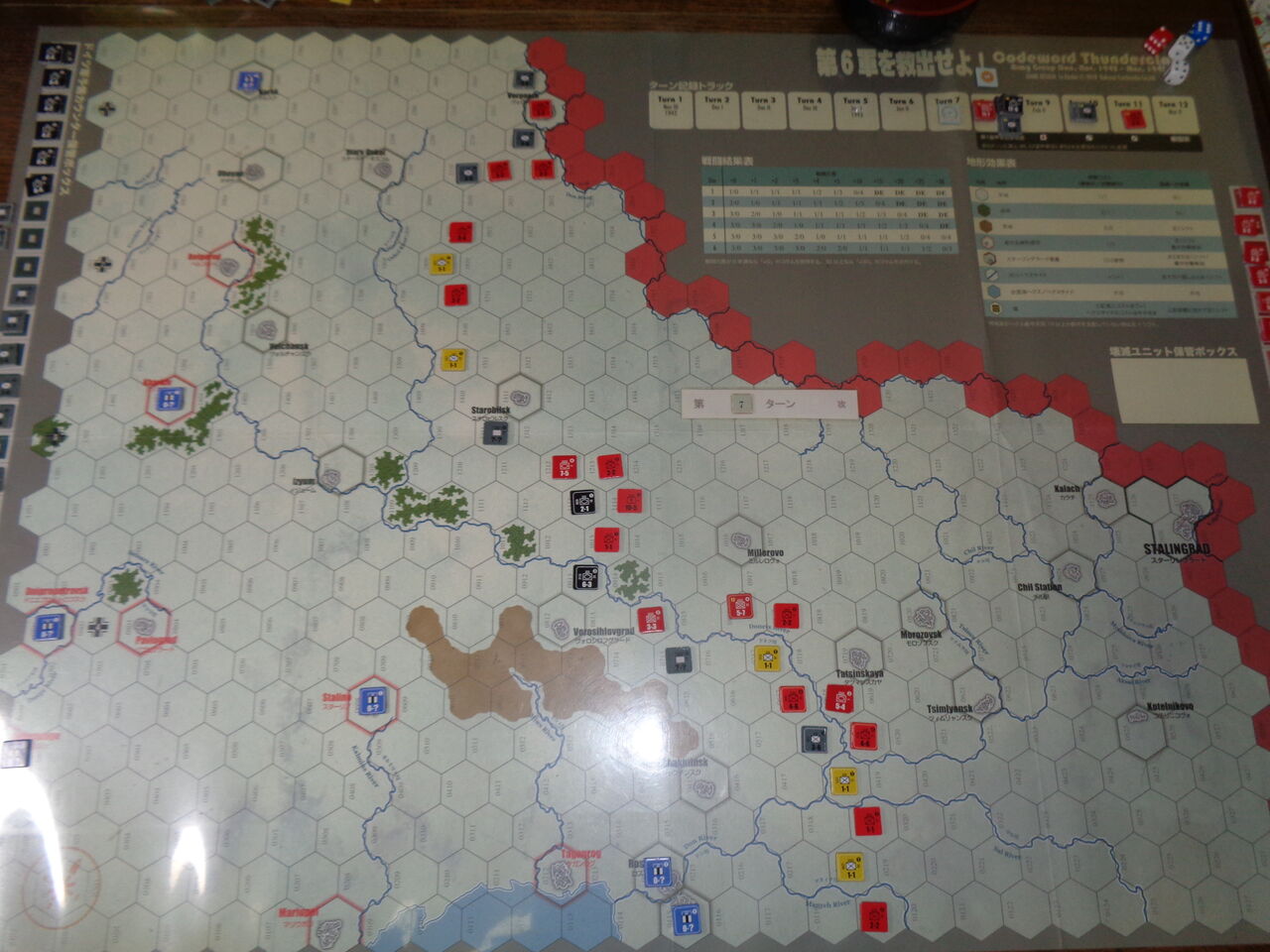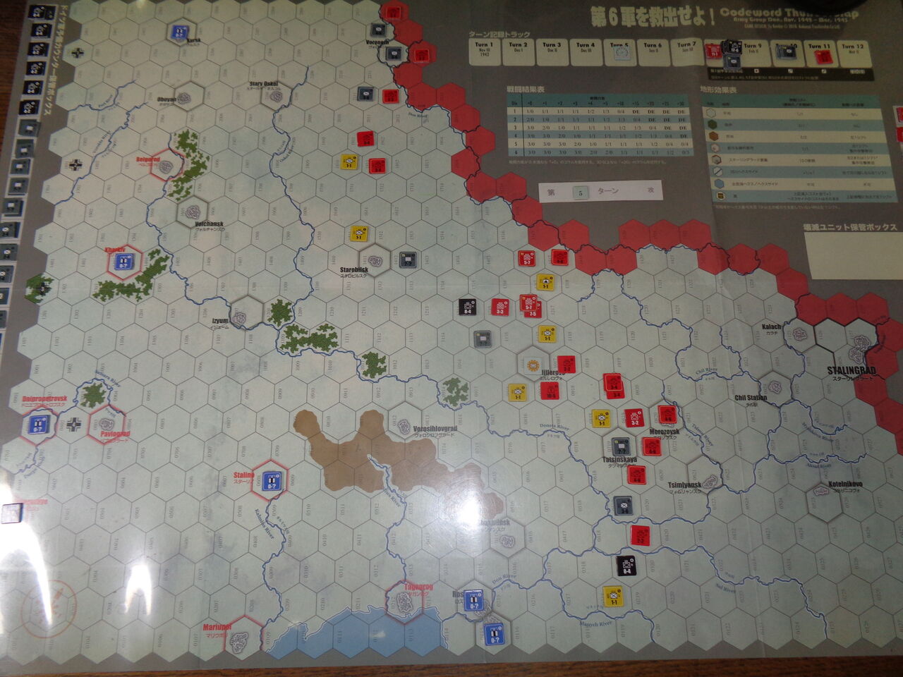 まず、ソロ演習をしてみましたが、ソ連軍が兵力を集中すると、表題と違ってスターリングラードの陥落は必至です。続いて、赤い津波による猛攻が始まるわけですが、陥落がいつ起こるかによって、展開は大きく異なります。マップの広さに比べ、ユニット数が少ないことから、早期の攻勢で一定数のユニットが撃破されると、ドイツ軍は戦線の維持ができなくなり、多数のユニットが包囲され、防御態勢が崩壊します。特に大量増援が来る第8ターンまでは、薄氷の展開になることが多いでしょう。逆にスターリングラードの陥落が遅れると、ソ連軍がドネツ河を越えられないことも。