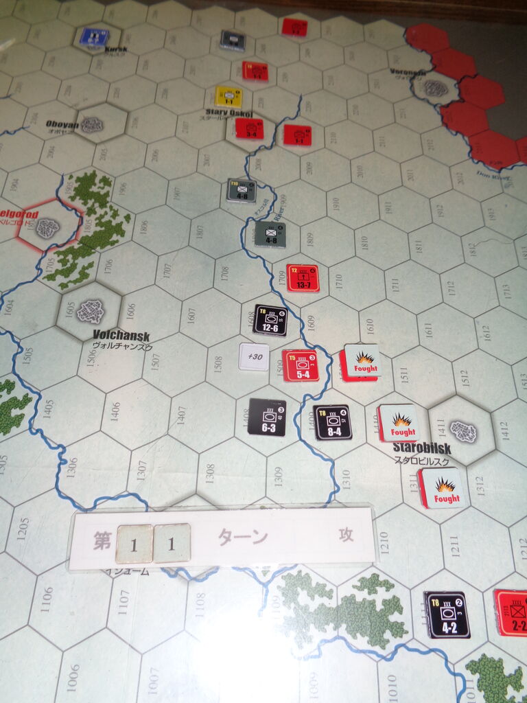 第1ターンは特別ルールで、ソ連軍は一切の行動ができません。ドイツ軍のみが行動できますが、移動力は1/2のため、戦線の形成で終了します。