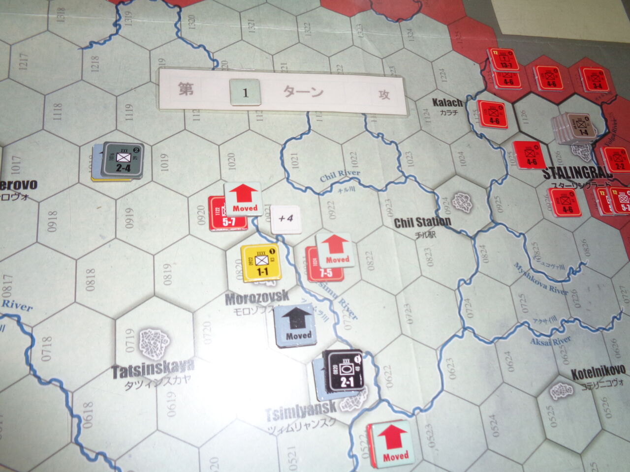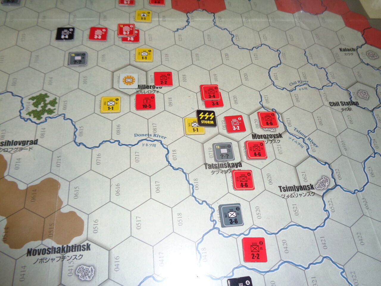 また、南部も攻撃を続行し、直接攻撃と威力攻撃で、モロズフスクとツィムリャンスクを占領します。これにより、スターリングラードの防御効果は、左1シフトに低下します(特別ルール)。