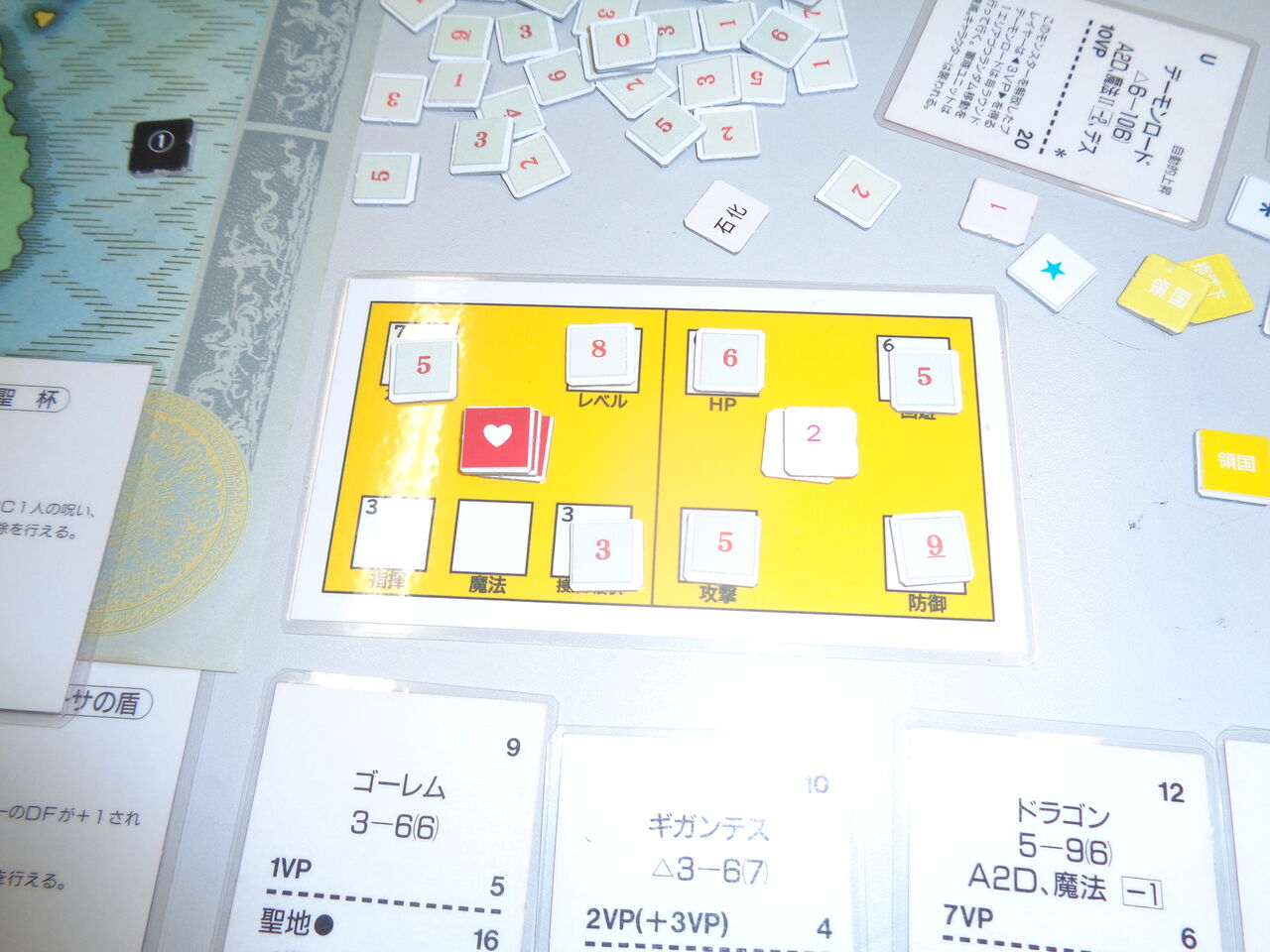 後半になって、資金が貯まり始めた各パーティは、アイテムカードの購入に走ります。が、drが冴えず、ゲットできたのは、ファイター(黄:mitsu)のみ。実は、ここまでスペシャルモンスターの撃破で、2枚のアイテムカードを手に入れており、高VPのアイテムをゲットできれば、2枚程度で勝利できそうだったのですが・・・ここで、最悪の「黒酢骸骨」!これを持っている限り、勝利宣言ができず、廃棄は「火の山」のみ。そこに待っているのは、強力無比なドラゴン!(レベル12、A2D、攻撃力5、防御力9、魔法-1)大枚叩いて、何という不運!!