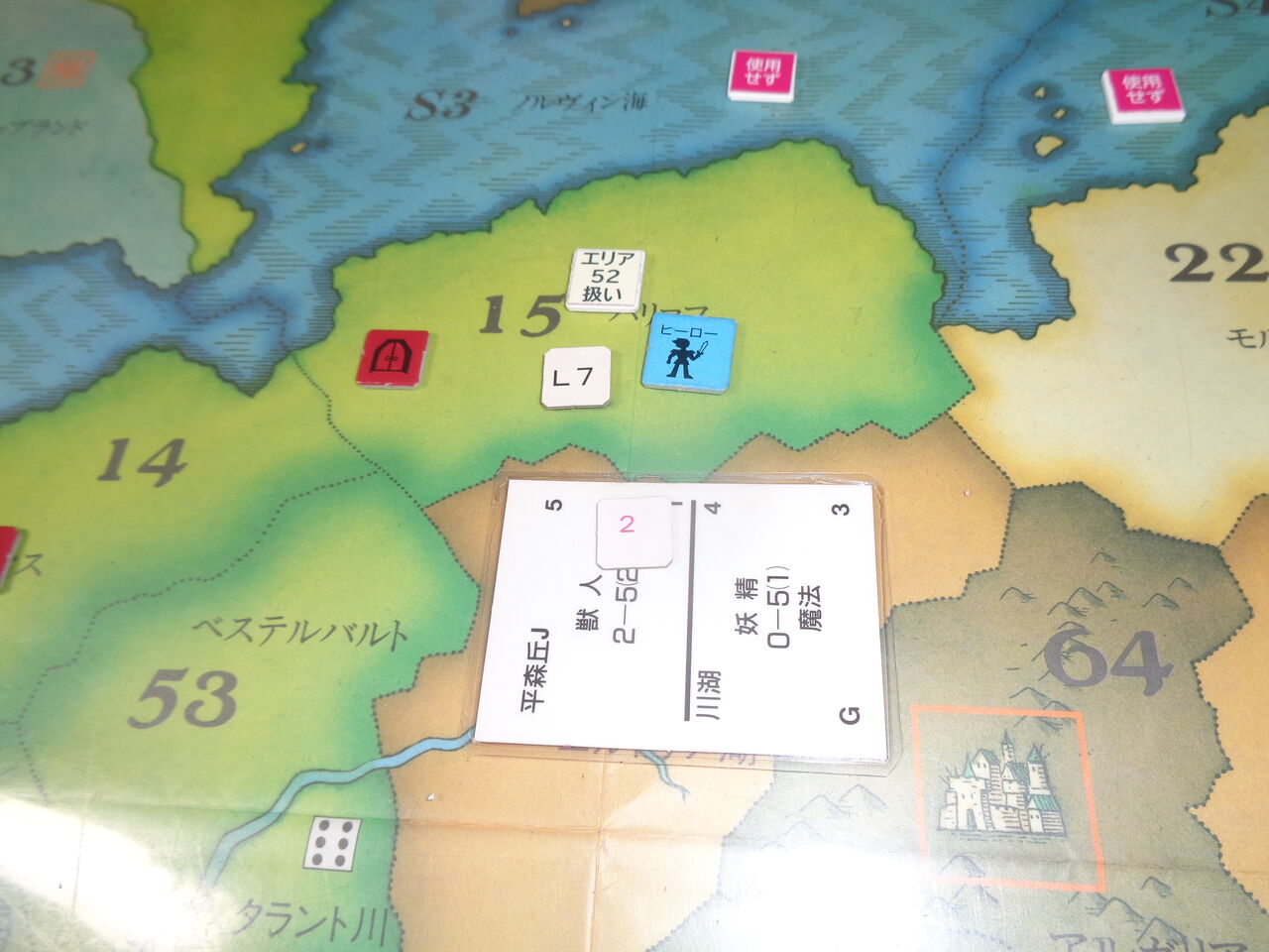 最大の課題が、勝利条件でして。6回目の1が出る前に20VPを獲得するのは、比較的容易ですが、前提条件として、最低1つのクエストを達成し、1匹のスペシャル・モンスターを倒し、領国を1つ以上、持つこと。そして、結婚すること!実は、結婚ができるのは、限られたアイテムカードか、クエストの達成しかありません。大まかに計算したところ、その確率は1/8程度しかなく、相当の婚活難(笑い)が予想されます。ファンタジーのヒーローだと、絶対、モテる(はず)と思うのだけどなぁ~。
