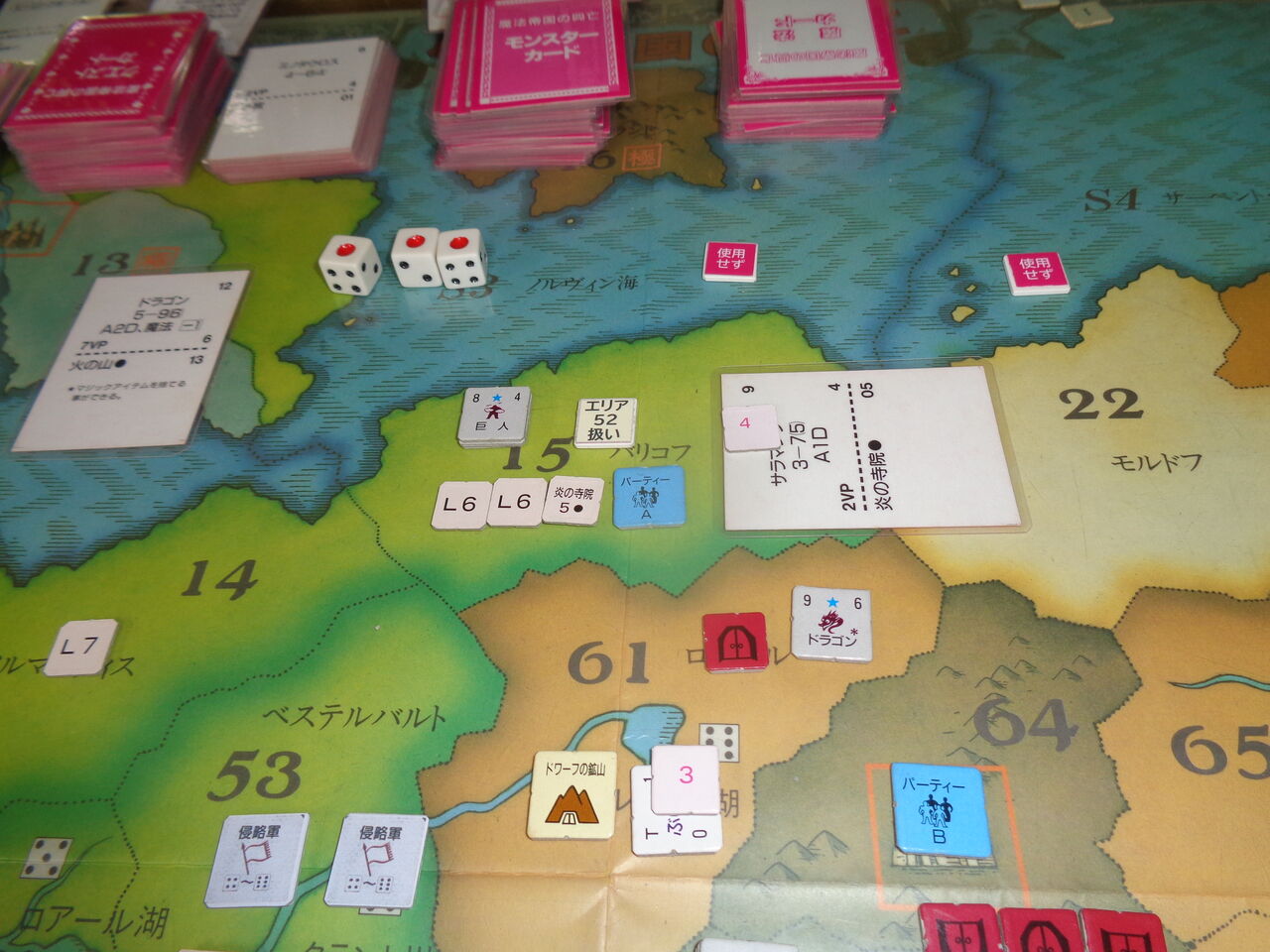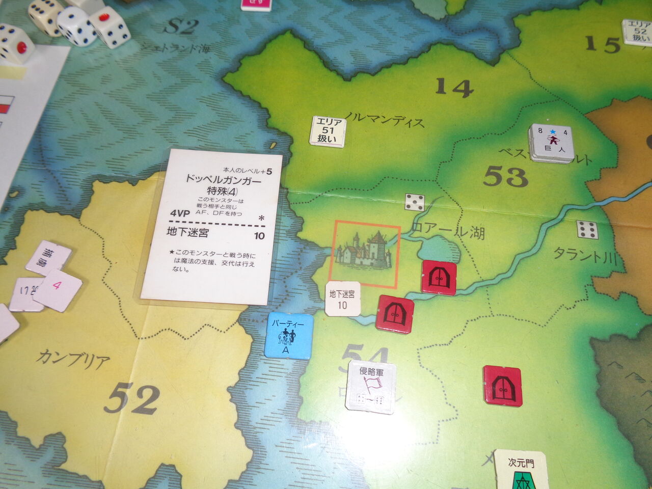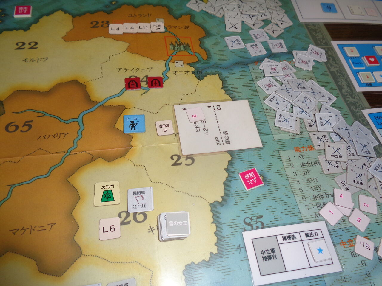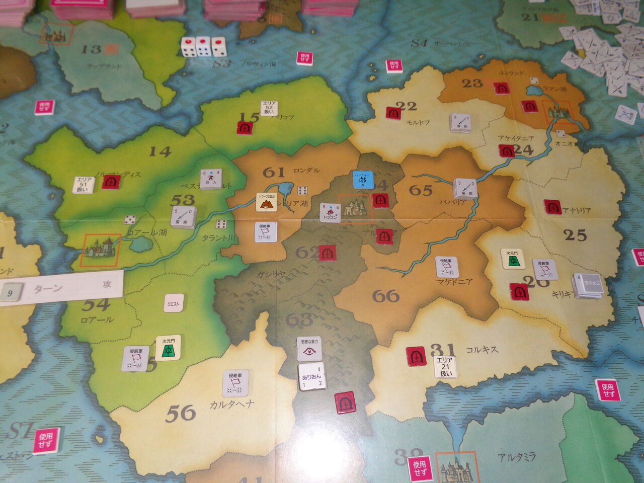 そうこうしているうちに、2回目の1が出て期限が迫り、第8ターンには非常にやっかいなドラゴンが、第9ターンにはとっても攻めづらい雪の女王が出現します(隣接するエリアの軍隊を全て寒冷で消耗させる!)。この雪の女王が登場したのが、異次元の門のエリアであり、とてもではないですが、ここの門の破壊は不可能になります(一方的に異次元の悪魔が登場するのみ)。さらに3度目の1と、こりゃ、かなり雲行きが怪しくなってきます。