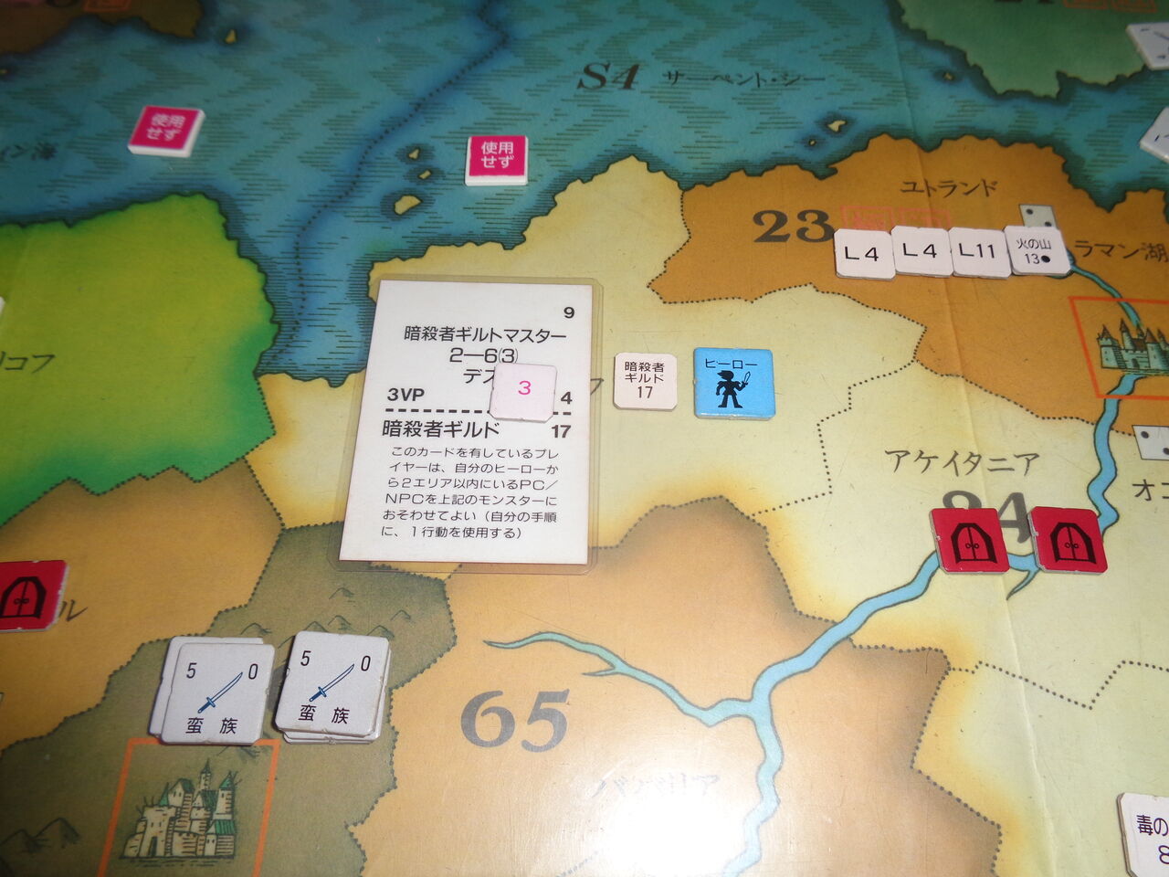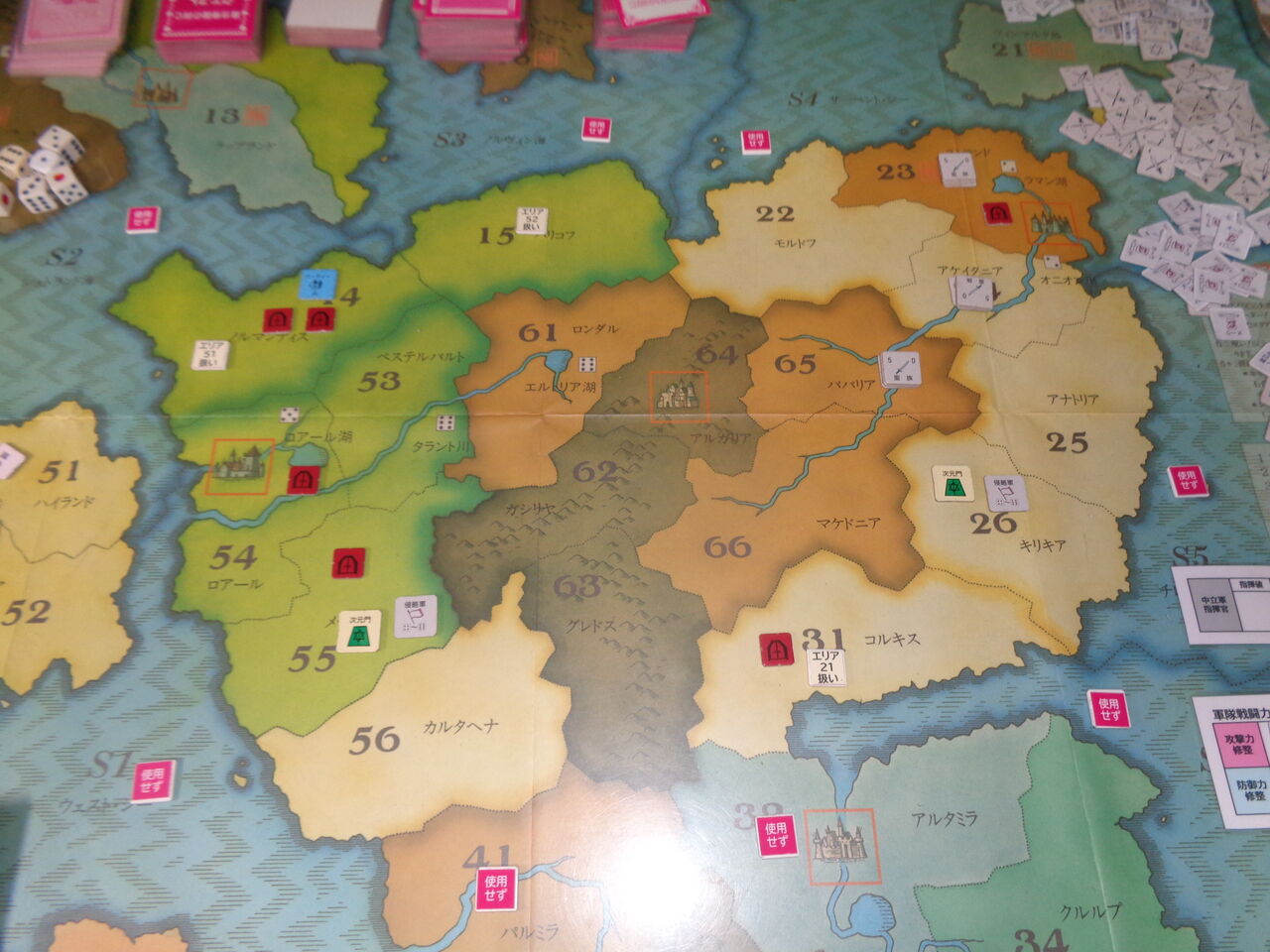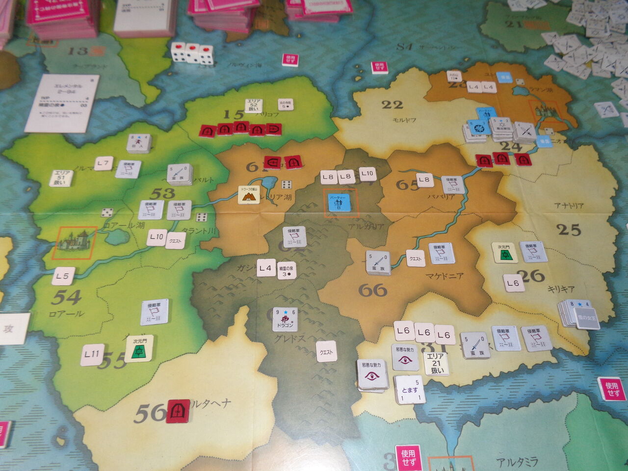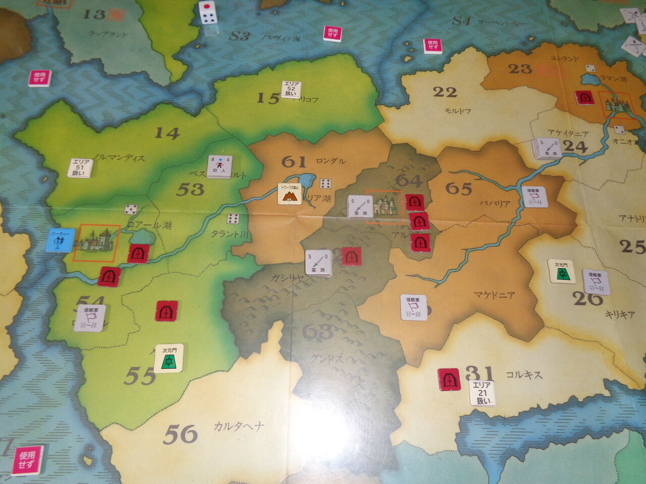そうこうしているうちに、2回目の1が出て期限が迫り、第8ターンには非常にやっかいなドラゴンが、第9ターンにはとっても攻めづらい雪の女王が出現します(隣接するエリアの軍隊を全て寒冷で消耗させる!)。この雪の女王が登場したのが、異次元の門のエリアであり、とてもではないですが、ここの門の破壊は不可能になります(一方的に異次元の悪魔が登場するのみ)。さらに3度目の1と、こりゃ、かなり雲行きが怪しくなってきます。