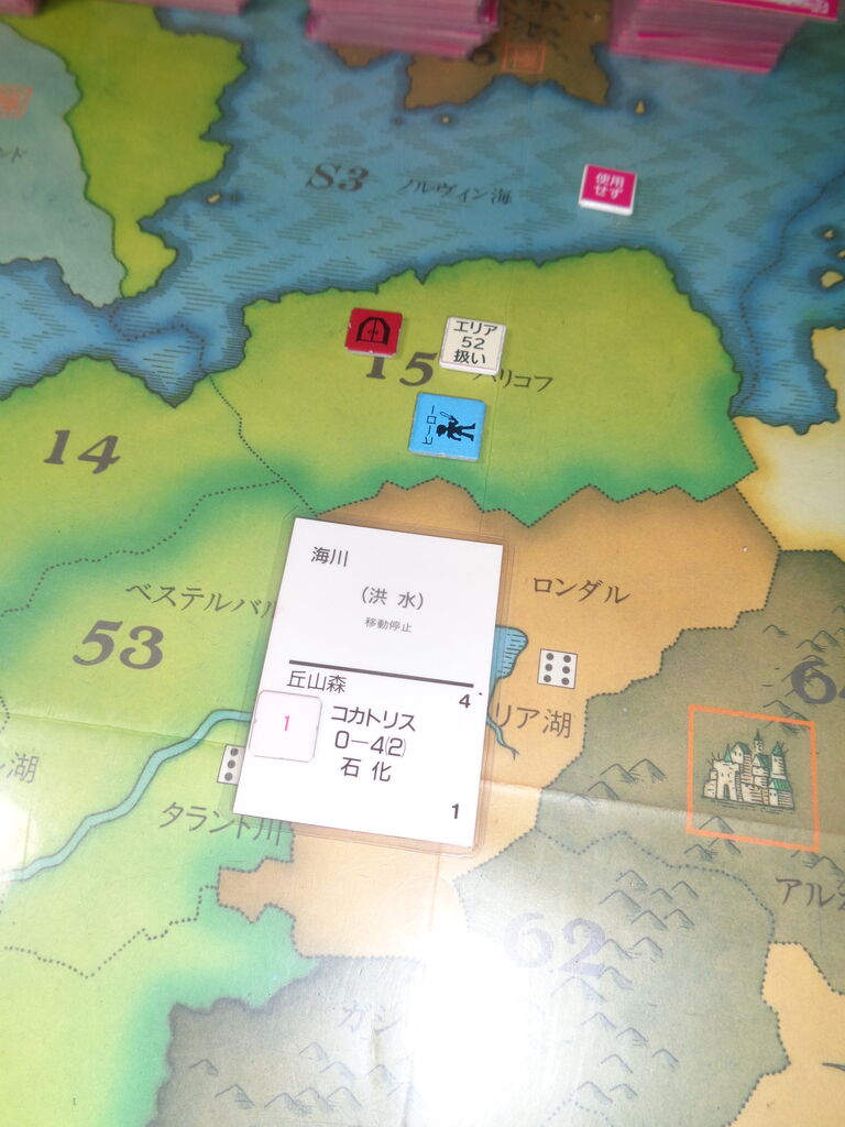 第1ターン、早速、ワンダーリング・モンスターの獣人を倒すも、能力は上がらず。ならばと、飛び込んだダンジョンで、コカトリスの魔法を喰らって、石化!いきなり、ライフを1つ失います。かといって、逃走したり、事前調査をしていると、凶悪なイベントが発生し、決起が厳しくなるので、無理を承知でスピード成長するしかない!とほほほ・・・。