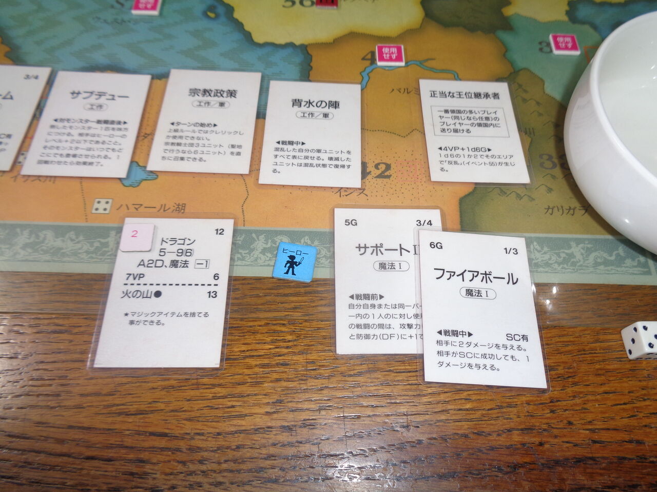 さすがに、スペシャル・ダンジョンも品切れガチで(!)、やむなく、第15ターン、最強のレベルのドラゴンに挑むことに。いきなり、A2D(自動2ダメージ)を喰らい、ここに来て戦闘drがスカばかりで、ああ、ヒーローが二度目の死亡に!が、生き残ったNPCと召喚魔物エフリーテの死に物狂いの抵抗で、ついに魔のドラゴンを撃ち取ります。これで、VPは20を越え、そして、アイテムは待ちに待った「姫」!