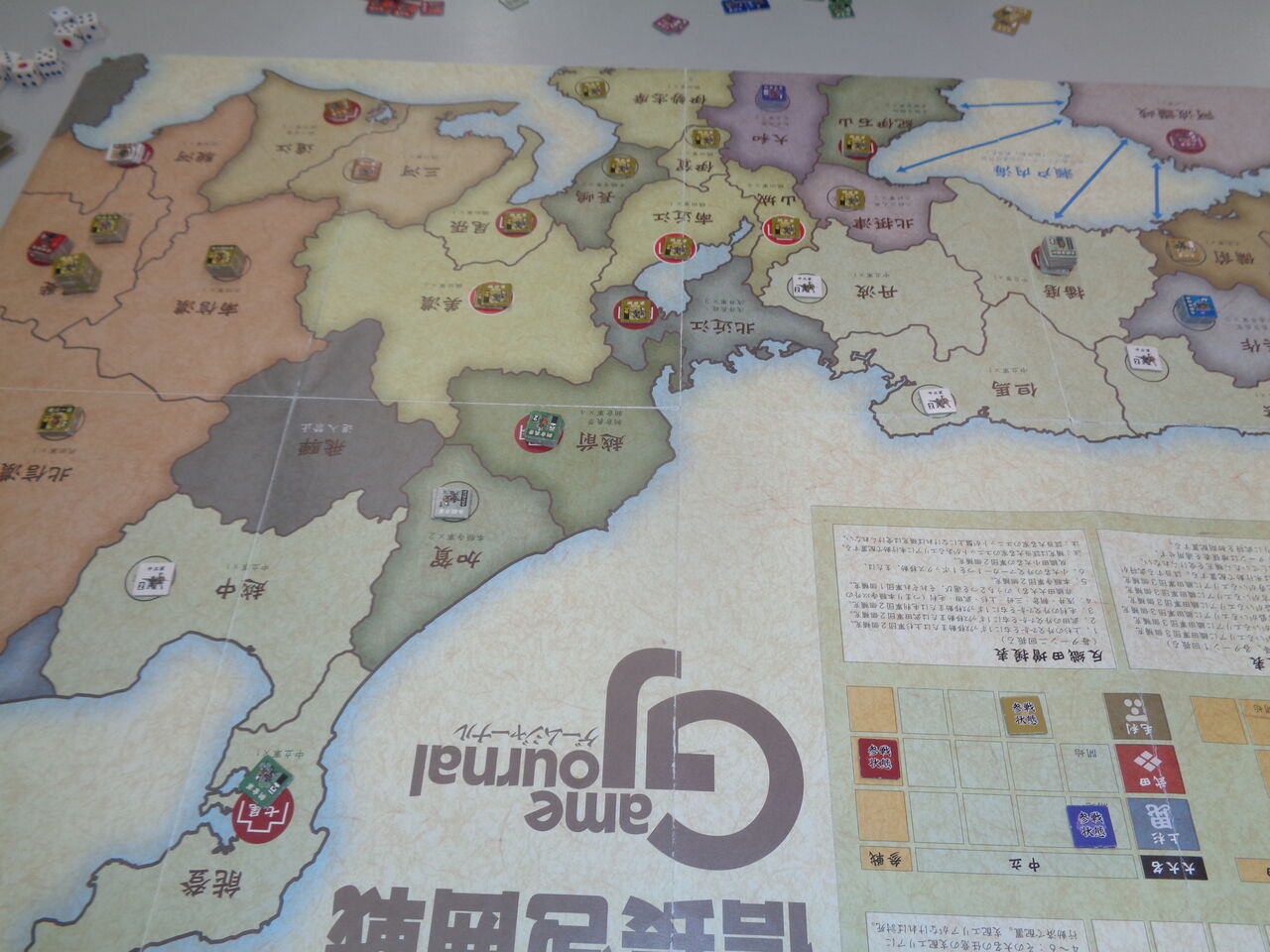 第1ターン、織田の突撃カードは1枚のみ。そこで、迷ったあげく、畿内に近い浅井を先に叩き、これを滅亡させます。が、浅井軍の決死の抵抗で、3ユニットが除去されます。反織田側は、朝倉軍を持って安全地帯の能登を攻略し、遷都を果たします。が、越前には1ユニットしか残っていなかったので、別働隊の滝川が動いて、これを占拠します。