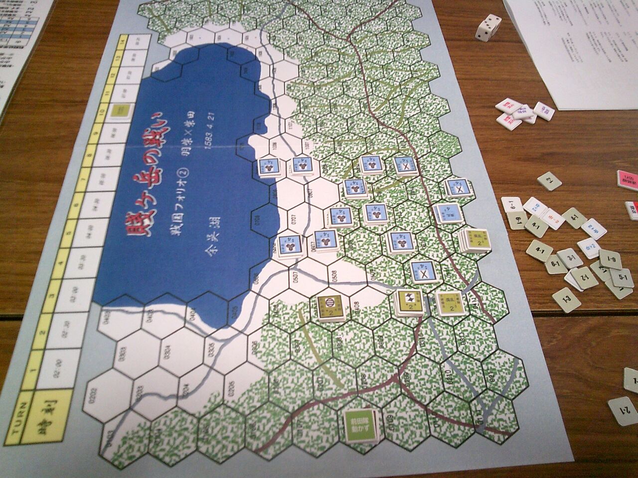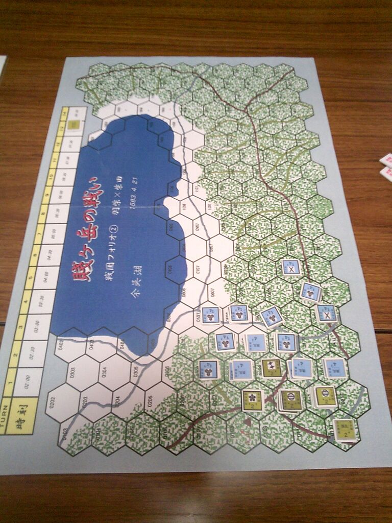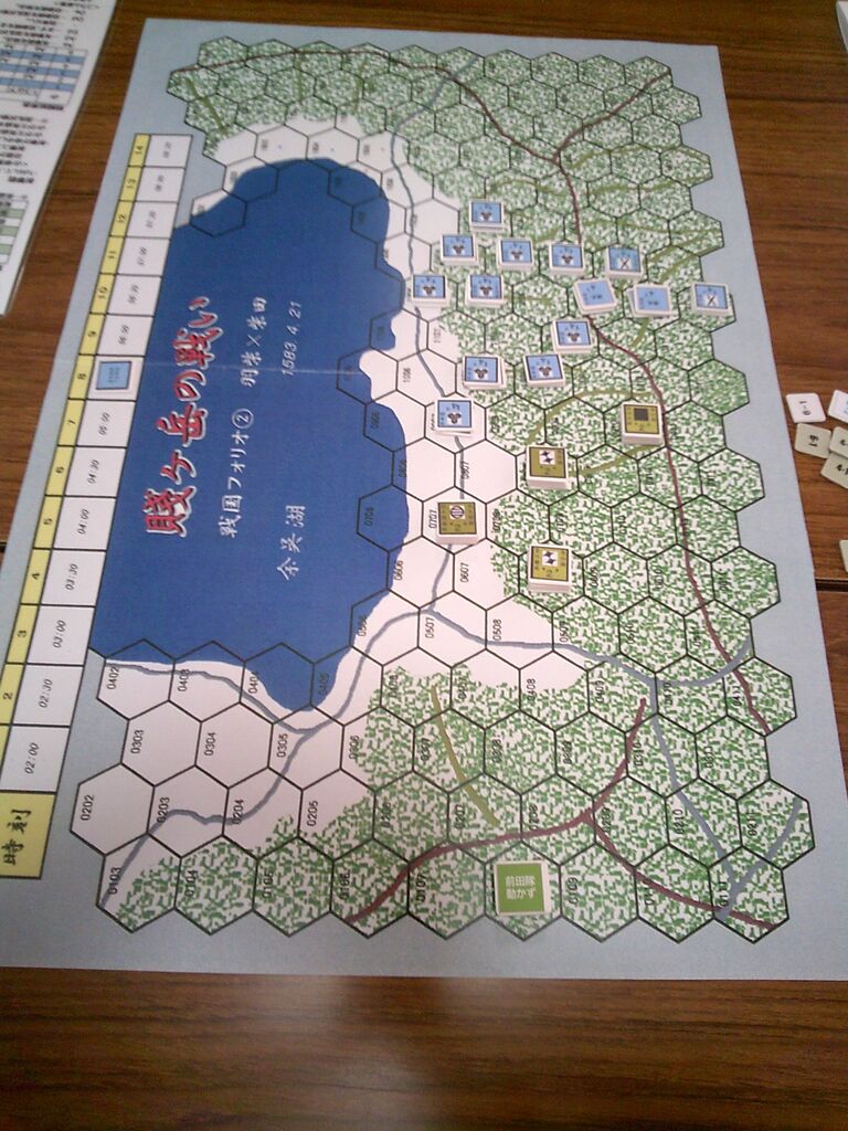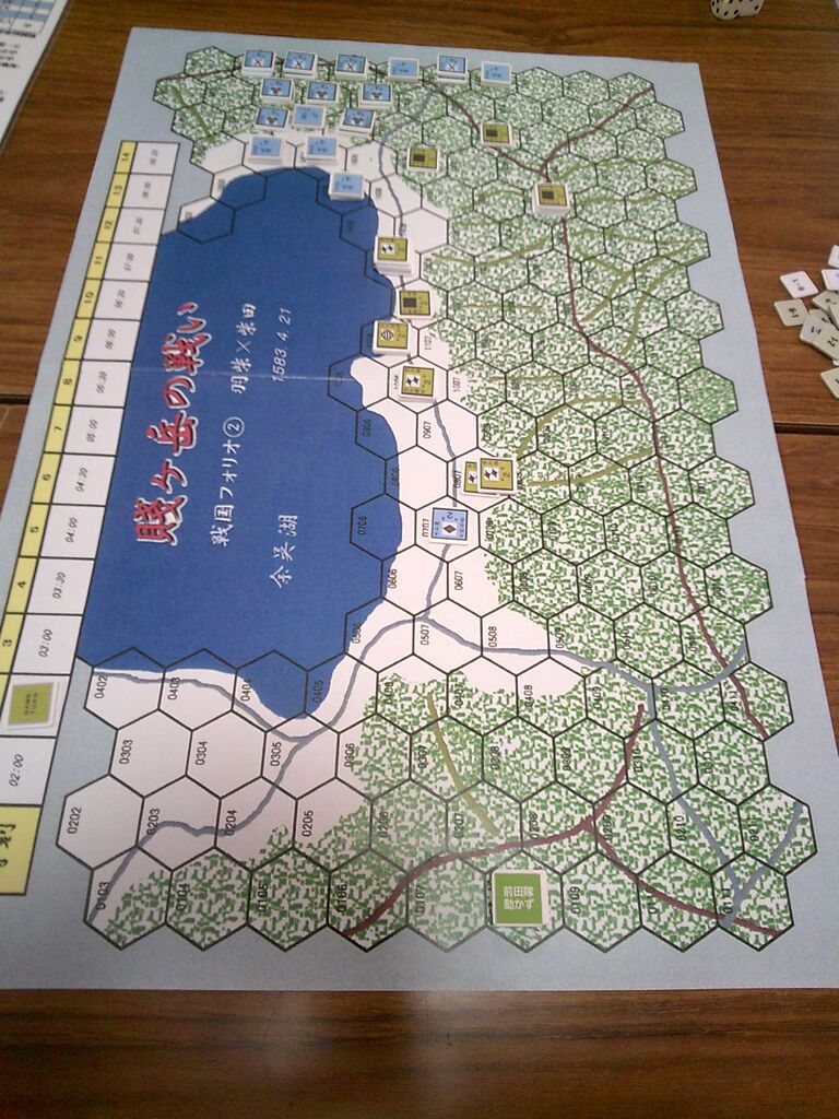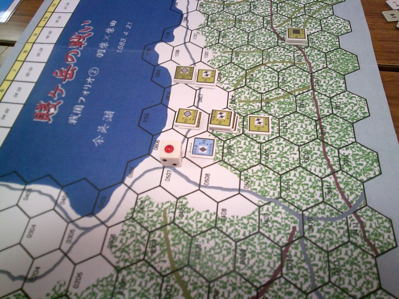 前々回から参加いただいているohaさんのリクエストで、「賤ヶ岳の戦い」(ルーデンス・フェベル)を対戦しました。ゲムマで手に入れた合戦級なんですが、正直、いかにも同人然とした見た目からたいしたことはないだろうと、思っていたのですが・・・ソロをしてみたら、シンプルなのに面白い!しかも、様々な戦場にも適用できる汎用性の高さ(とデヴェロップメント)。