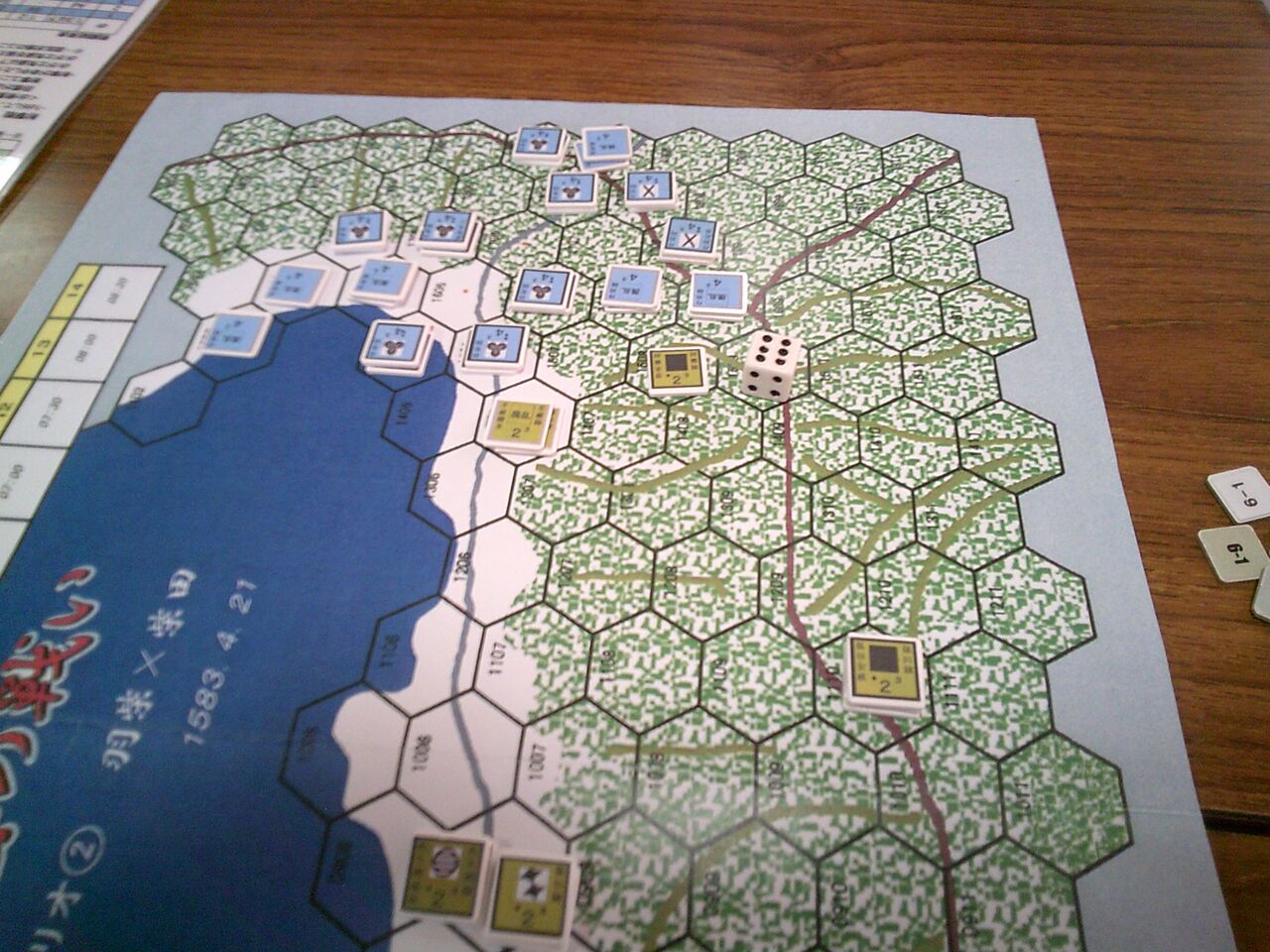羽柴軍は、セオリー通りの数を生かした攻撃をかけ続けましたが、戦闘drに背かれ、消耗戦に持ち込めず。士気回復も確率より低く、山間部の移動にも手間取り、十分な攻撃もできないターンもあり。「きっと、美濃から徹夜で走り続けで、足がもつれたに違いない」(笑い)。