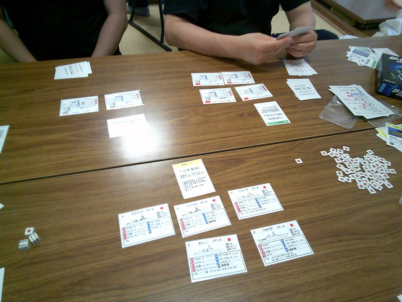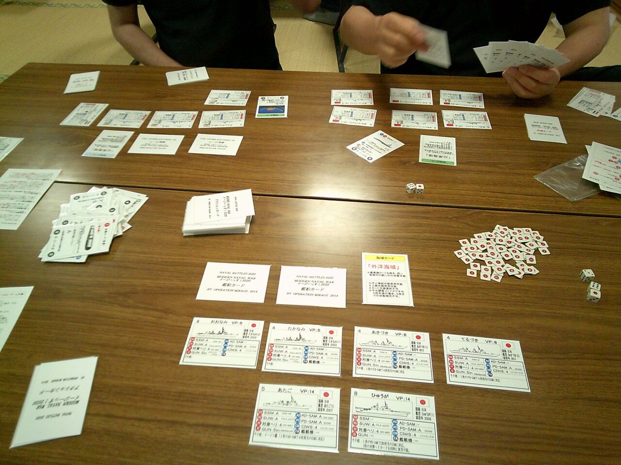 こちらもデザイナーの平さんが来ているので、インストをお願いした「MODERN NAVAL WAR イージーっす!2020」(グループ乾坤一擲)です。傑作「Ships&Tactics」を下敷きに、現代海戦らしい調整をしたカードゲームですが、平さんがいい意味で拘っていて、それらしい展開になるのはさすが。海上自衛隊(mitsu)・中国海軍(平)・インド海軍(oha)で、プレイします。
