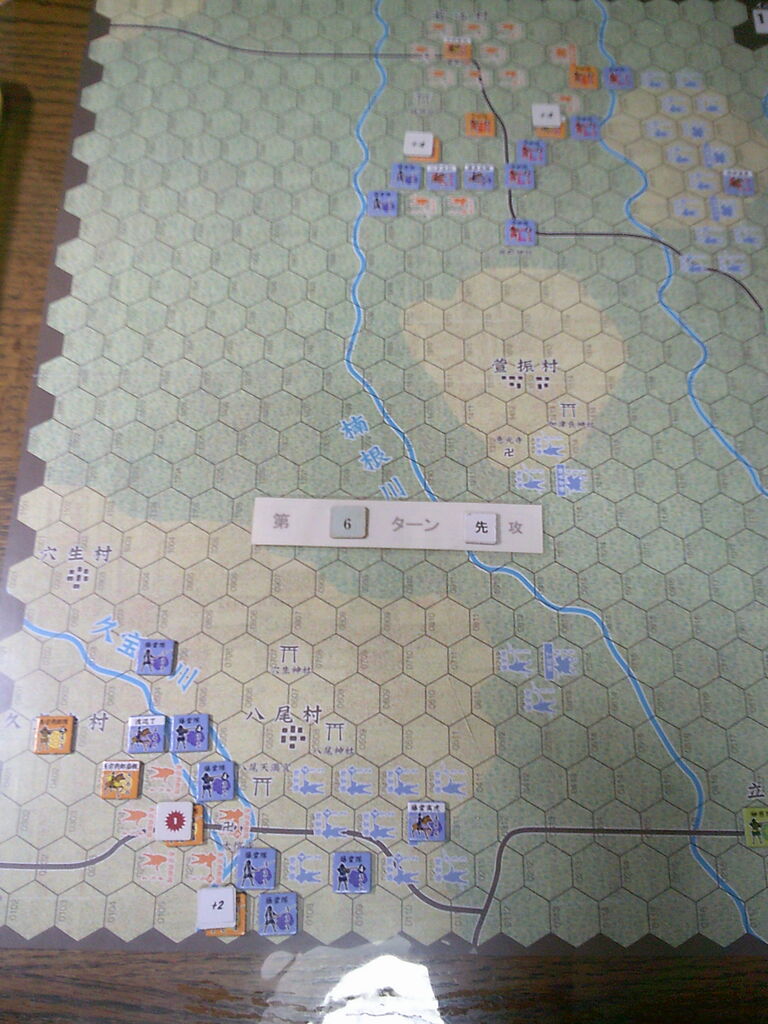 関東方は反撃の白兵戦でDEを、さらに前進射撃で1ユニットをMCの致命的失敗とさせ、木村隊の計2ユニットを除去します。ここで、井伊隊が果敢に敵中へ戦闘後前進を行い、揺さぶりをかけます。