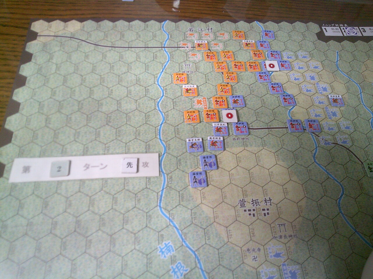 スタートは、このシナリオがよいとなっていますが・・・両軍とも、行動できる部隊は、先陣の4隊のみ(長宗我部・木村隊と藤堂・井伊隊)。関東方の残りのユニットは、一切、移動できず。では、なんのためかというと、キャンペーン(シナリオ3)の後半に使用するそうです。