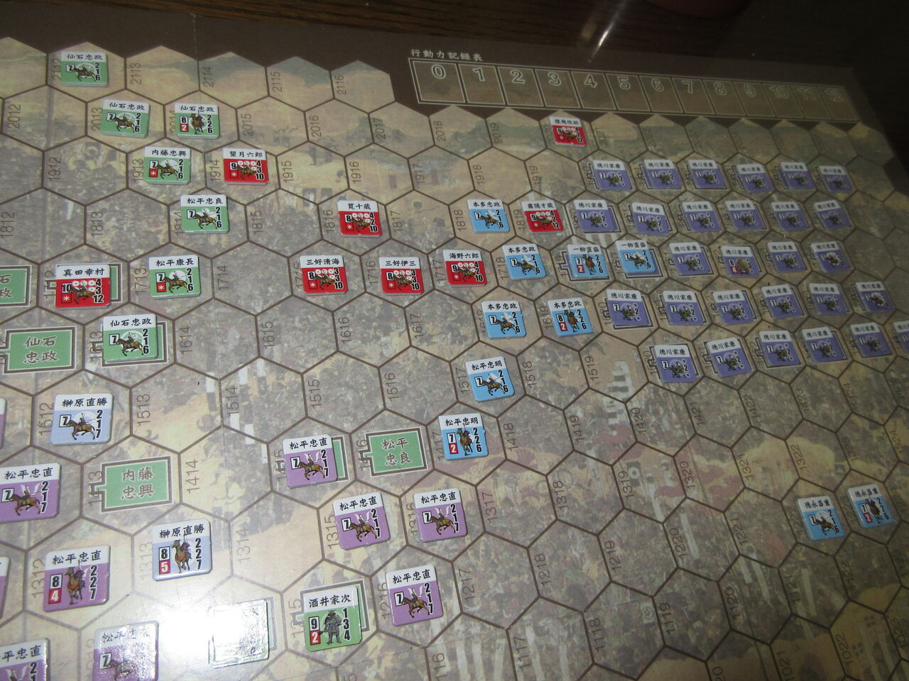 第1ターン、特別ルールでこのターンは大坂方のみが行動できます。引いたチットは、石川隊-真田隊で両隊が関東方の間隙を縫って、家康本陣に接近します。