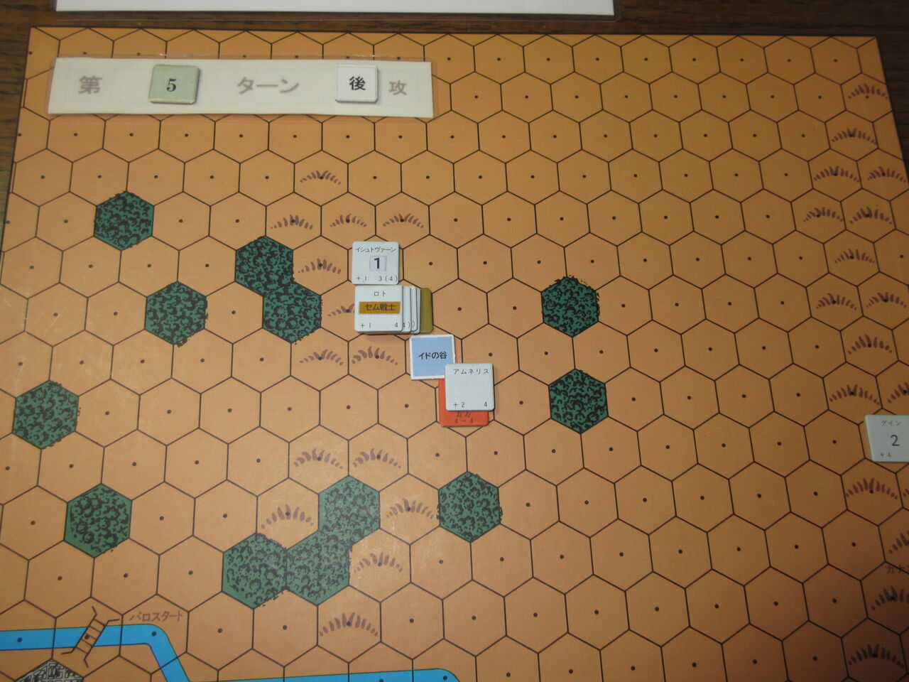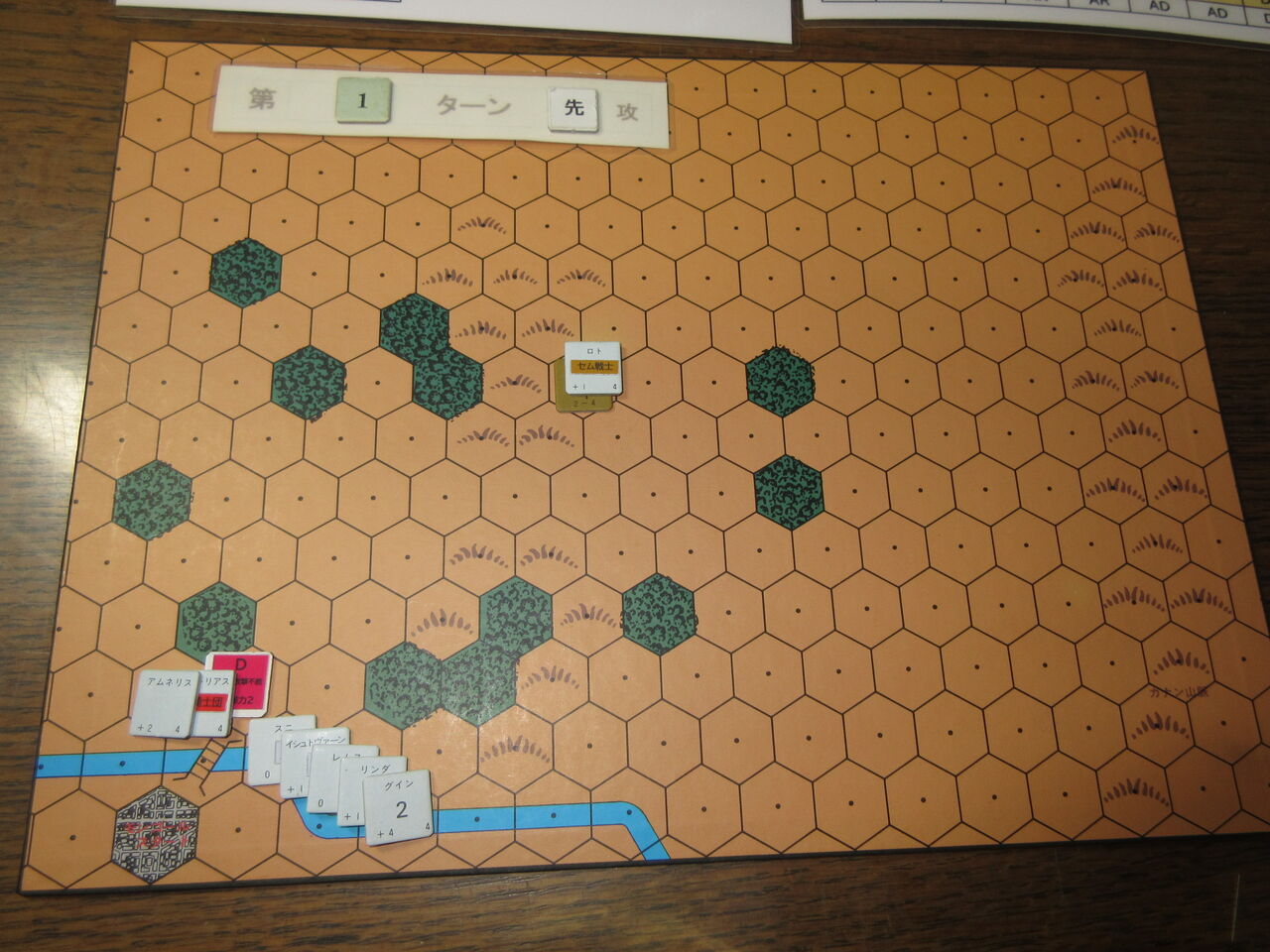 一方、なんとしても一矢報いたいアムネリスは、ラク谷の背後からわずか1ユニットで奇襲をかけます。セム族は長老のロトを中心に迎え撃ちますが、足並みが揃わず、敗退(1:1の-1修整)。パロの双生児も慌てて、逃げ出すハメに。