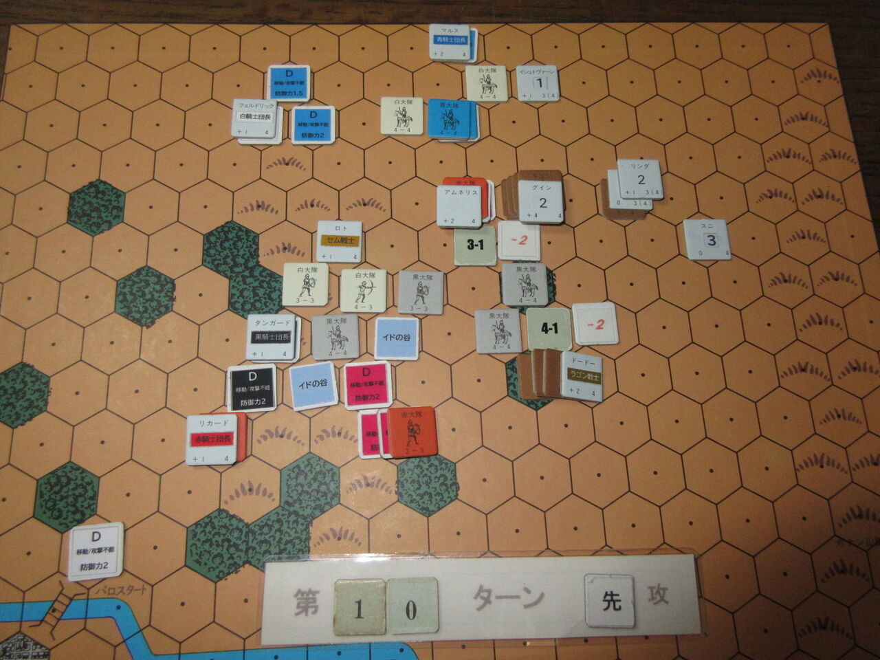 一気に片を付けん!大反攻に転じたパロ・セム・ラゴンの連合軍は、グイン隊、ロト隊、ドードー隊が一斉に強襲をかけます。さらに、リンダ(!)率いる別働隊までが、追撃に加わり、モンゴール軍を圧倒。士気減退ユニットも含めて、このターンだけで6ユニットが討ち取られ、この時点でモンゴール軍の損害が11となり、ジ・エンド。ノスフェラスの戦いは、パロ・セム・ラゴン軍の勝利となりました。