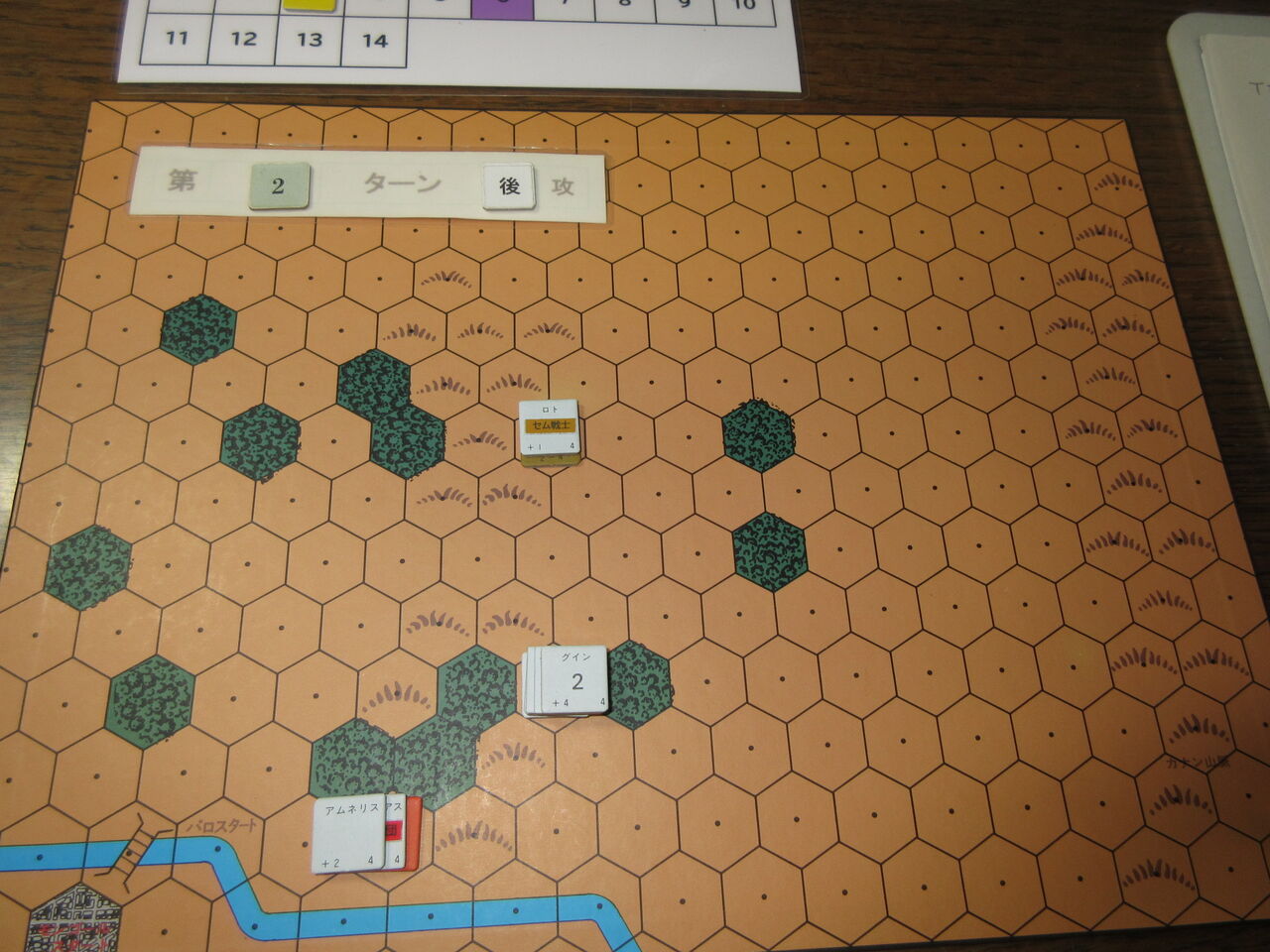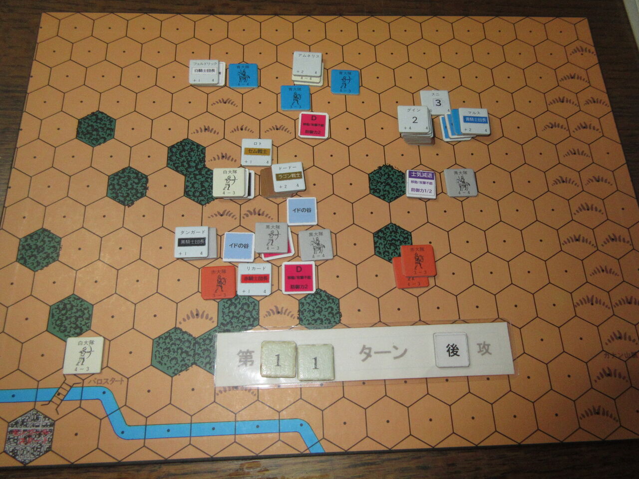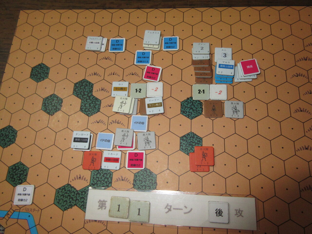 また、勝利条件のリンダとレムスの捕獲が、今の手順では極めて困難です。両軍の移動・戦闘・回復終了時に、やっと捕獲があるのですが、敵ZOCに対するキャラの移動制限が曖昧であり、リンダとレムスのへクスにモンゴール軍が進入しても、続くパロ軍の移動で離脱できるので、いつまで経っても捕まらず。これを防ぐには、モンゴール軍を敷き詰めるしかないのですが、先ほどの恐る恐るのモンゴール軍では、とても無理。