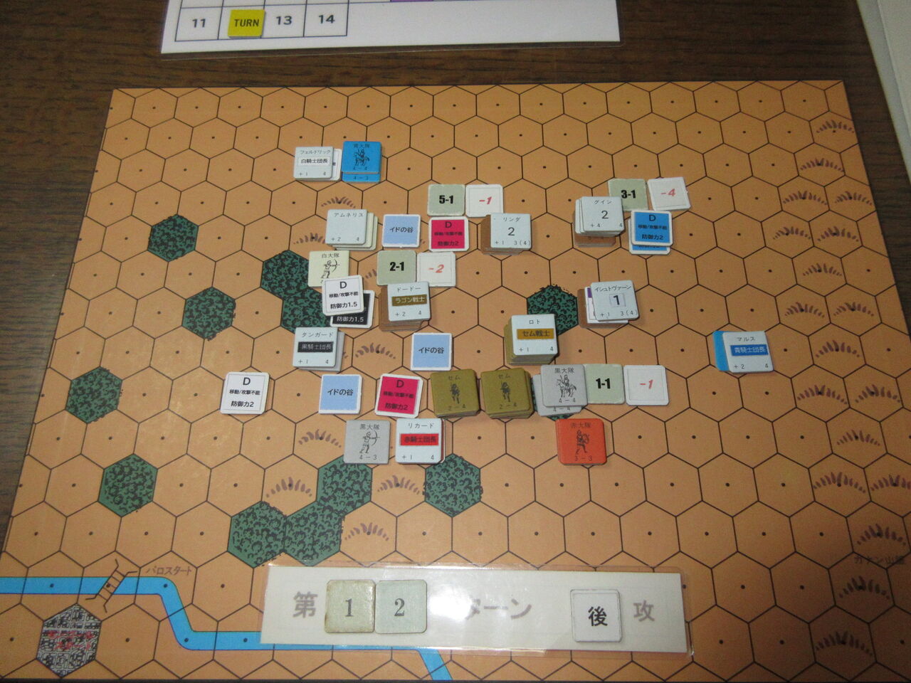 第12ターン、隠れていたセム族が一斉蜂起!明らかな劣勢に動揺したモンゴール軍は、荒地や森に逃げ込んで立て直しを図りますが・・・ここで、最後のイド!荒れ狂う粘膜質の大軍に青騎士に一隊が呑み込まれます。これがさらなるパニックを呼び、モンゴール軍はバラバラに。