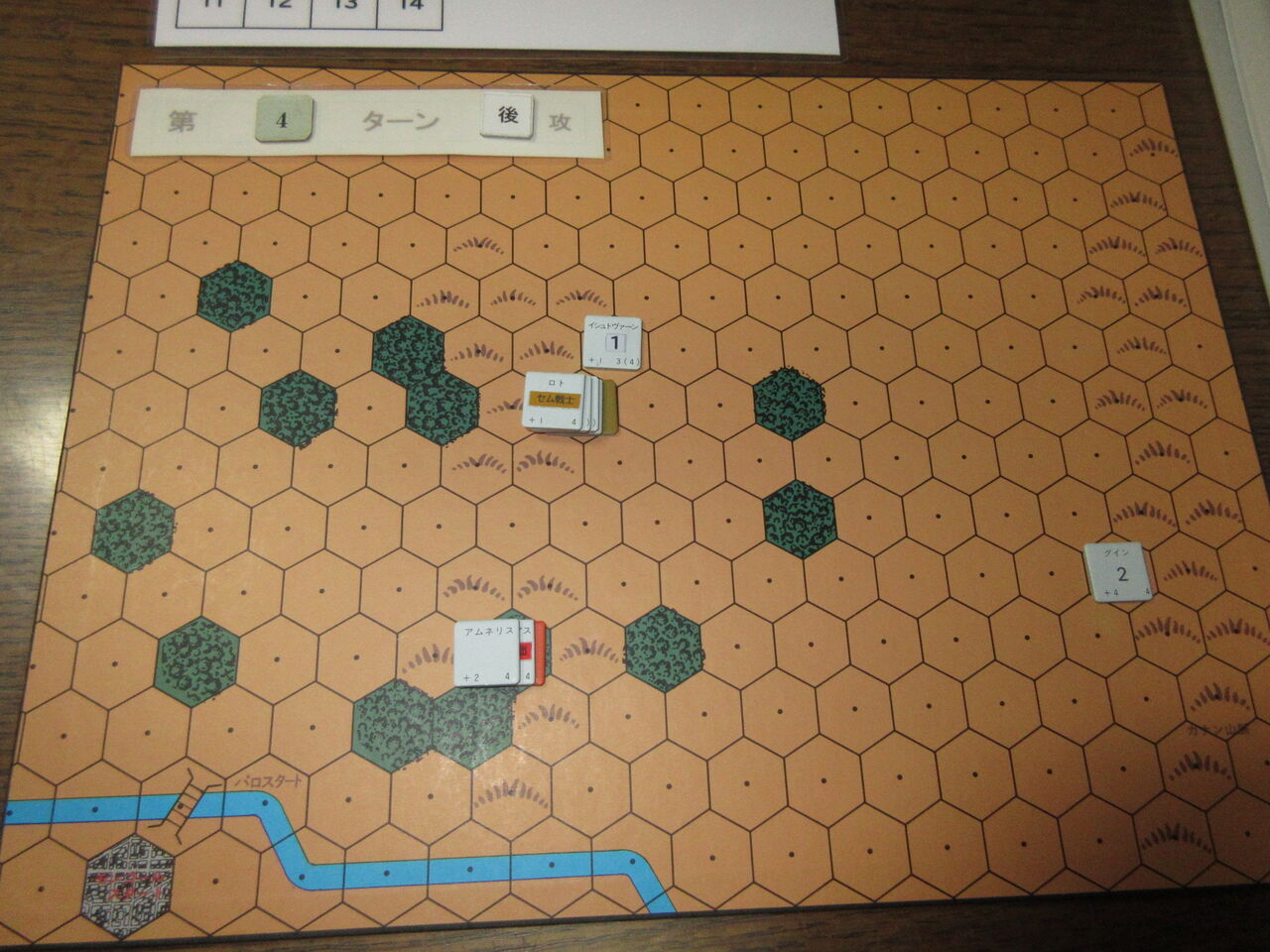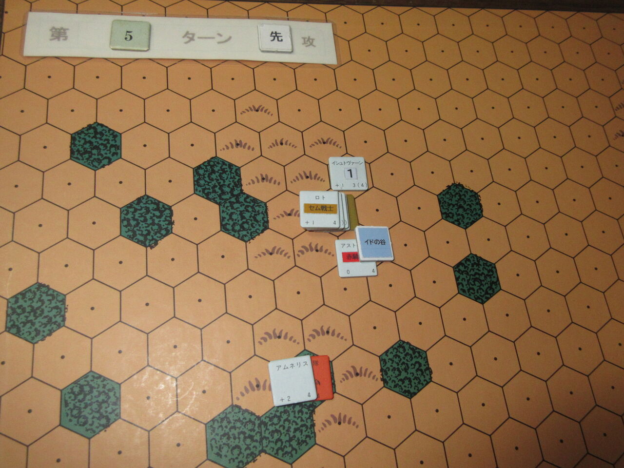 第4ターン、パロの双生児はついにラク谷へ到着します。焦るモンゴール軍は、なおも森林を進みますが、再び襲いかかるグールに足止めを喰らいます。このていたらくに、アムネリスの憤懣はピークに達します。「どいつもこいつも、赤騎士隊は腰抜けか!!」