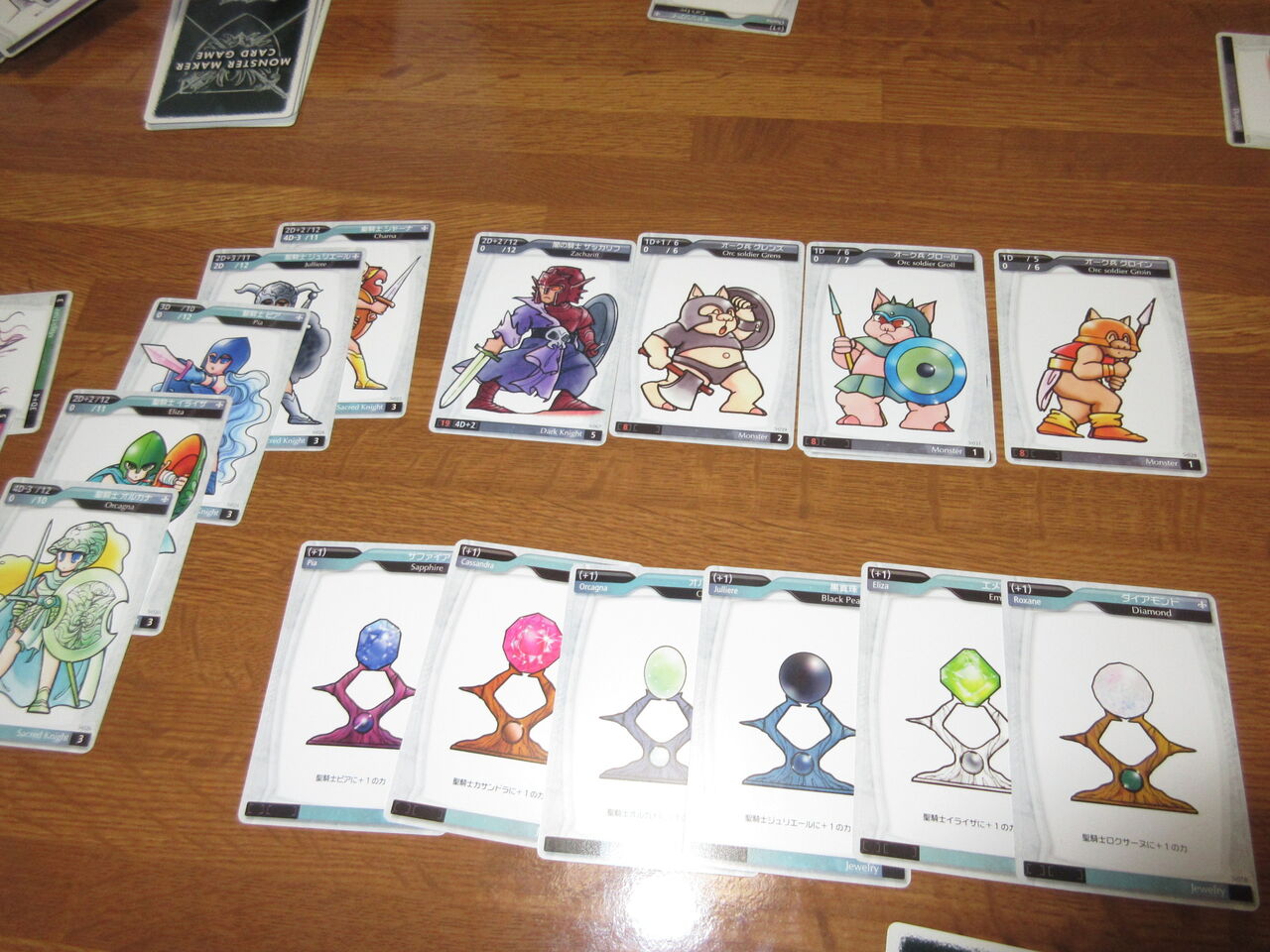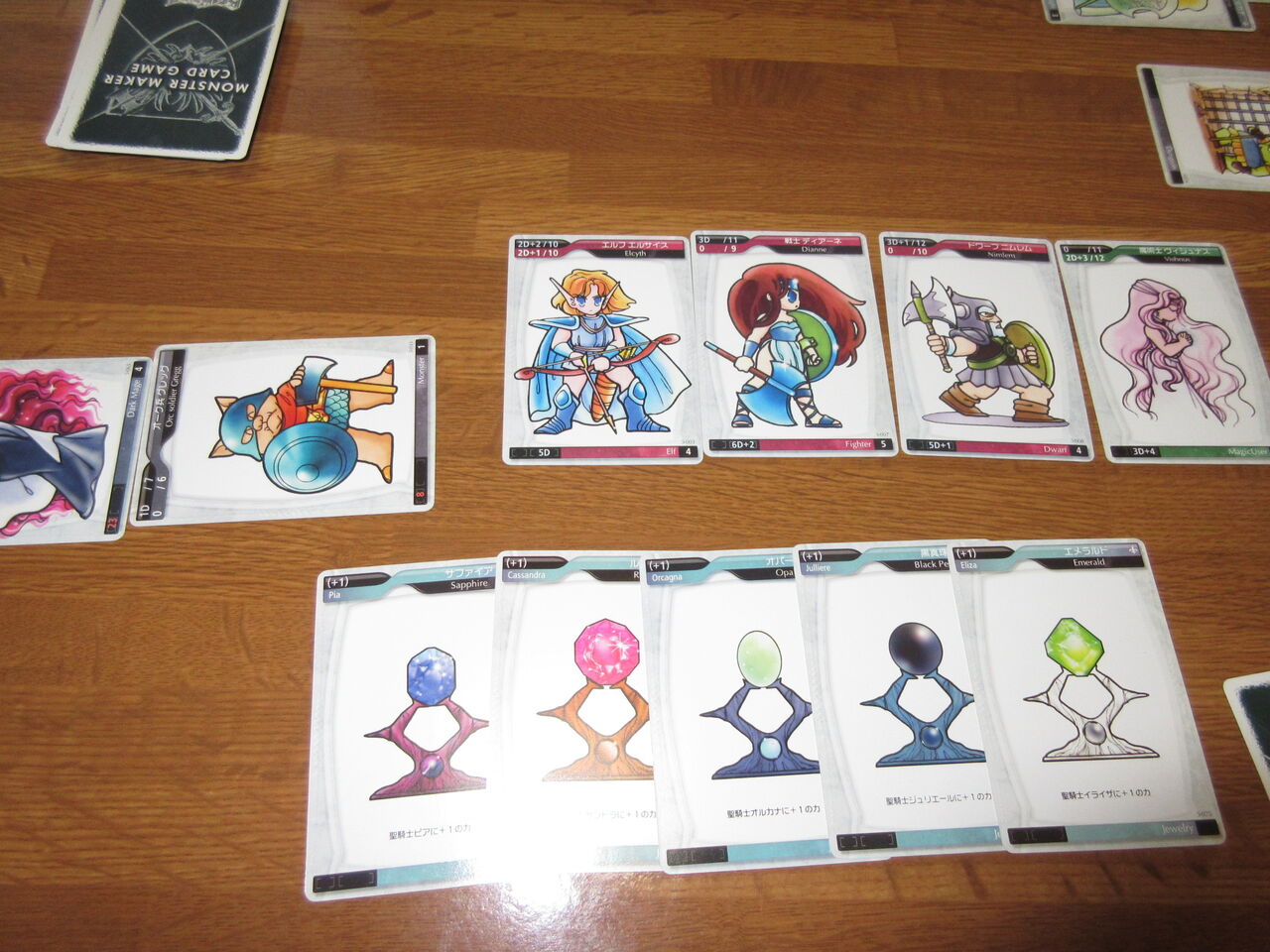 各プレイヤーは、闇の軍団と光の軍団(聖騎士及びモンスターメーカーキャラ)のいずれかを担当し、7つの宝を守る戦いを繰り広げます。これまでのアイテムと違って、先攻・後攻の順に1対1の戦闘を行います。また、各キャラは使い捨てでなく、生き残れば、場に戻ります。各キャラには、近接戦闘力と魔法戦闘力があり、それぞれの得意分野があります。