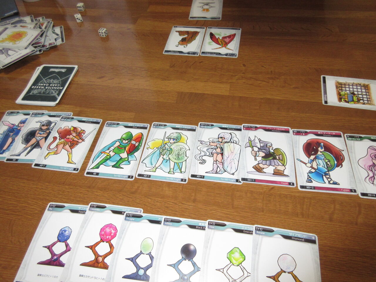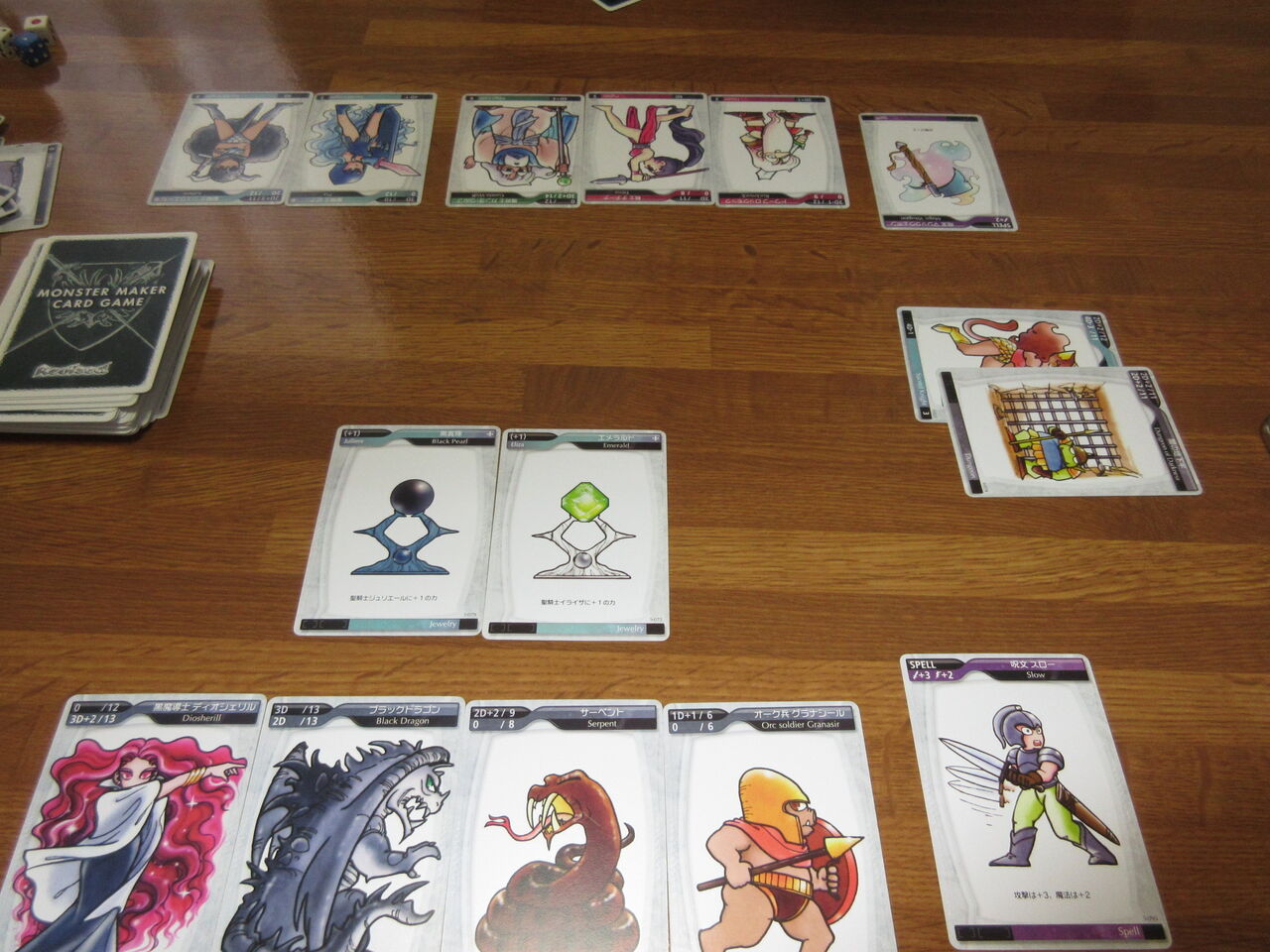 カード引きでどうしても数を揃えられないBIBI陣営は、少数の聖戦士で揺さぶりをかけたり、ヒューマン系でない巨大ネズミやナメクジ(これが存外強い)などで、連続攻撃をかけたりします。が、mitsu陣営は終始、優勢だった魔法攻撃で対抗し、オーク隊を全滅されるも、闇の騎士団は盤石。最後まで6つの宝石を守り抜き、勝利しました。