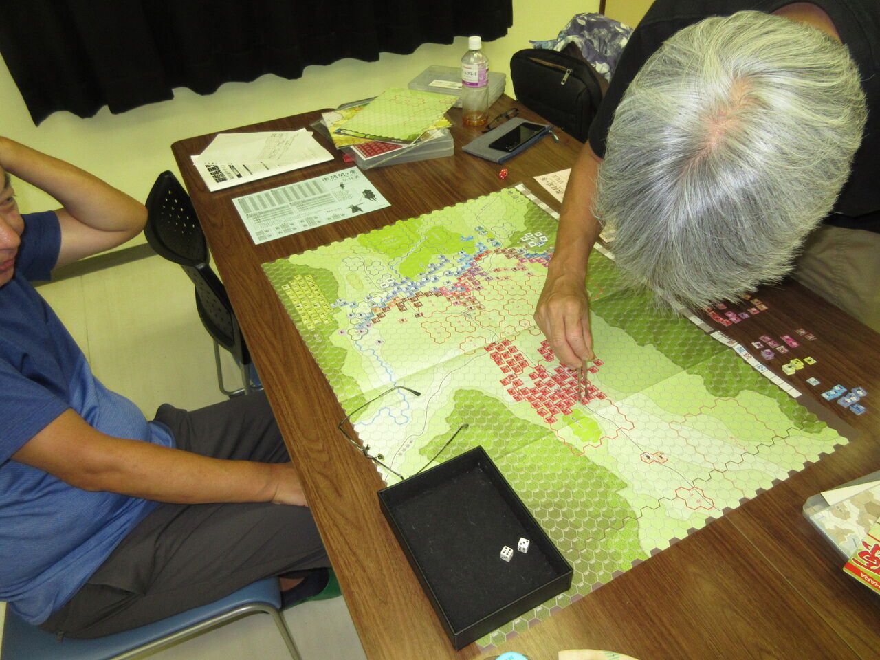 日本好きのJさんと若月さんが、再版したばかりの「激闘 関ヶ原」(GJ)から「裏切りの関ヶ原」を対戦。西軍(若月)が主要陣地でがっつりと守り、街道を堅守。東軍(J)は家康本隊を投入するも、到着まで時間がかかり。それでも、小早川隊の参戦とともに、猛攻撃に移りますが・・・宇喜多隊が円形防御陣を引いて、小早川隊を押しとどめます。