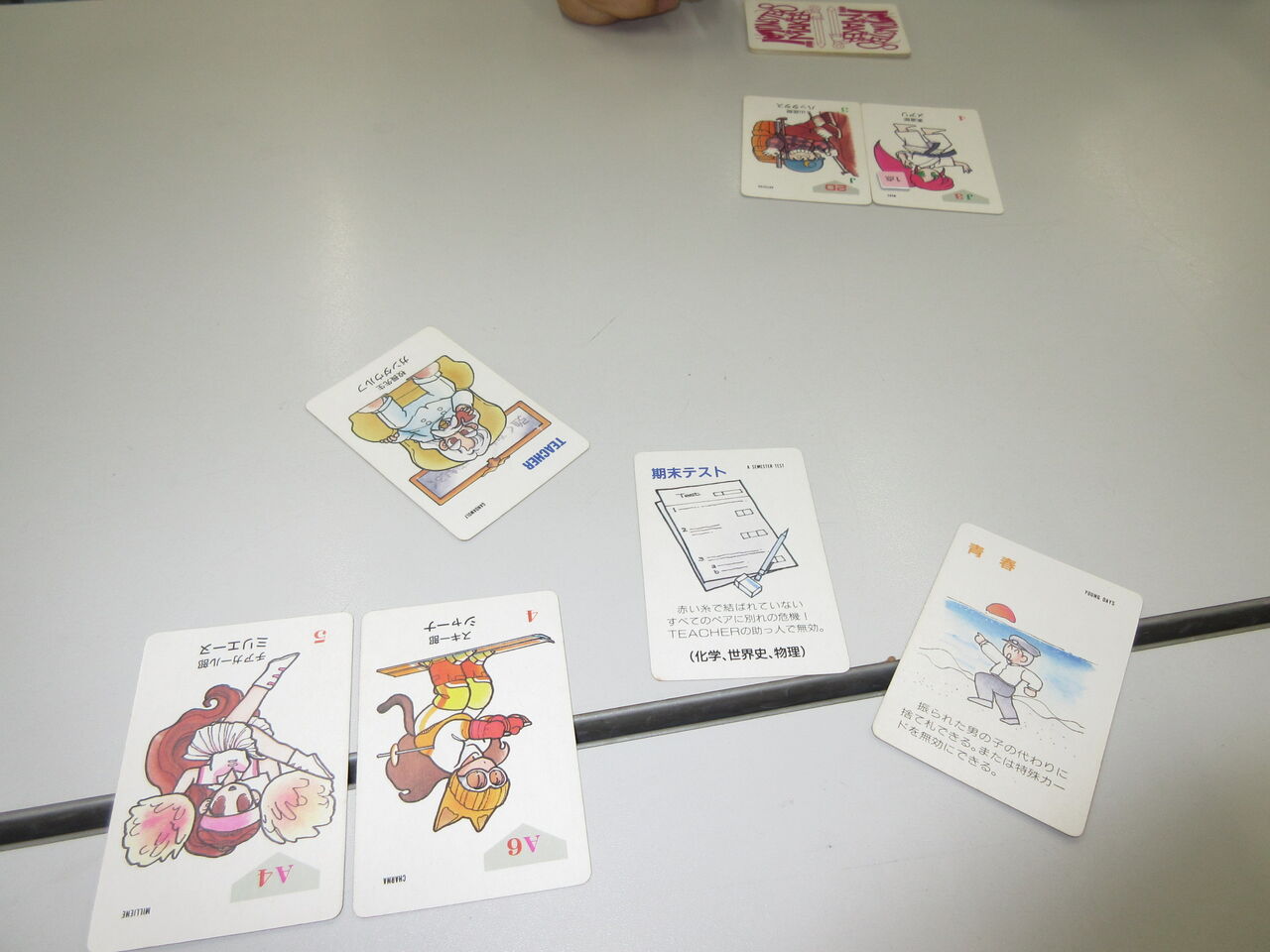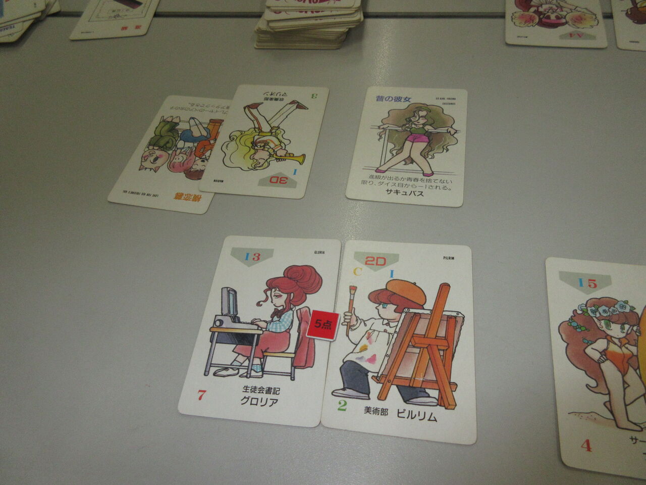 男子もタイプを持っていて、同タイプの女子(憧れ、だいたい自分の趣味や容姿と逆)にのみ、アタックができます。容姿端麗だが見栄(得点)も高い生徒会長(リンク)とか、地味で奥手の漫画研(グルルフ)とか。勝負は男子の魅力点数分のdrをして、1つでも女子の惚れやすさ以上のdrが出れば、カップル成立です。アタックを成功させやすいように、プレゼントや二股がけ、手当たり次第、ナンパなどの特殊カードもあります。