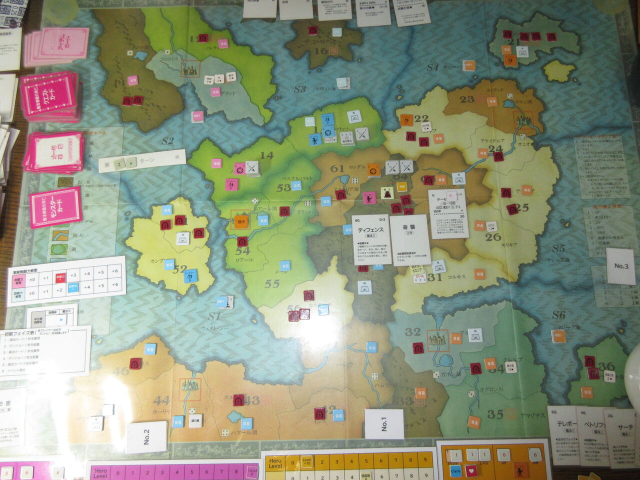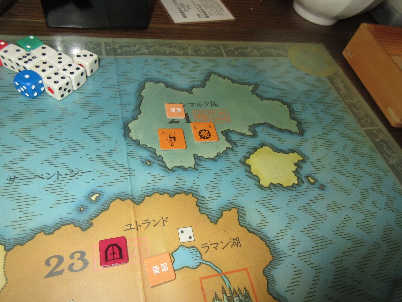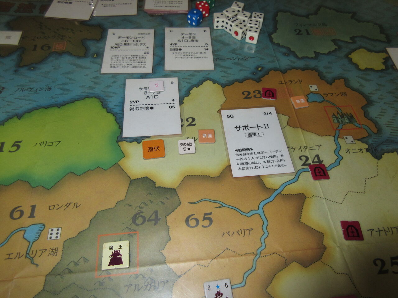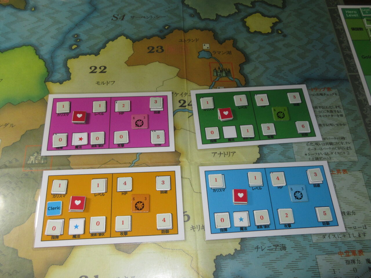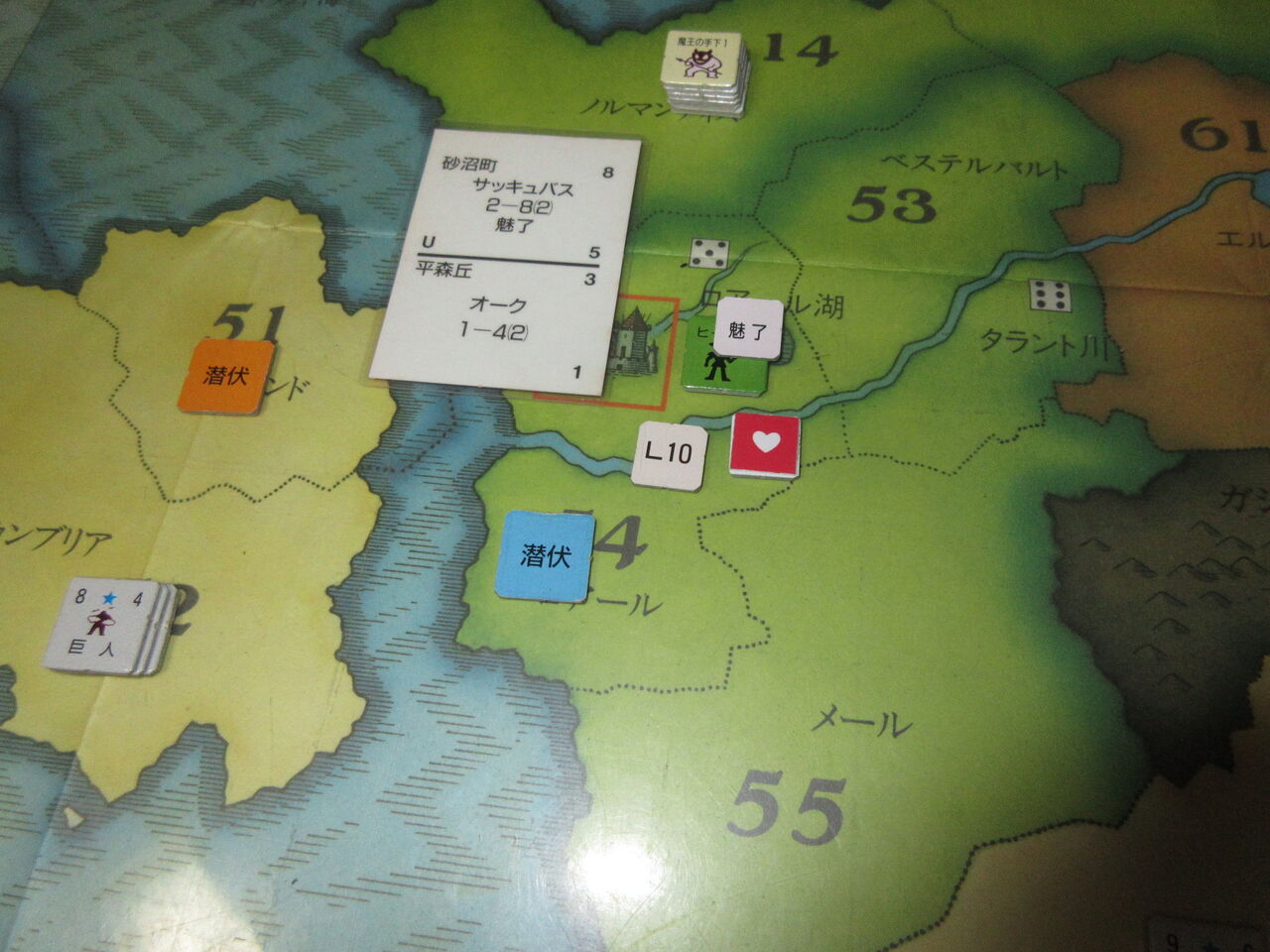 第2ターン、遅れていた橙(クレリックの下級魔道士)が吸血コウモリを倒して、全員がL2へ。と、赤(上級魔道士)は魔王の手下に領国を削られるも、タランチュラを討って、L3へ。緑(戦士)はウルフを狩るもレベルが上がらず、焦ってサキュバスに挑むもこれに魅了され、僕(しもべ)となってしまい、1回目の死亡となります。