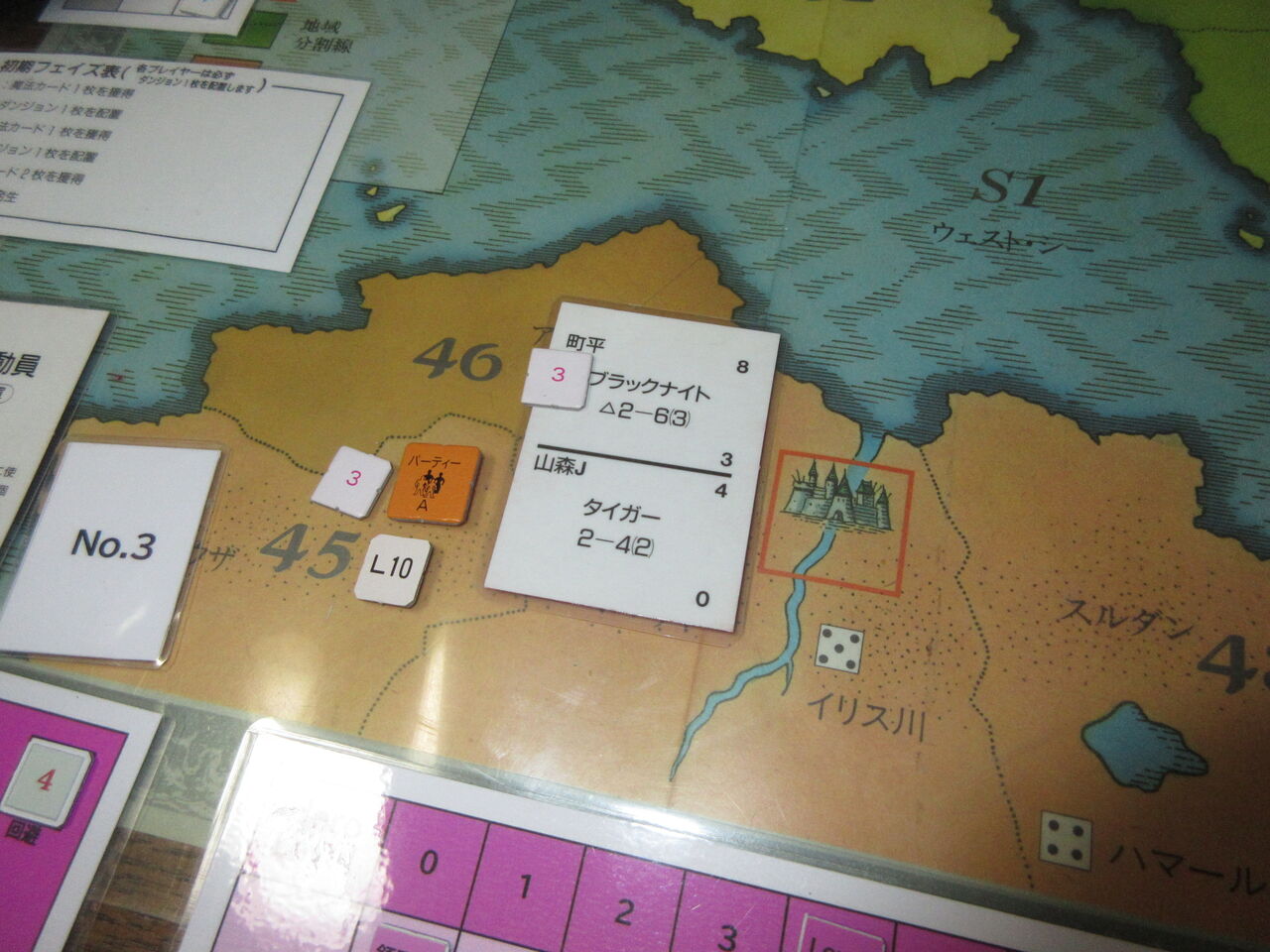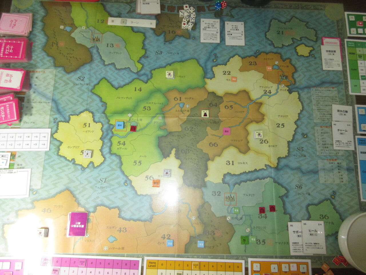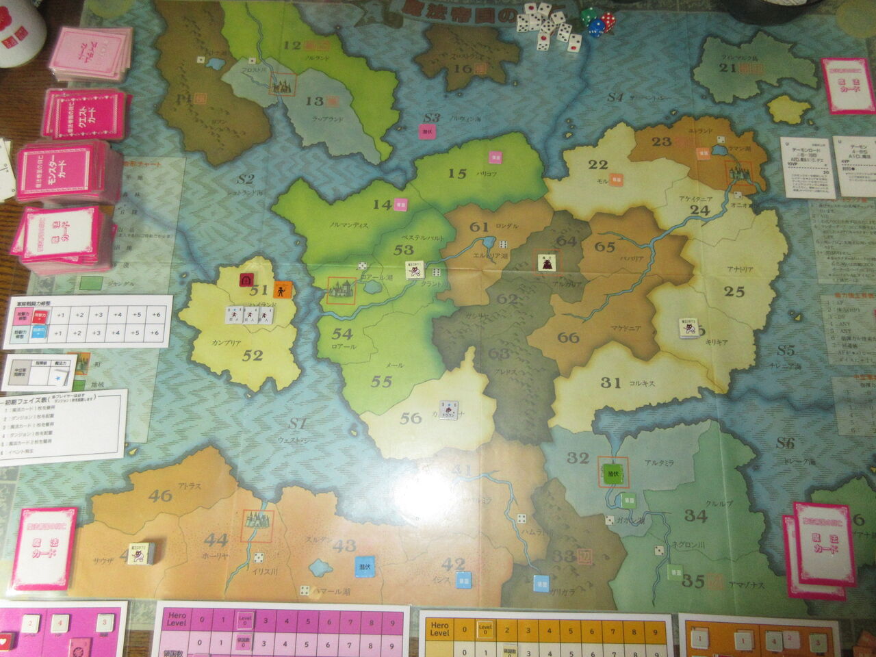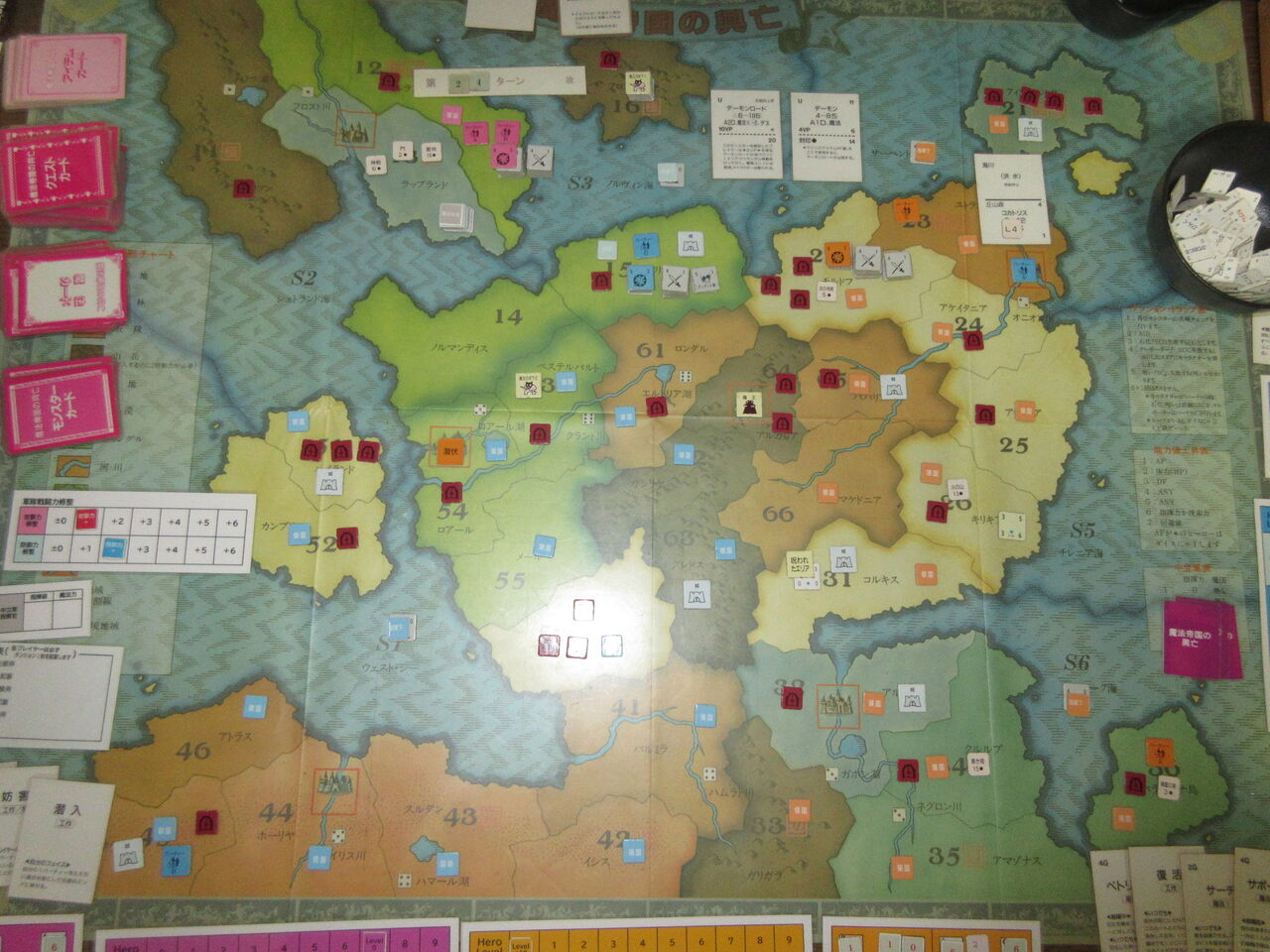 第2ターン、遅れていた橙(クレリックの下級魔道士)が吸血コウモリを倒して、全員がL2へ。と、赤(上級魔道士)は魔王の手下に領国を削られるも、タランチュラを討って、L3へ。緑(戦士)はウルフを狩るもレベルが上がらず、焦ってサキュバスに挑むもこれに魅了され、僕(しもべ)となってしまい、1回目の死亡となります。
