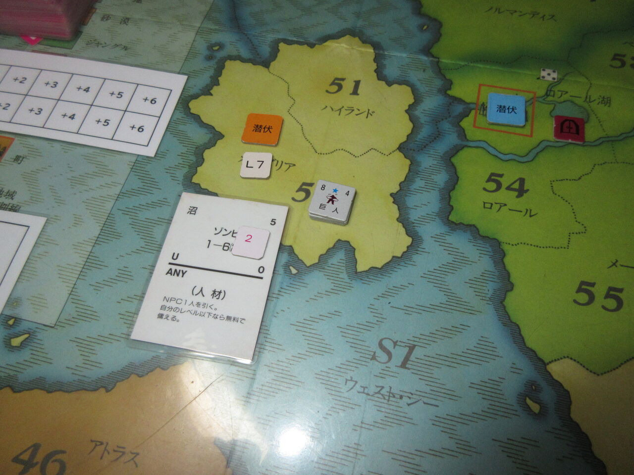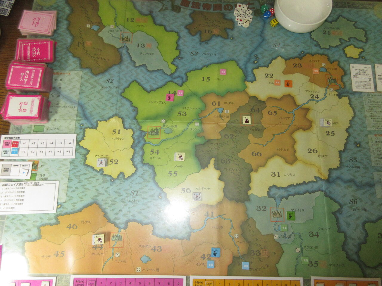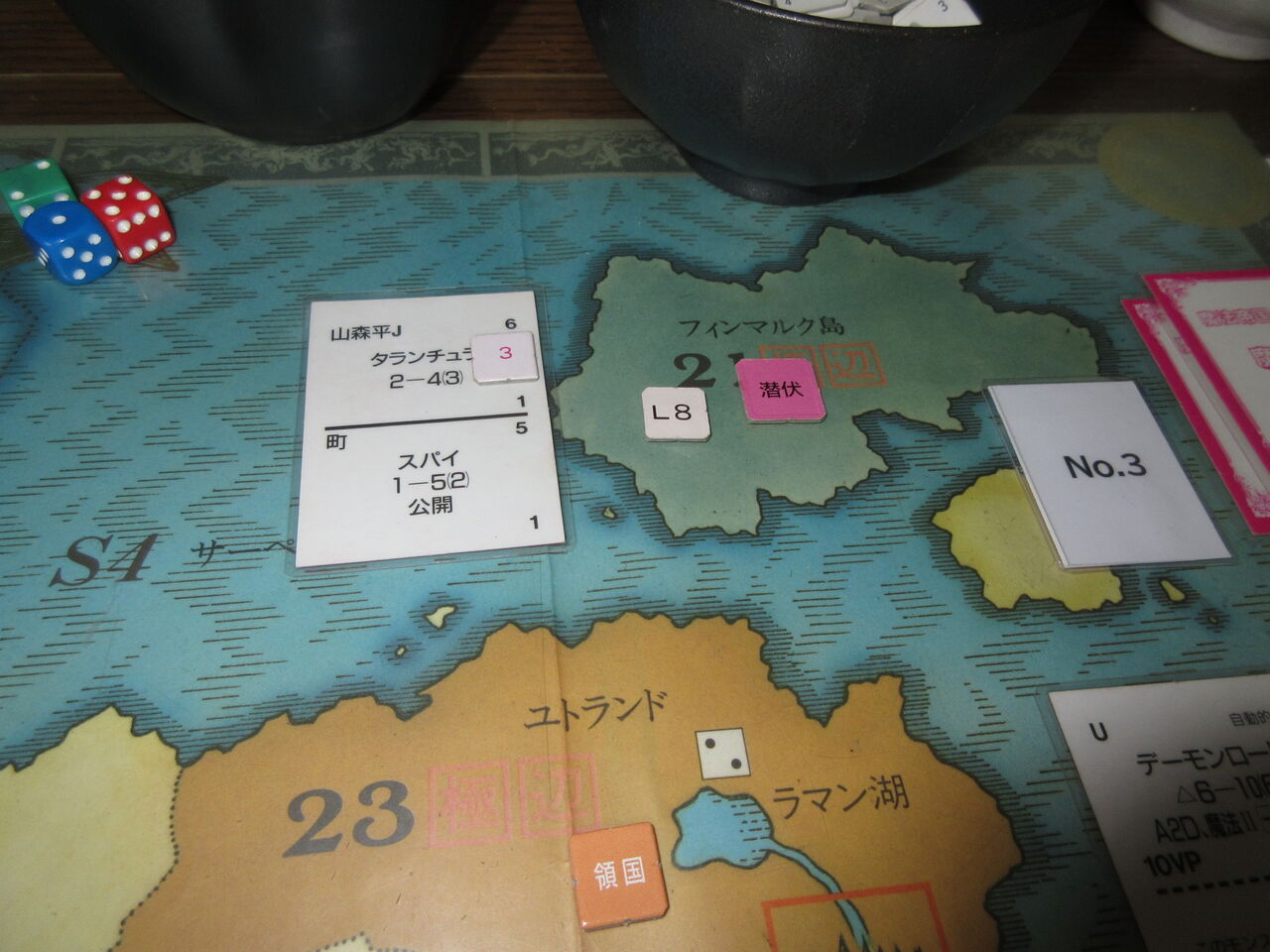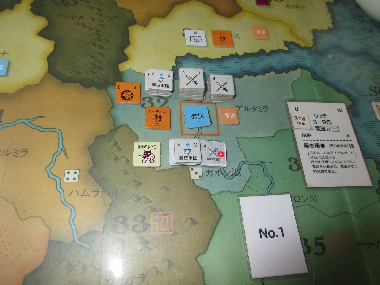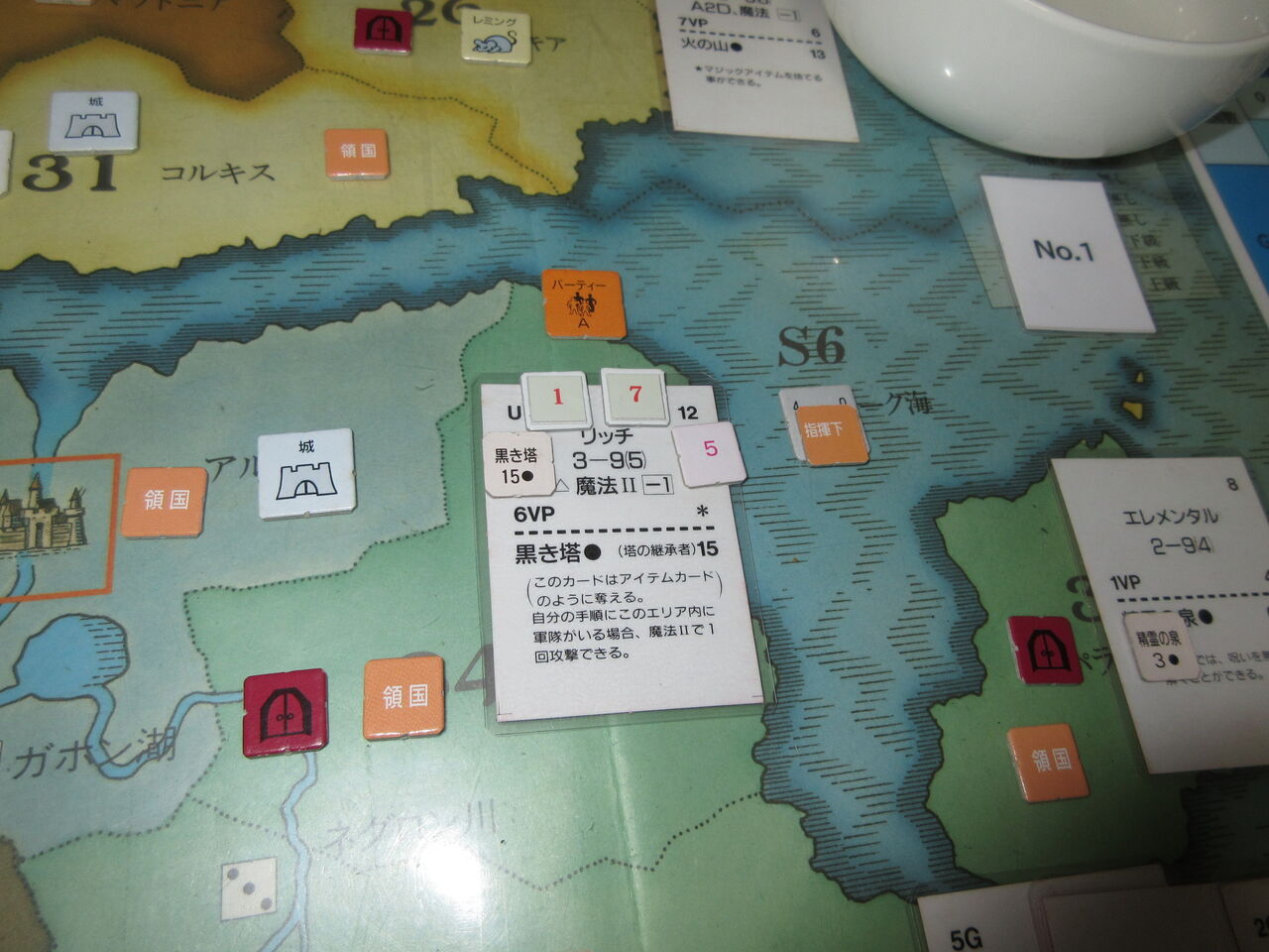 第2ターン、遅れていた橙(クレリックの下級魔道士)が吸血コウモリを倒して、全員がL2へ。と、赤(上級魔道士)は魔王の手下に領国を削られるも、タランチュラを討って、L3へ。緑(戦士)はウルフを狩るもレベルが上がらず、焦ってサキュバスに挑むもこれに魅了され、僕(しもべ)となってしまい、1回目の死亡となります。