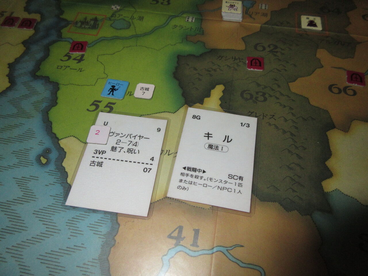 このラスボスは、大陸のど真ん中のエリア64に鎮座しており。その能力は、スペシャル・モンスターでも群を抜きます。攻撃力は6で二回の連打が可能で、防御力は最大の10。魔法攻撃として、A2Dに、魔法Ⅱ(回避判定-2)、デス(!!)、しかも自身には魔法が効かない(!)という凶悪さ。並のヒーローではとても太刀打ちできないため、特別ルールで回復に制限がありますが(ダメージは累積で、毎ターン1ポイントのみ回復)、マジックアイテムや魔法カードを集め、何度か命を落とすことを覚悟で、連続攻撃をかけるしかありません。