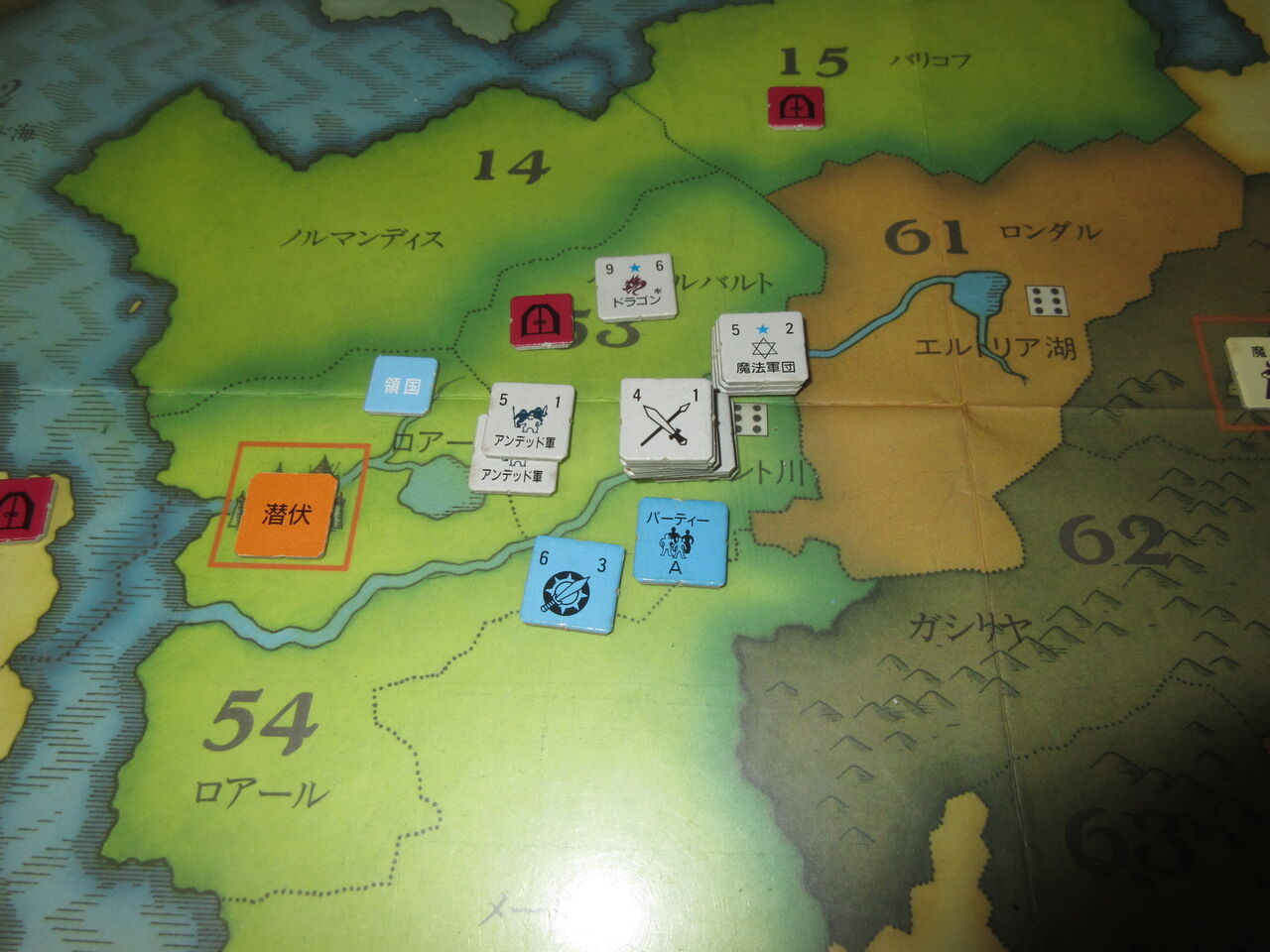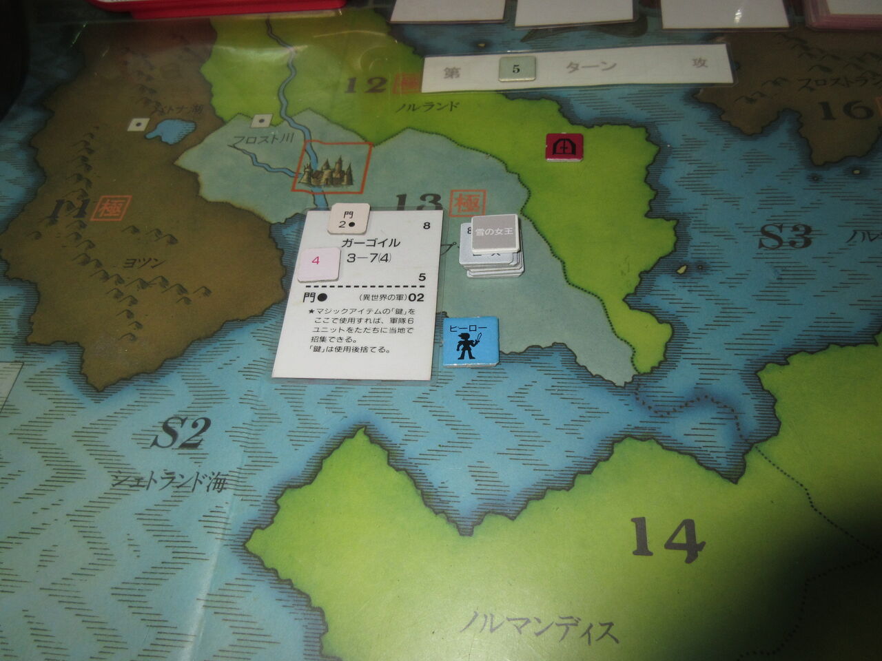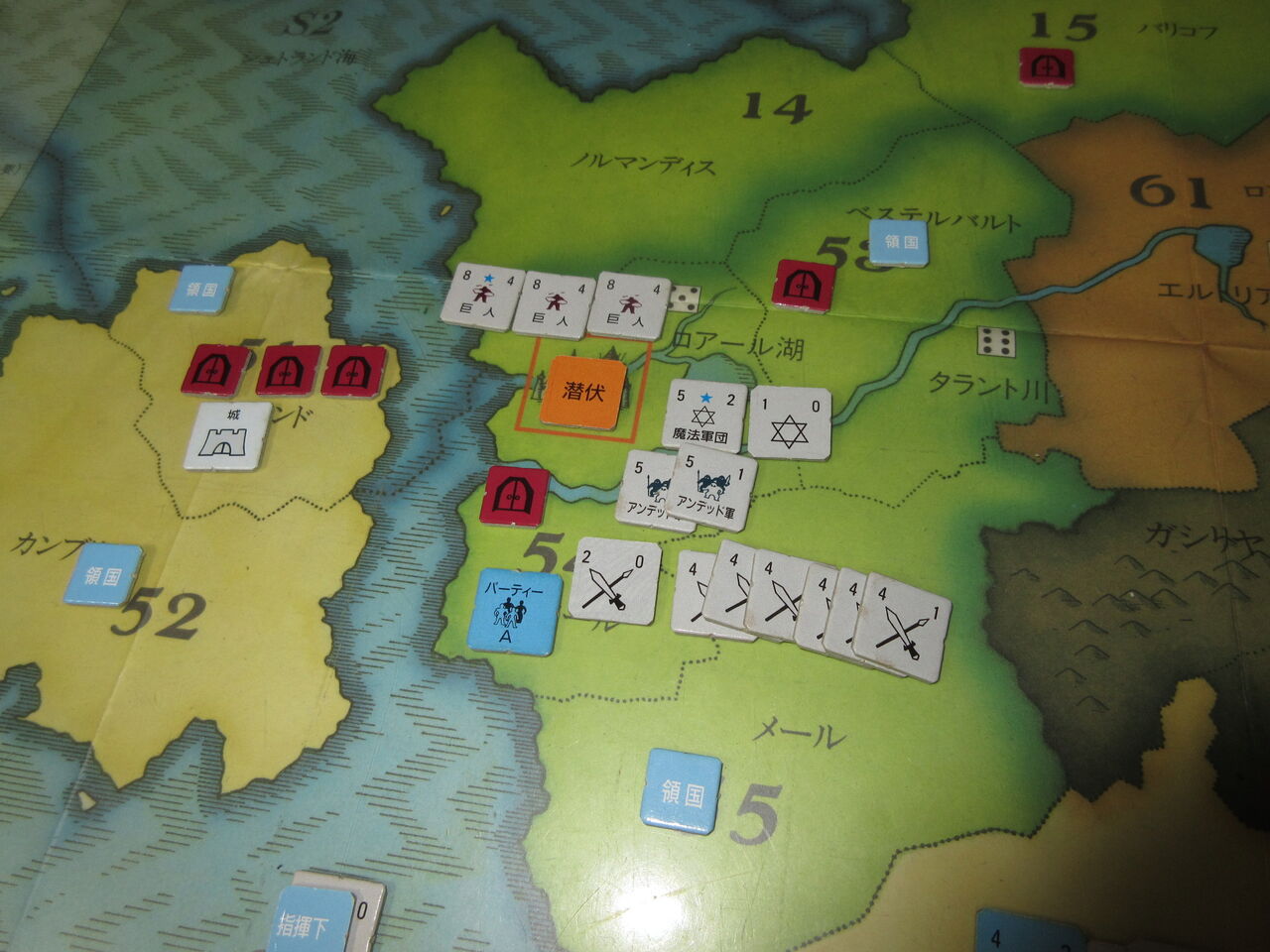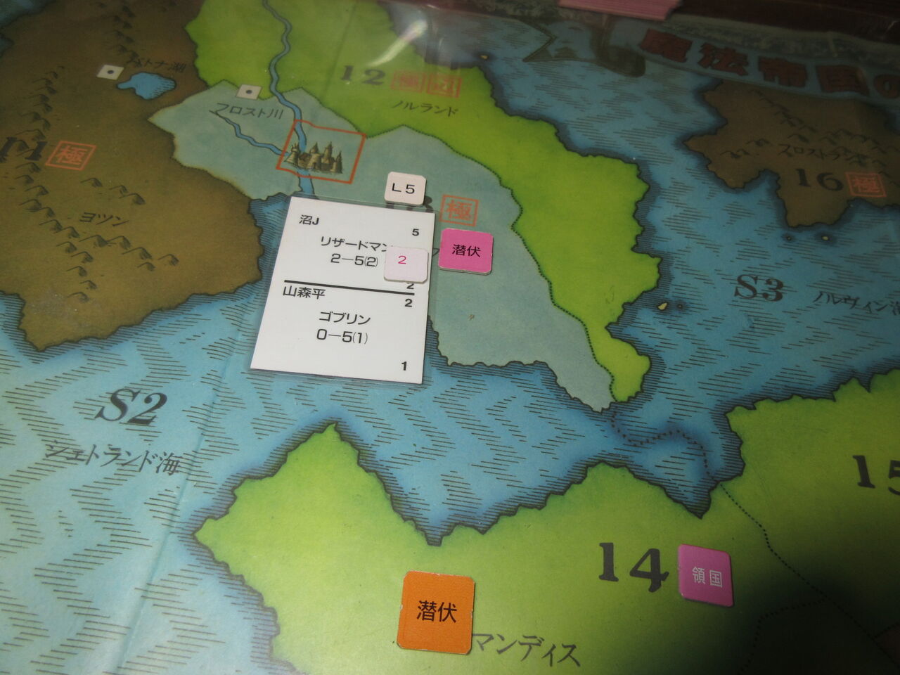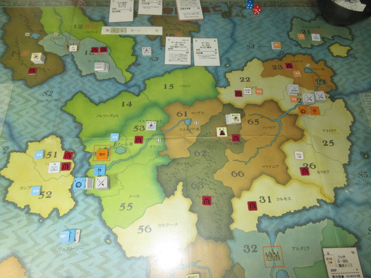 さすがにここからは通常のダンジョン探索では成長が難しいため、領土拡大を目指す陣営が出ます。第14ターンに橙(クレリックの下級魔道士)が、敵の襲来がほぼないサンマルク島(エリア21)で旗揚げをし、海軍を含めて、20軍団+6魔法軍団を編成します。これを持って、本大陸に上陸をし、北部のエリアを支配していきます。