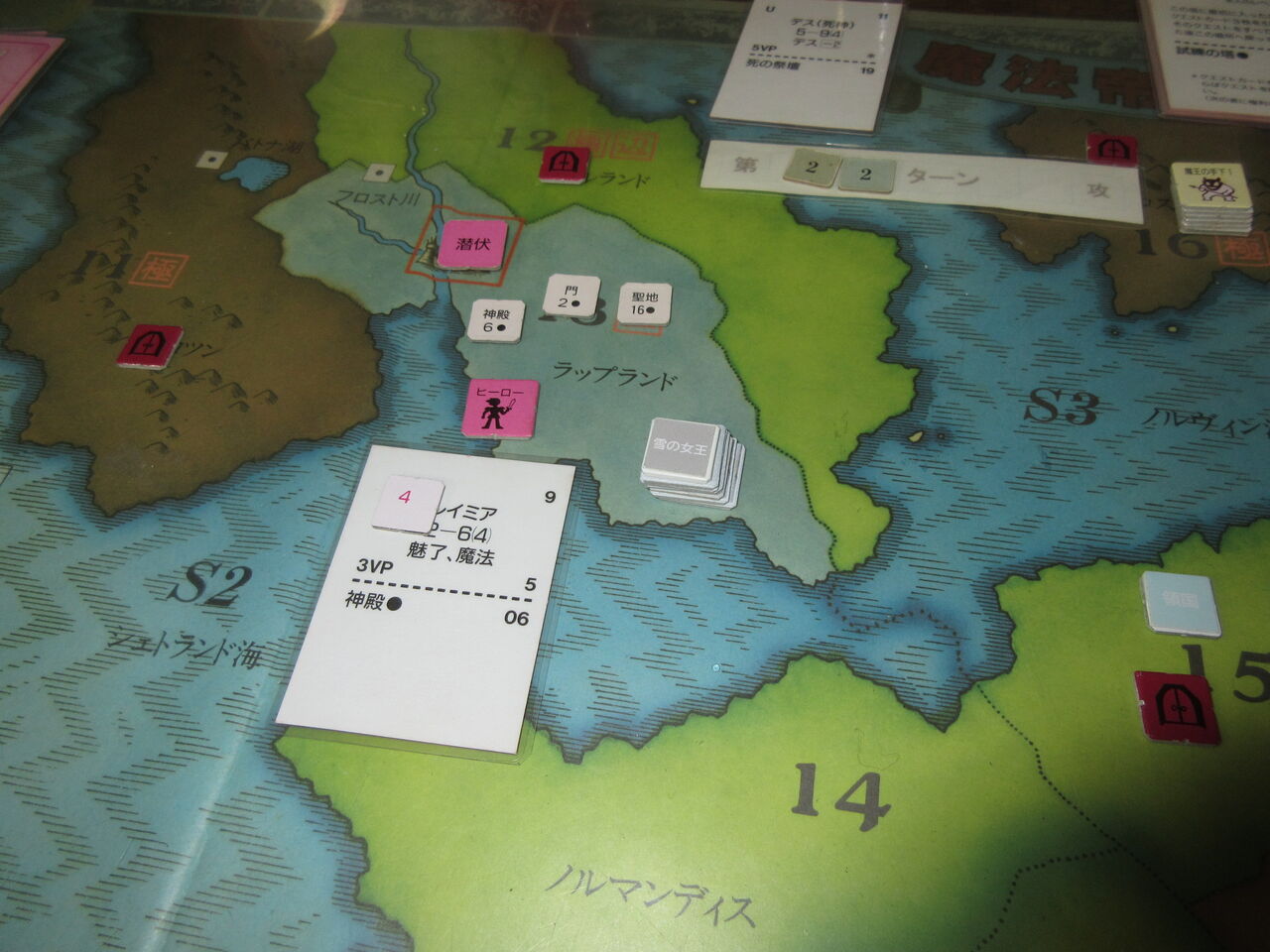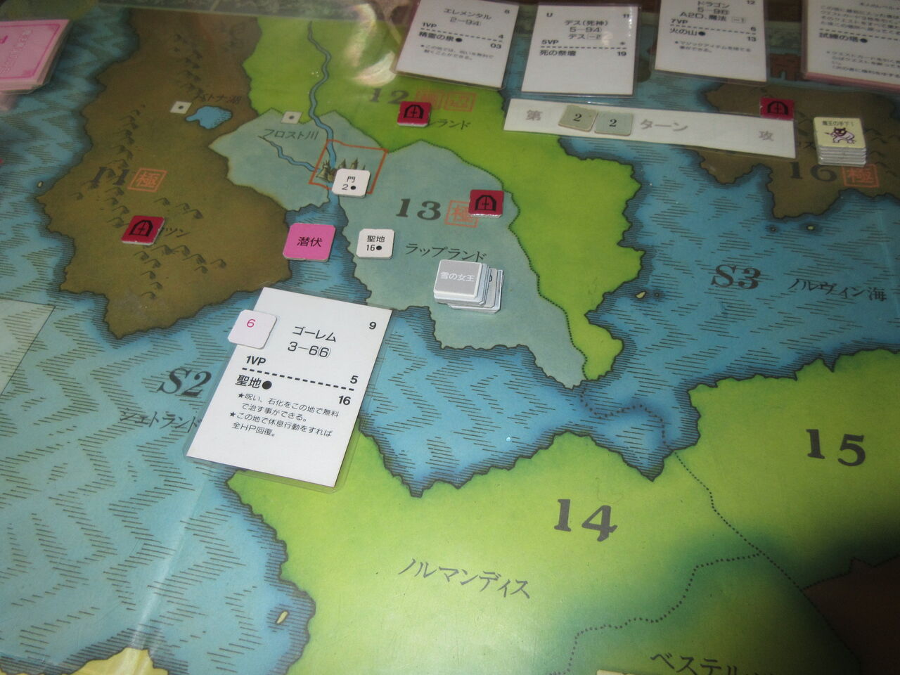 一方、遅れがちだった赤(上級魔道士)も、最後のモンスター狩りに。ゴーレムとレイミアを撃ち倒し、北の大地で旗揚げをします。ここには「雪の女王」(隣接エリアまでの軍隊を混乱)がいるため、かなり厳しかったのですが、「疫病」で敵も混乱させ、上級魔法で雪の巨人を討ち取り、女王軍団を粉砕します。第26ターンに、残りの2カ所を平定し、こちらもL9に辿り着きます。