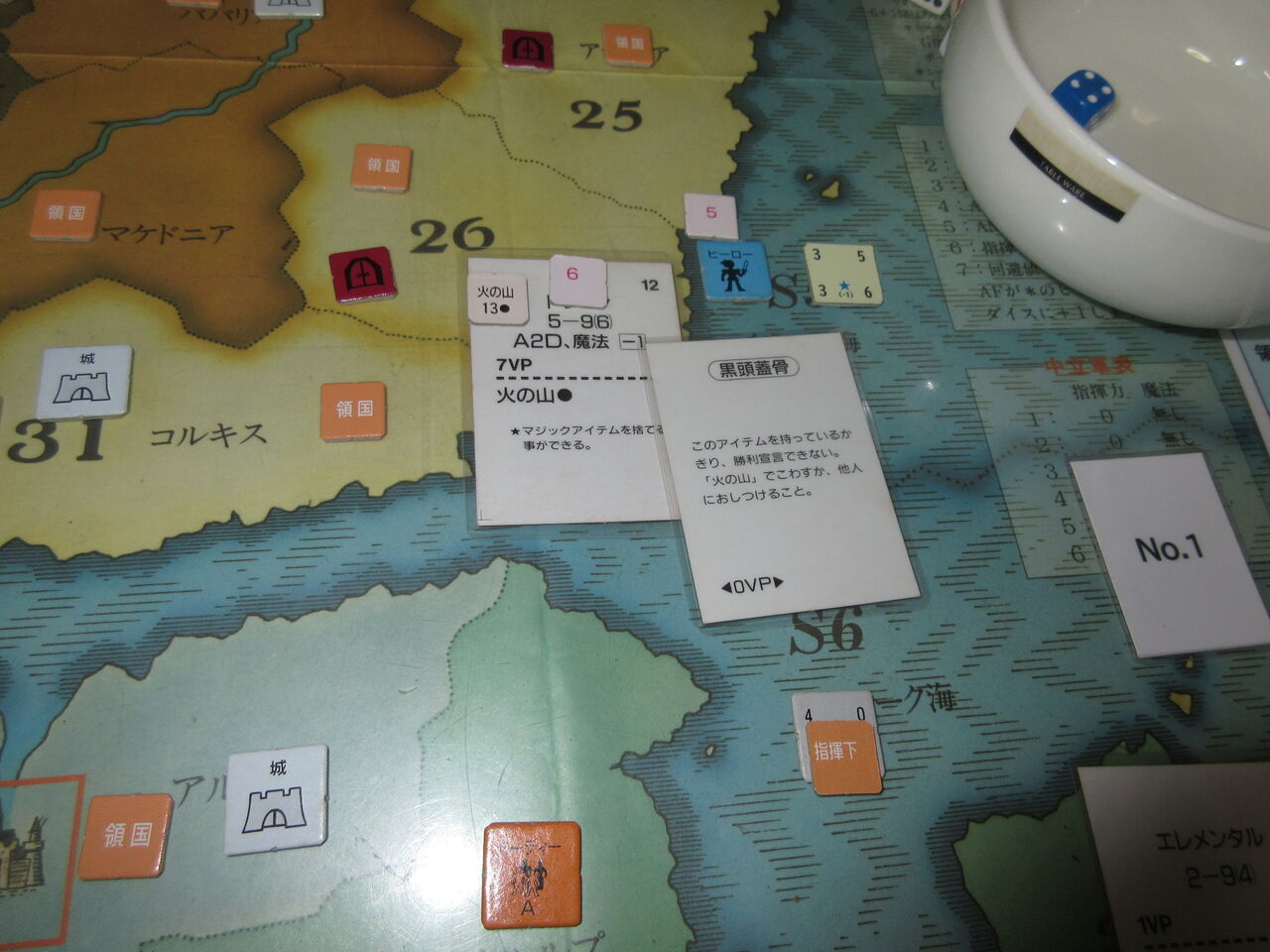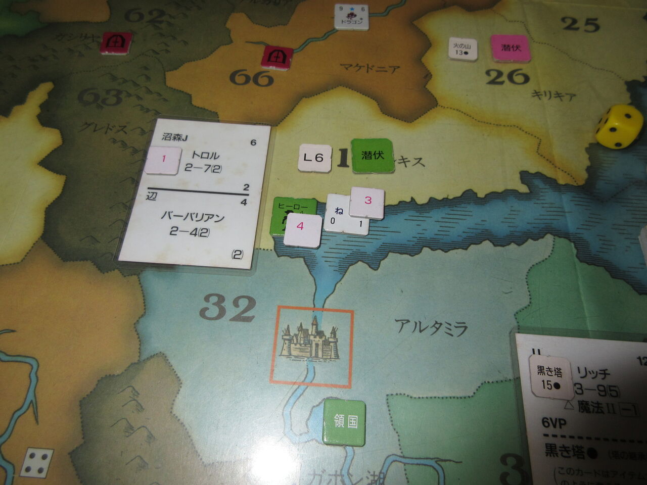ここから、ゲームは終盤へ。青(下級魔道士/戦士)は第21ターンに13個目の領土を獲得し、L11に到達します。ほぼ、個人戦闘能力としては上限近くに達します。ここで、敢えて最強の部類のスペシャルモンスター-ドラゴンに挑みます。高い白兵戦能力と先制攻撃力、魔法攻撃を持つ龍との死闘は、ギリギリのところで、ヒーローの勝利に。勝利した青(下級魔道士/戦士)は、火の山に呪いのアイテム「黒頭蓋骨」を投げ入れ、永久に葬り去ります(これがあると、勝利宣言ができない)。