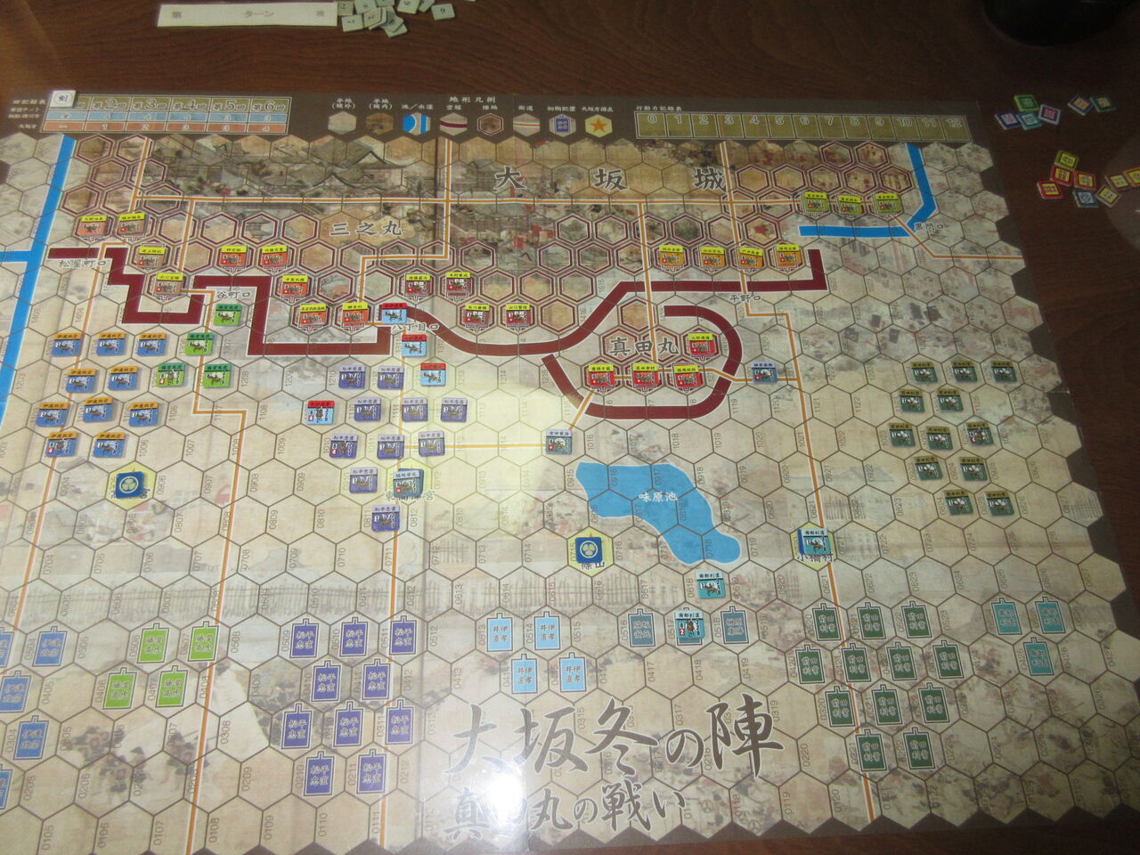 折からの日本史ブームに肖って、プレイ準備を進めていた大坂の陣の2作をプレイ。「幸村外伝EPISODE-0」は「幸村外伝」(ツクダ/GJ)の正当な後継者で、道明寺合戦と八尾・若江合戦が手堅く再現されています。「講談級大坂の陣」(GJ)は一見、猿飛佐助や雲隠才蔵などの真田十勇士チックな設定に敬遠される向きもありでしょうが、展開はチットドリブンで至ってまとも。ほとんどはソロでしたが、大坂冬の陣をプレイできるのも、これしかないと、Jさんと対戦にこぎ着けました。