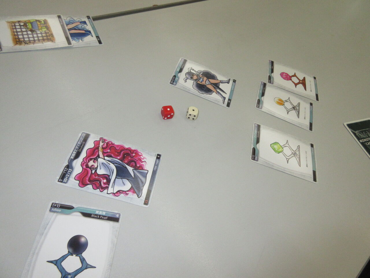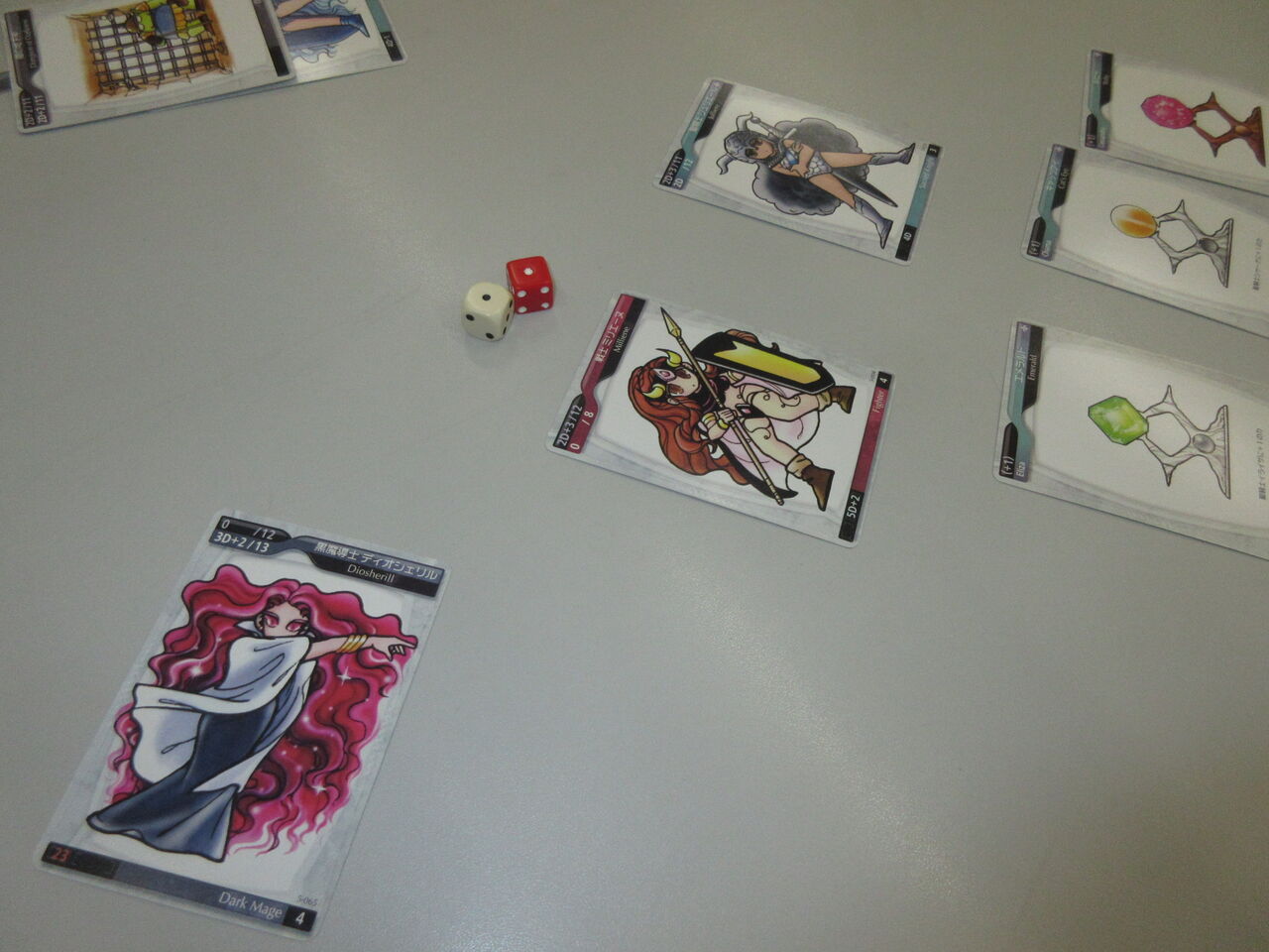 中盤になっても、この傾向が続き、全然、勝利条件のお宝が来ない!そのうち、呪文カードが手札を圧迫する(!)という、かつてない事態に。ついに、闇同士の抗争が勃発。oha陣営がmitsu陣営に攻撃をかけてきますが、なんとかこれを撃退。すると、oha陣営はしょうこりもなく(?)ゆいしか陣営を襲撃。全キャラを攻撃できる魔法も使ったため、三者ともに疲弊します。