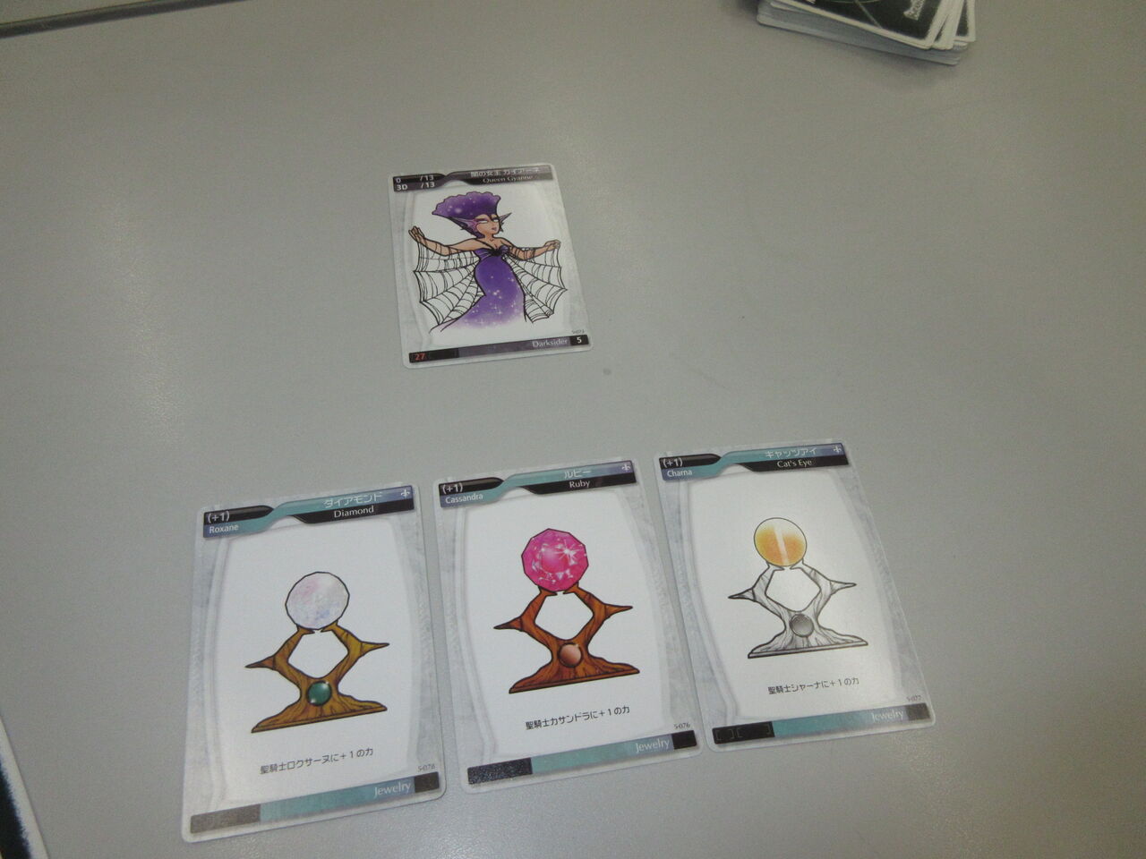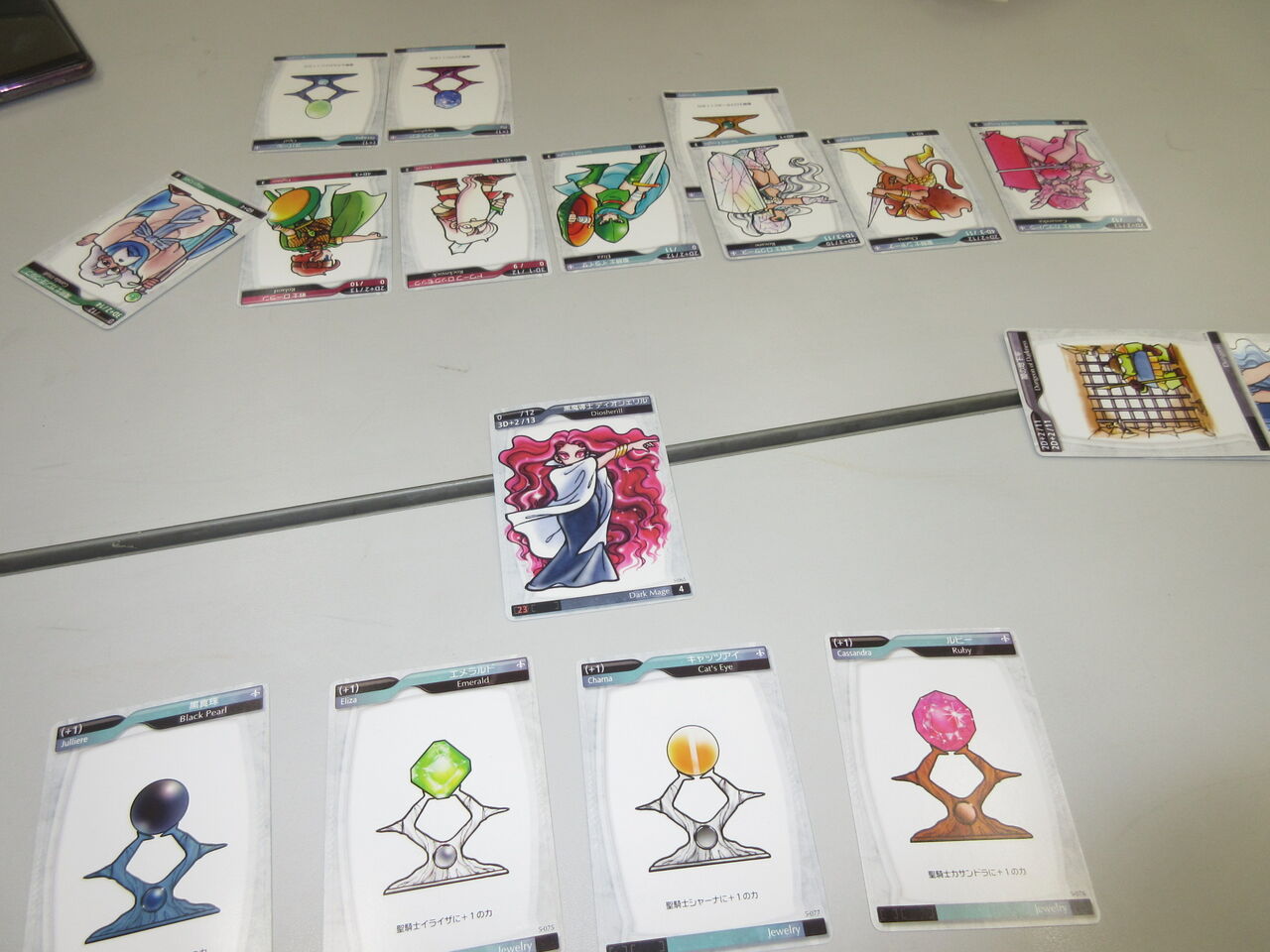 序盤、ゆいしか陣営のみが聖騎士を手に入れて、光の軍団となります。が、これも途中で、闇カードが増えて、お約束の闇墜ちに。これで、三陣営とも闇軍団となり、まだ見ぬ宝珠を求めて、軍団を増強します。