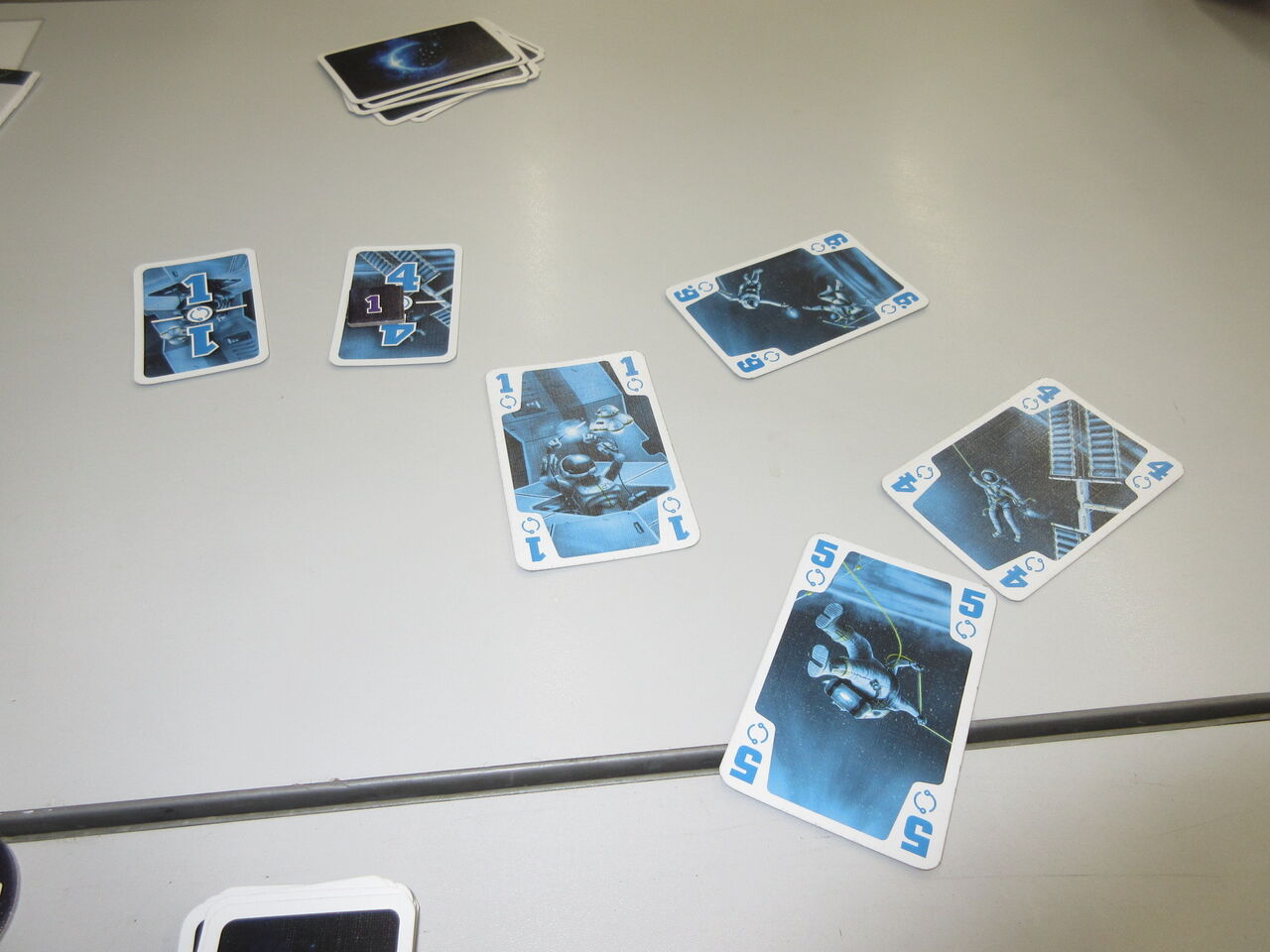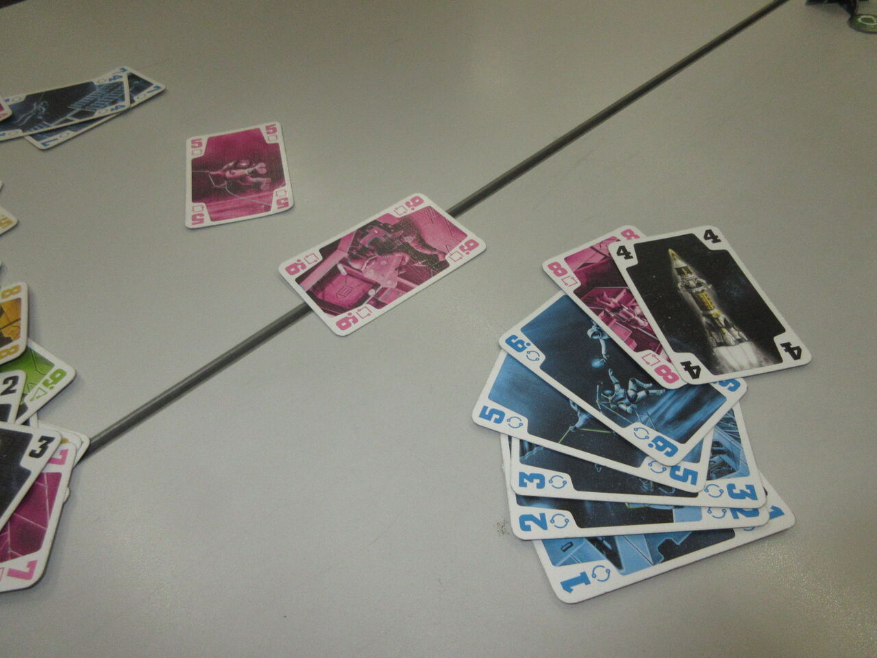 その後は、通信機器の故障設定を超えて、ついに宇宙へ。無事に月軌道に到達します。が、ここで、概念を変えるカード1(最も低いカード)で勝利するミッション9に(回路基板の損傷)。これもあと一歩まで行ったものの、1回目は失敗。が、すぐに修整案を話し合い、通信もフルに活用して、最終トリックで成功!