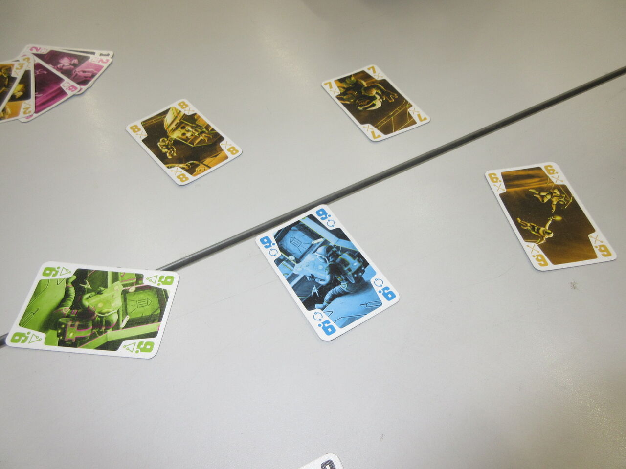 ただし、自分が失敗の原因になりたくないのは人の心理で、ミッション5で船長が良いか悪いか、みなの体調を確認したところ、風見鶏さんが悩んだ末に「う~、そこそこです」。いや、気持ちはわかるけど、良いか悪いかしかないですから(笑い)。結果は、「(どちらかというと)悪い」に。ここでは、全10回のトリックを行い、具合が悪いと判定された1名が勝利しないこと(!)が条件になります。自分も、勝てそうな手札が少なかったので「悪い」にしたのですが、選ばれたのは風見鶏さん。みなが協力して、いいとことまで行きましたが、9つ目のトリックで「勝ってしまい」、ミッション未達成に。が、次は、全員が慎重にプレイして、無事にクリア!