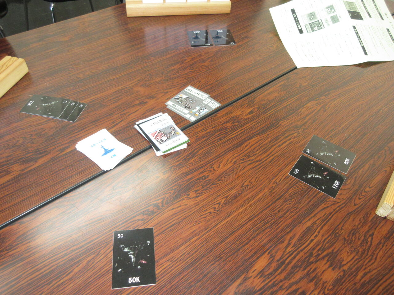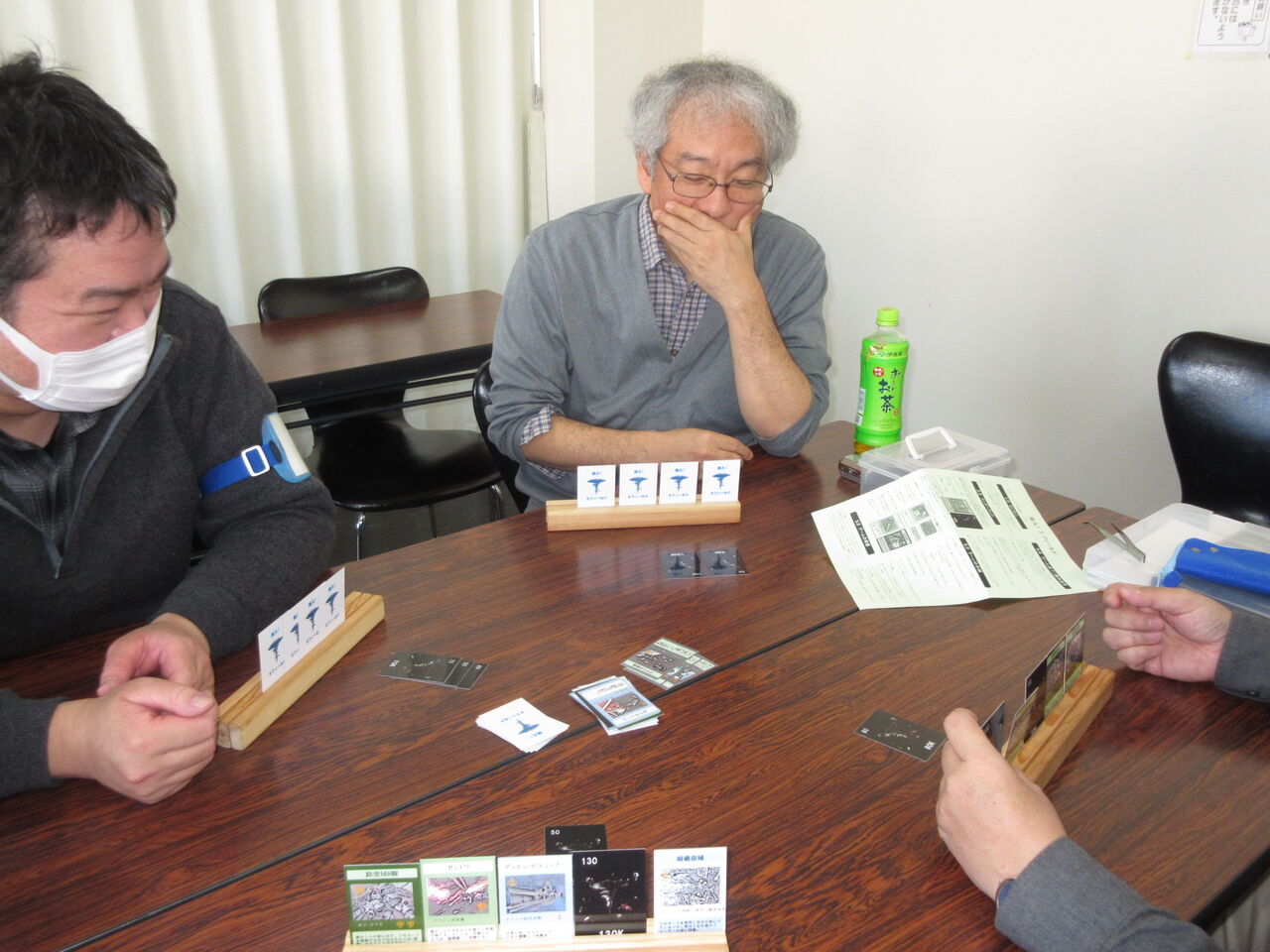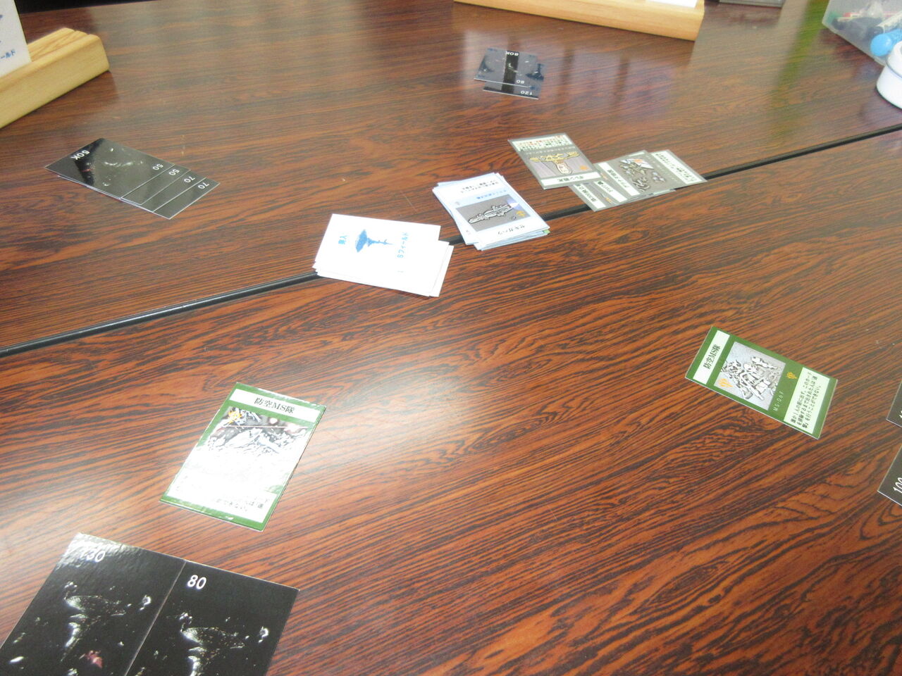 お昼から戻ったところで、str会長・syu・長門さんのプレイに誘ってもらい、「突撃?!Sフィールド」(同人)を対戦しました。その名の通り、傑作カードゲームの「突撃?!レイテ湾」(CMJ)のシステムを使ったア・バオ・アクー戦になります。敵空母はMS艦載機に、敵戦艦はムサイ級などの艦船に、自軍艦艇はマゼラン級やサラミス級になっています。同様に、「ジオン軍のMSが使えない」「ジオン軍の艦艇が使えない」「前進できない」などのイベントもあります。