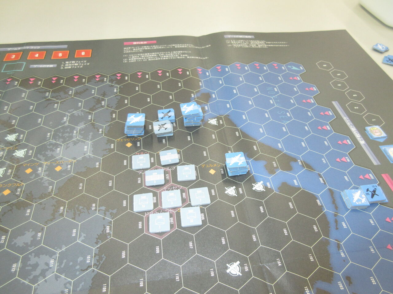 まず、セットアップですが、drにより、ドイツ軍が先配置となります。作戦行動の先手は(特別ルールで)連合軍になっており、盤端に近すぎると敵戦闘機による機銃掃射を受ける可能性があるので、主力は全て8へクス以上離れた内部に置きます。迎撃の主力となる先制攻撃ユニット(及びコメート)を北部中央に、もう一つをミュンヘン近郊に置きます。唯一、置ききれない1個戦闘機隊(4ユニット)のみをデュセルドルフ近郊の飛行場に配置します。これに対し、連合軍は西端にB-36を含む3個爆撃スタックと戦闘爆撃機スタックを配置し、北端と南端には各1個爆撃スタックを配置します。西端の1スタックのみが戦闘爆撃機の制地部隊(対SAM)です。