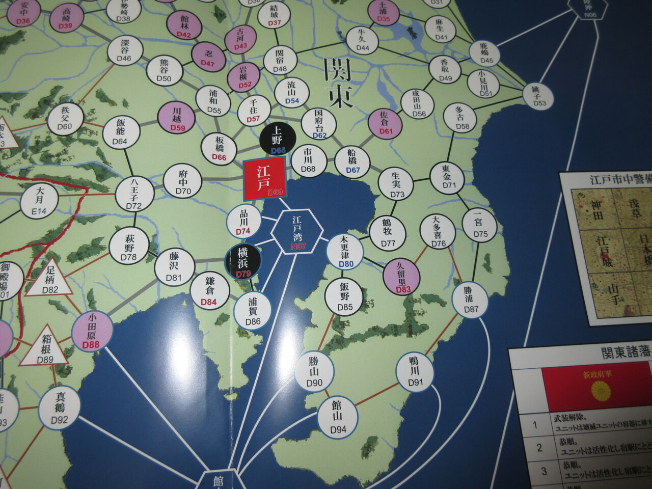まず、「1868戊辰戦争」(同人)を求めて、委託販売ブースに。辿り着いた先で確認すると「最後の1つです」えっ、まだ、1時間も経っていないのに?!どうやら出品者も想定以上の売り上げだったようで「こんなにもウォーゲーマーがいるなんて」と驚いていました。ええ、80年代の老兵は、「深く静かに」潜伏しているんです(笑い)。最高レベルの戊辰戦争の評判通り、大きなマップに2枚のカウンターシートと、ラスボス感は抜群。われらが千葉を見たら、国府台や生実、東金が正確に記載されていて、テンションが上がりました。