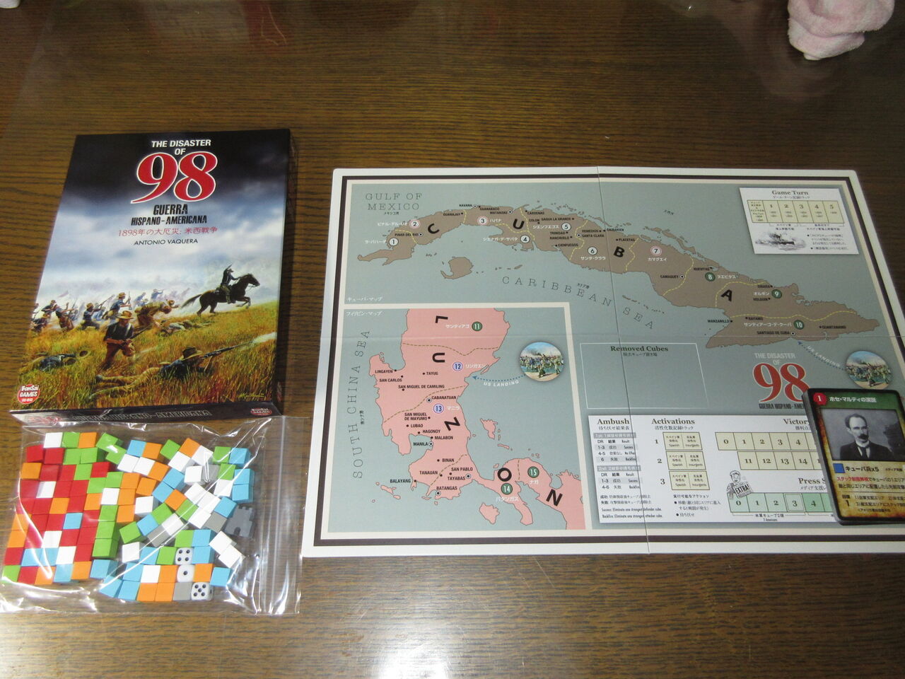 そのまま、流れに乗って、Bonsai Gamesのブースに。今回の本命のスコープシリーズは、なんと売り切れ。ならばと新作の「98」を購入。中黒さん曰く、米西戦争とテーマがテーマだけに売れにくいそうですが、「とってもいいゲームなんです」とのこと。そこへ、軍神殿と長野在住の(と名乗っている?)aoさんがいたので、あいさつを。