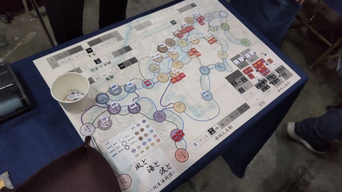 となりのレーンのジブセイル・ゲームに向かい、こちらも新作の「風と海と波と」を購入。テーマは、これまた、マイナー極まる藤原純友の乱!これまで、平将門はゲーム化されてきましたが、同時期に起こった純友の乱は、日本初(世界初)でしょう。さすが、攻めのジブセイルです。
